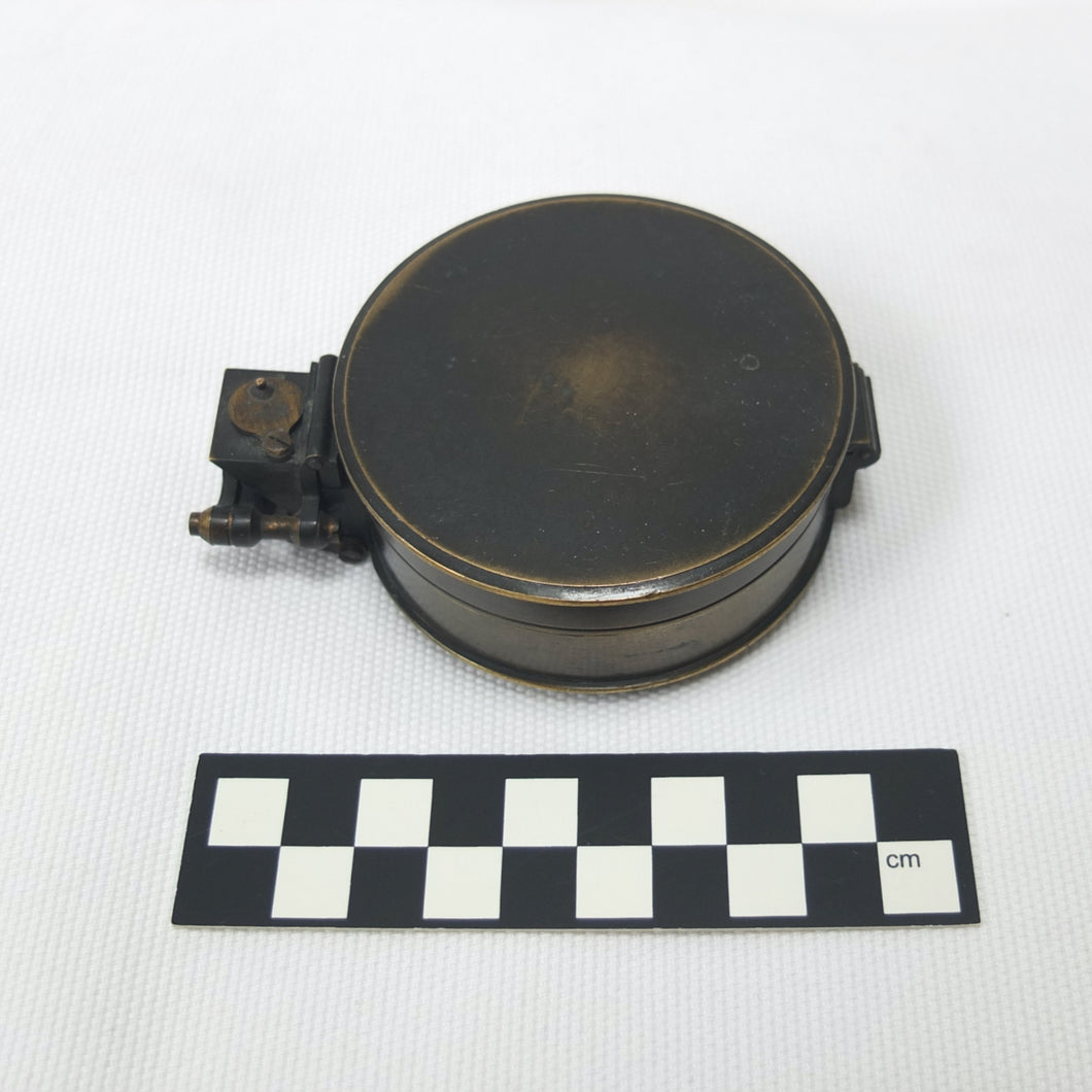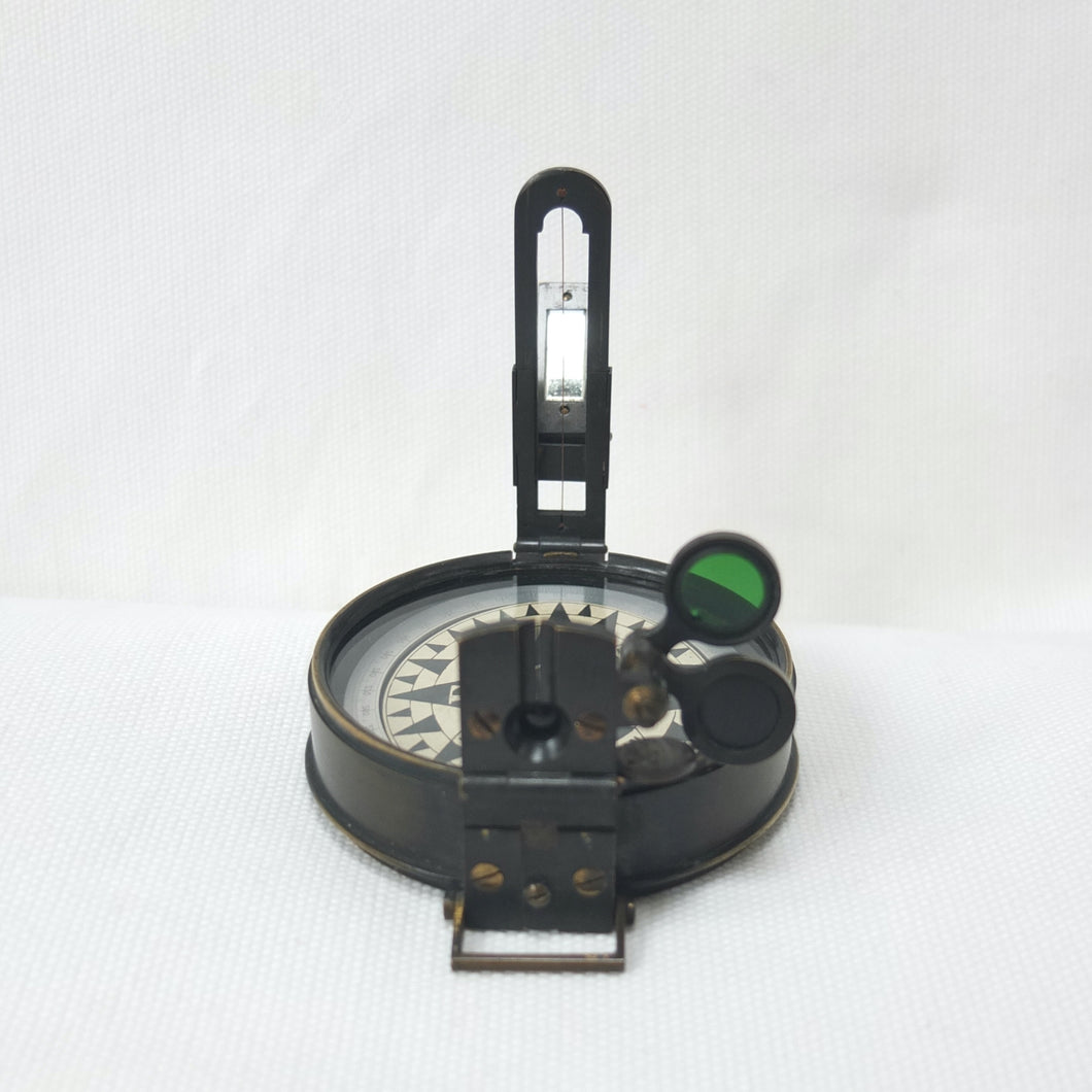 This type of compass design originated in the second half of the 19th century, and was a development of the Schmalcalder Patent types of the early 1800's. In 1861 W. F. Stanley patented a number of improvements in the use of aluminium in the manufacture of mathematical and scientific instruments, and he was one of the first to use the cutaway aluminium ring dial. Stanley's Surveying and Levelling Instruments (1895) included a description of this type of compass, and it was listed in many scientific instrument catalogues, including the J. H. Steward Military Instruments Catalogue (1901), the W. F. Stanley Catalogue (1912), and the Francis Barker catalogues of 1909 and 1926. The Barker catalogues described this type of compass as a 'Brass bronzed prismatic compass, with aluminium ring and card dial, Agate cap and stop'. The red and green filters or 'Azimuth Glasses' were optional extras.