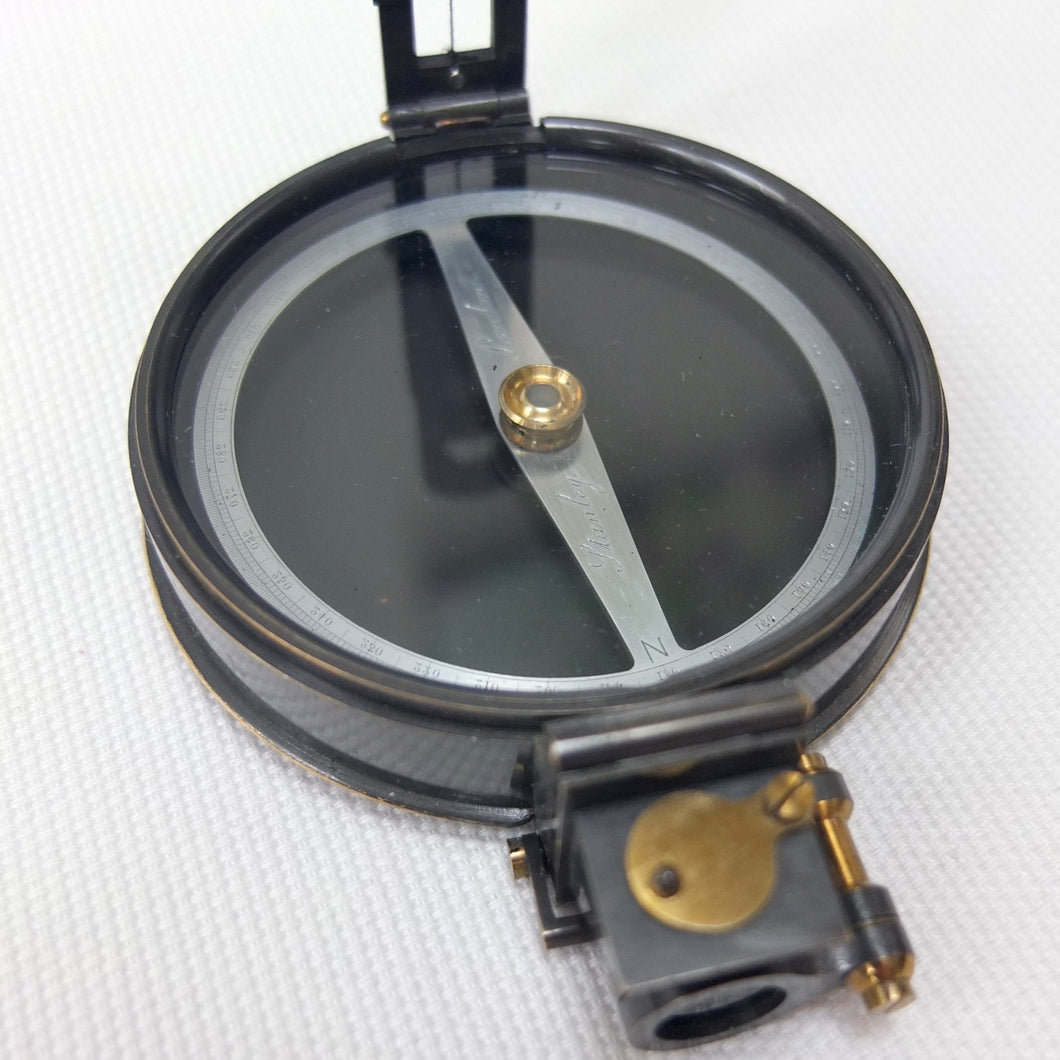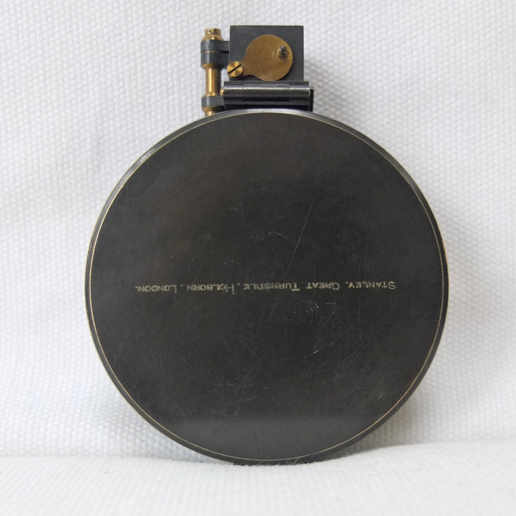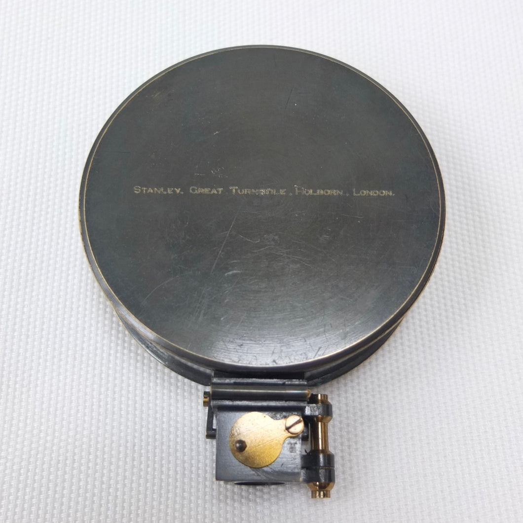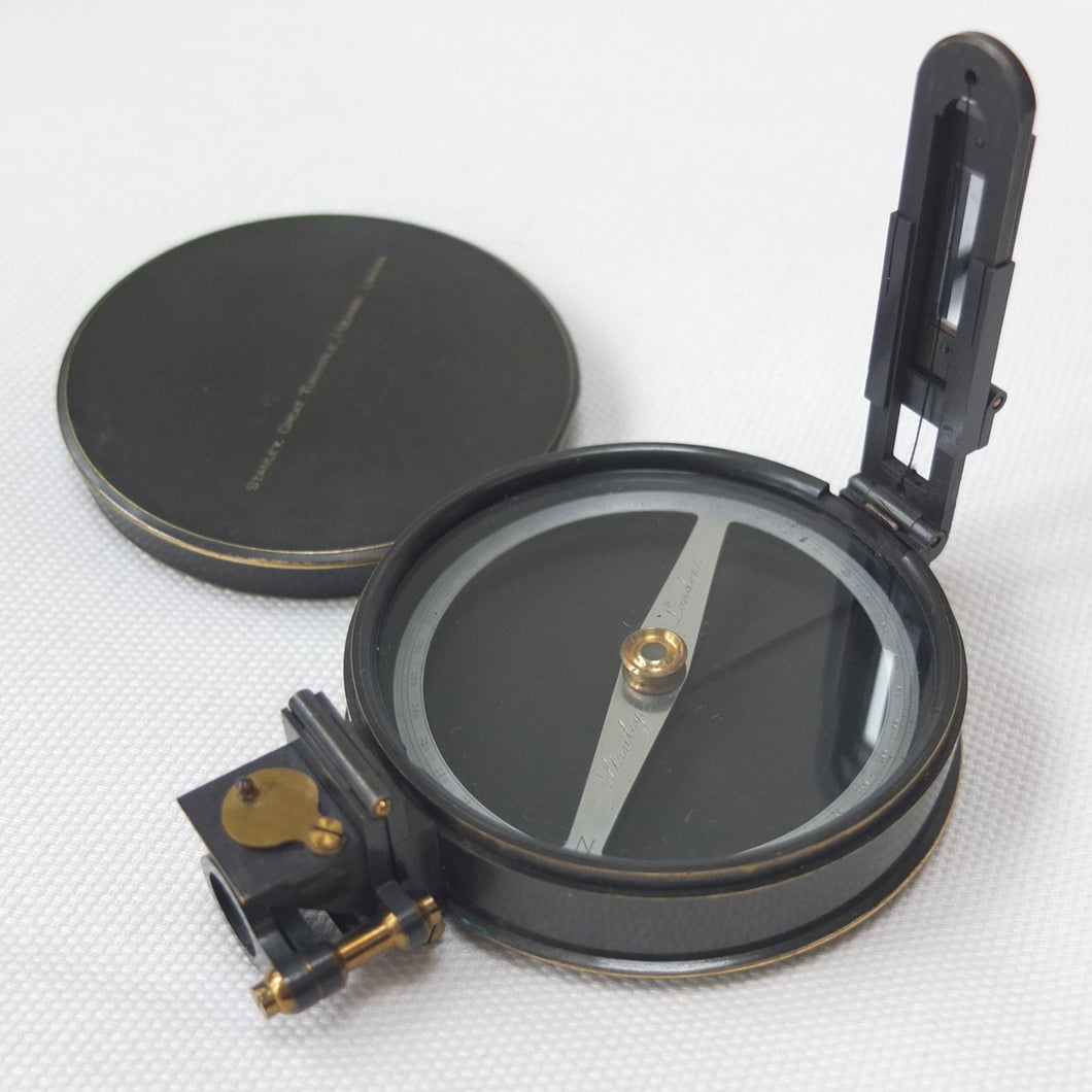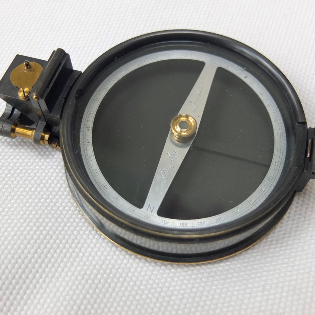 A very fine example of a W. F. Stanley prismatic survey or artillery compass, dating from c.1880. This compass is in excellent condition, featuring a blackened or oxidised finish brass case with a beautifully engraved aluminium compass card. In 1861 W. F. Stanley patented a number of improvements in the use of aluminium in the manufacture of mathematical and scientific instruments. He was one of the first to produce this type of cutaway aluminium compass card. The compass has a transit lock operated when the sights are folded down, and red and green coloured filters at the prism. It is signed on the lid by 'Stanley, Great Turnstile, Holborn, London', and is also signed on the compass card 'Stanley, London'. This type of compass was often used for military survey and artillery work.