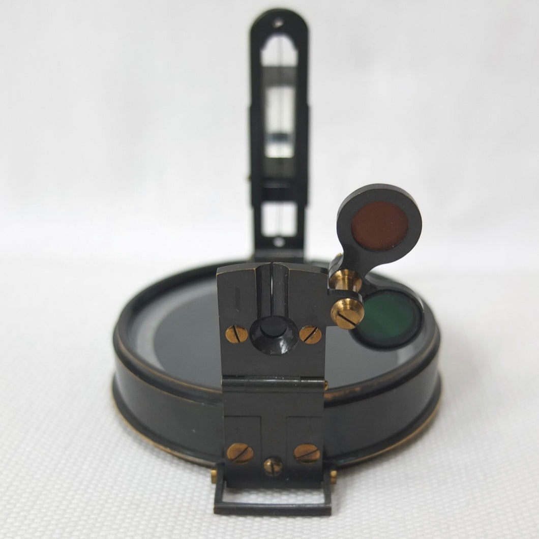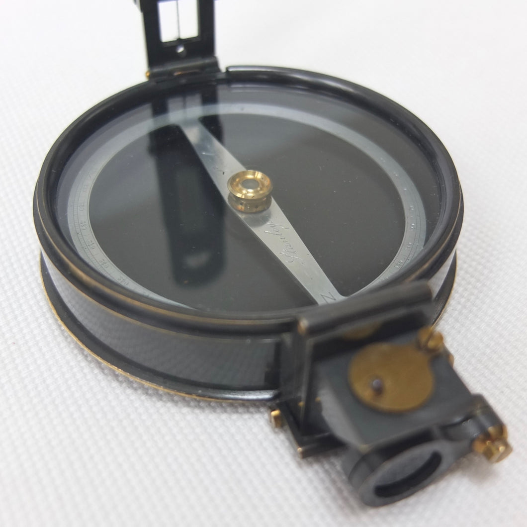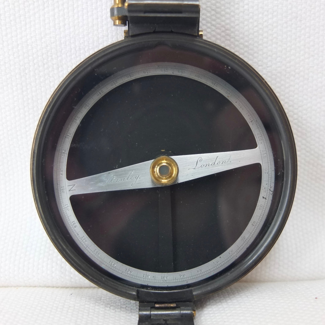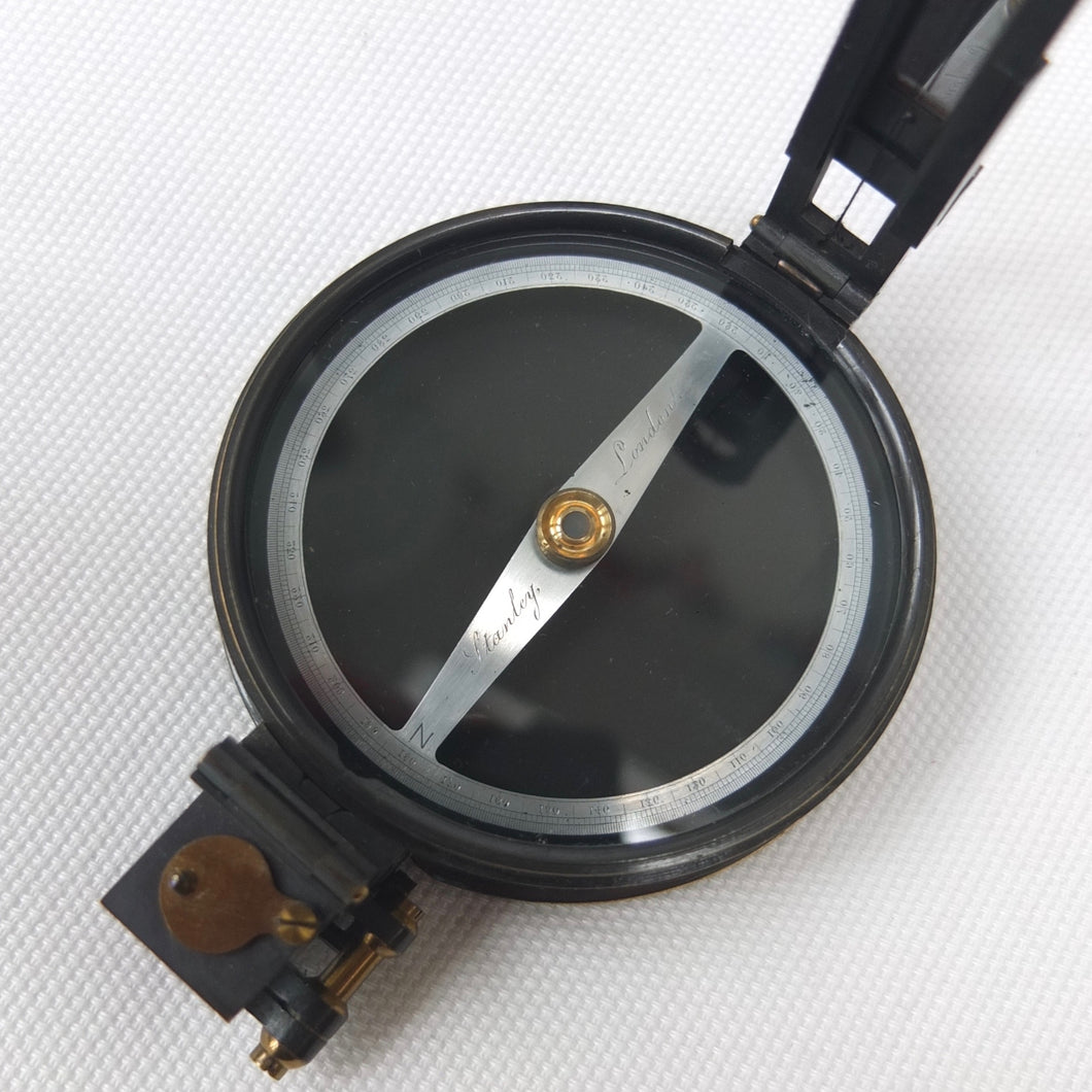 A very fine example of a W. F. Stanley prismatic survey or artillery compass, dating from c.1880. This compass is in excellent condition, featuring a blackened or oxidised finish brass case with a beautifully engraved aluminium compass card. In 1861 W. F. Stanley patented a number of improvements in the use of aluminium in the manufacture of mathematical and scientific instruments. He was one of the first to produce this type of cutaway aluminium compass card. The compass has a transit lock operated when the sights are folded down, and red and green coloured filters at the prism. It is signed on the lid by 'Stanley, Great Turnstile, Holborn, London', and is also signed on the compass card 'Stanley, London'. This type of compass was often used for military survey and artillery work.