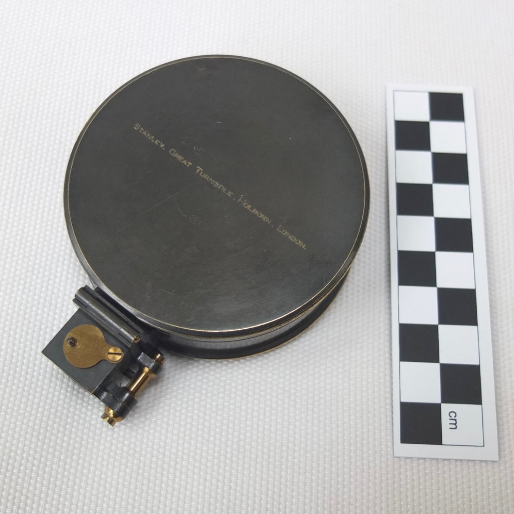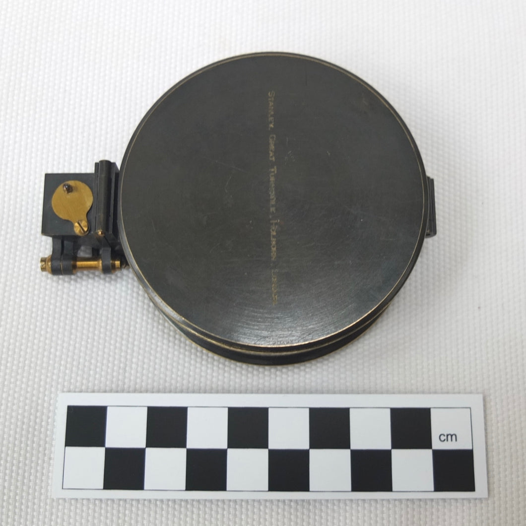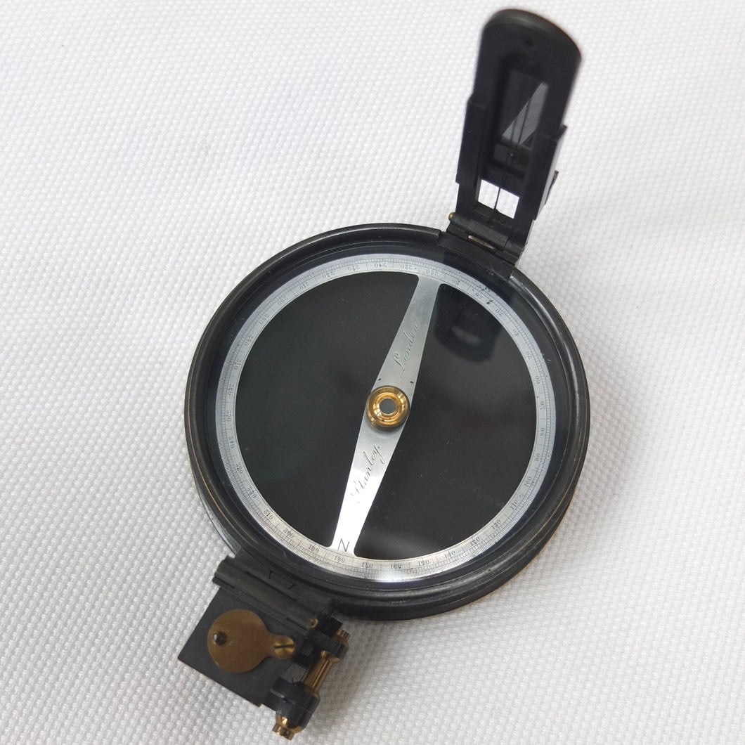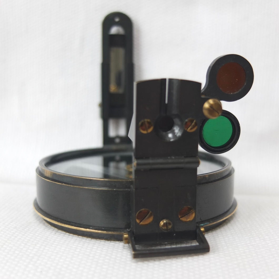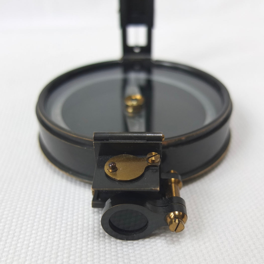 A very fine example of a W. F. Stanley prismatic survey or artillery compass, dating from c.1880. This compass is in excellent condition, featuring a blackened or oxidised finish brass case with a beautifully engraved aluminium compass card. In 1861 W. F. Stanley patented a number of improvements in the use of aluminium in the manufacture of mathematical and scientific instruments. He was one of the first to produce this type of cutaway aluminium compass card. The compass has a transit lock operated when the sights are folded down, and red and green coloured filters at the prism. It is signed on the lid by 'Stanley, Great Turnstile, Holborn, London', and is also signed on the compass card 'Stanley, London'. This type of compass was often used for military survey and artillery work.