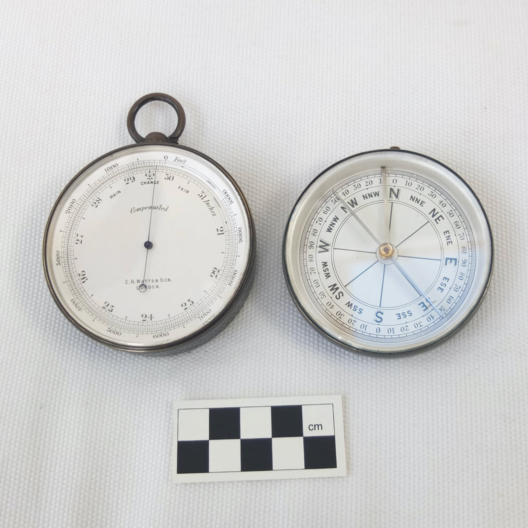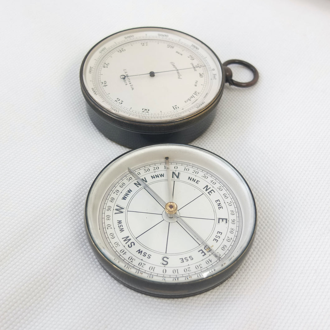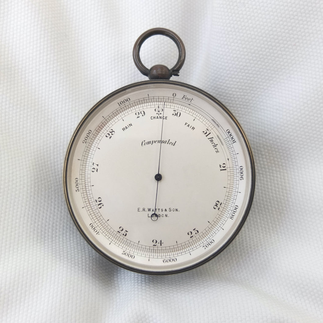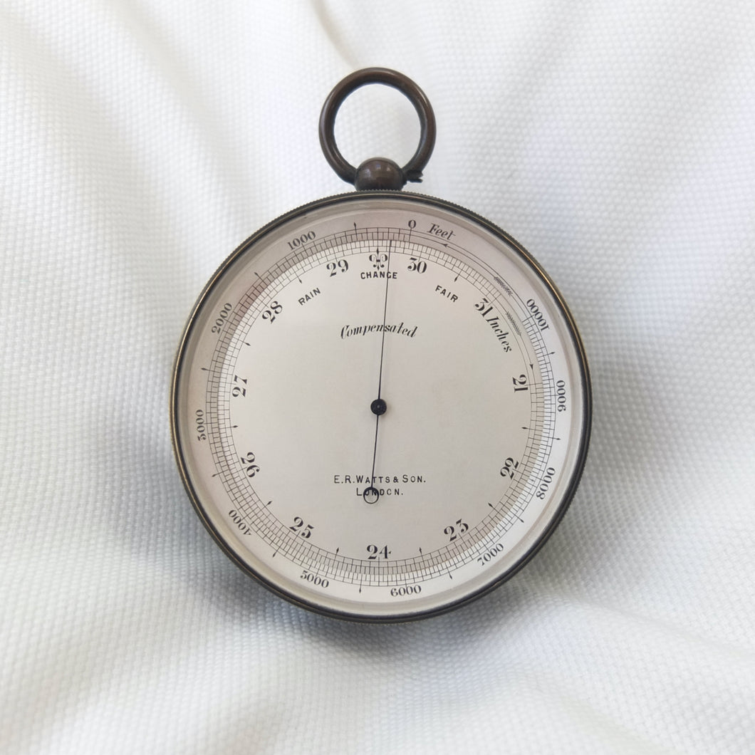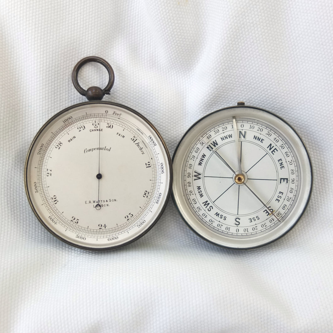 A rare E. R. Watts & Son barometer compass combination instrument, dating from 1903. The 1910 edition of the Watts catalogue listed several types of barometer/compass combinations, 'All of the very best quality'. Most of these featured Singer's Patent type compasses, but the company also offered to quote for 'All kinds of Aneroid Barometers not included in the list'. According to the catalogue, all their instruments were 'Manufactured entirely at our London works. They are of the finest materials and workmanship, the highest possible finish, and of guaranteed accuracy'.