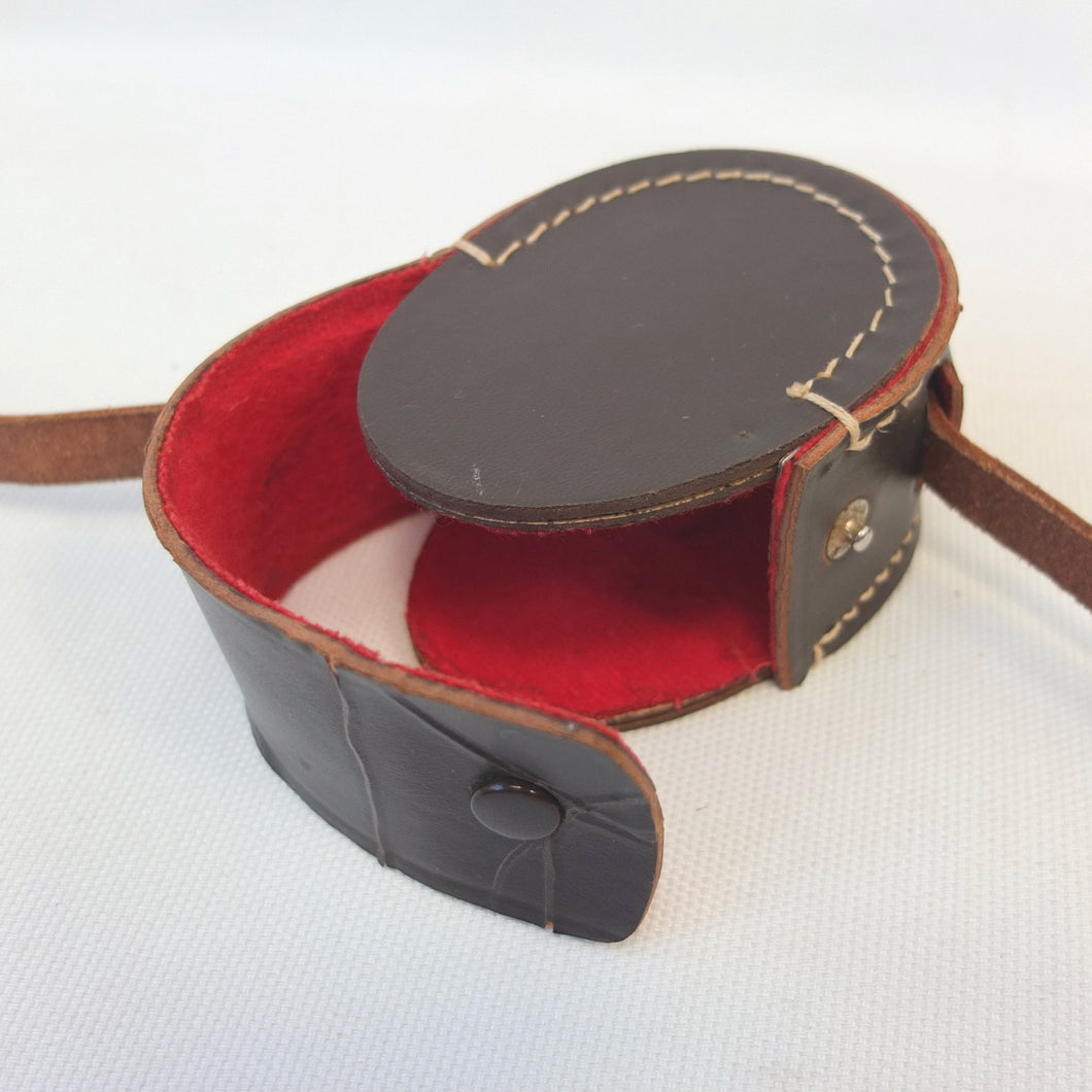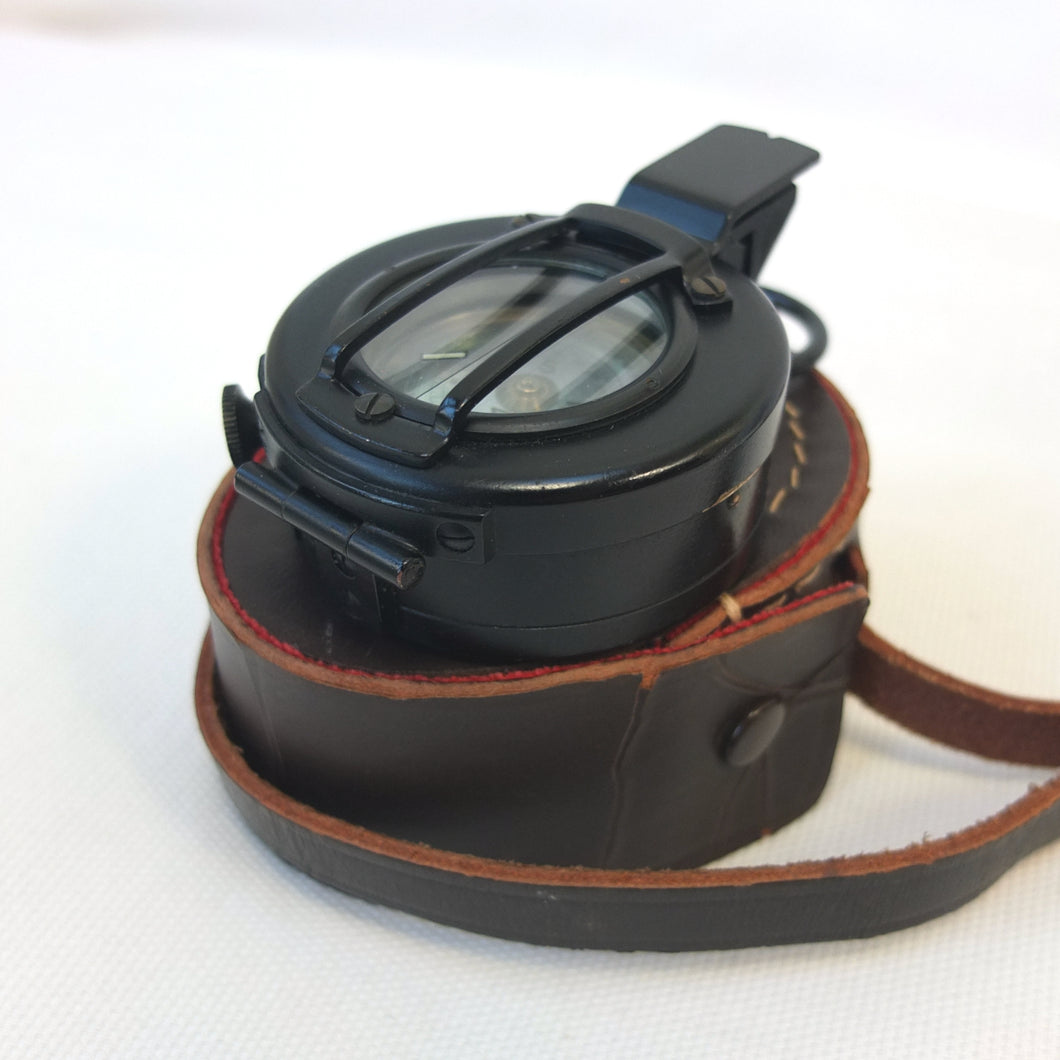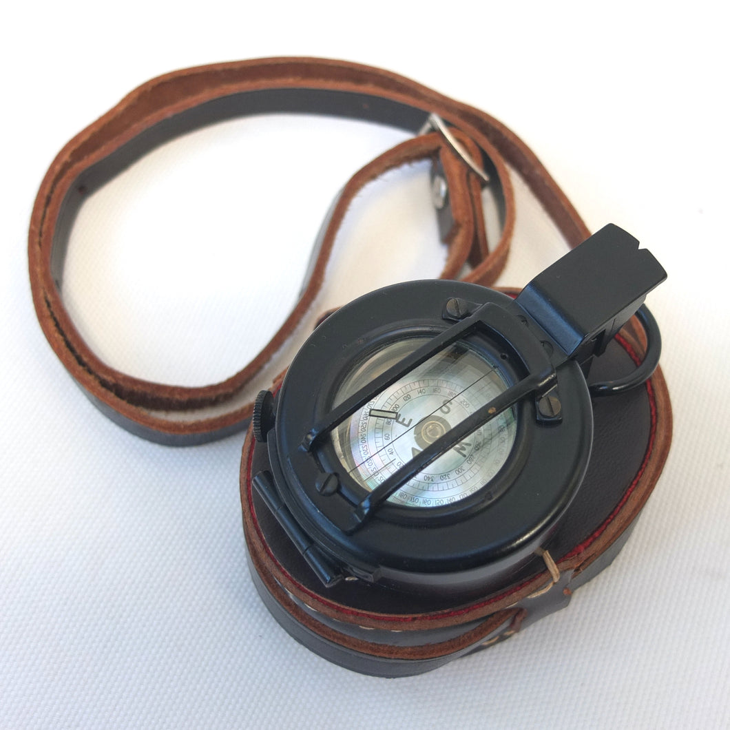 In very good condition, full working order, and finds North very well. There are just minor signs of use, and some slight wear to the paint finish. The mother of pearl card is in very good condition. The prism, index glass, and lid window are in very good condition. The luminous paint markers are working very well, making the compass suitable for use in total darkness, as originally intended. The original fitted leather case and shoulder strap are in very good condition.