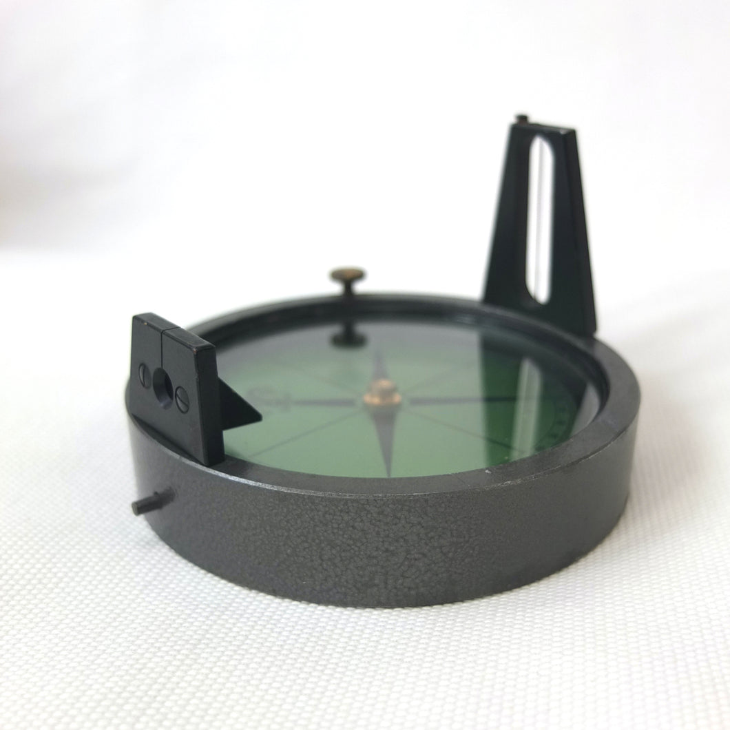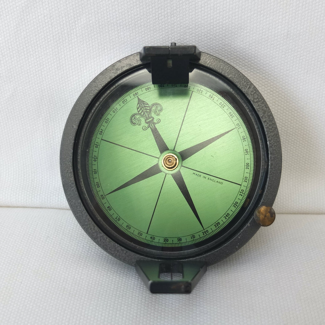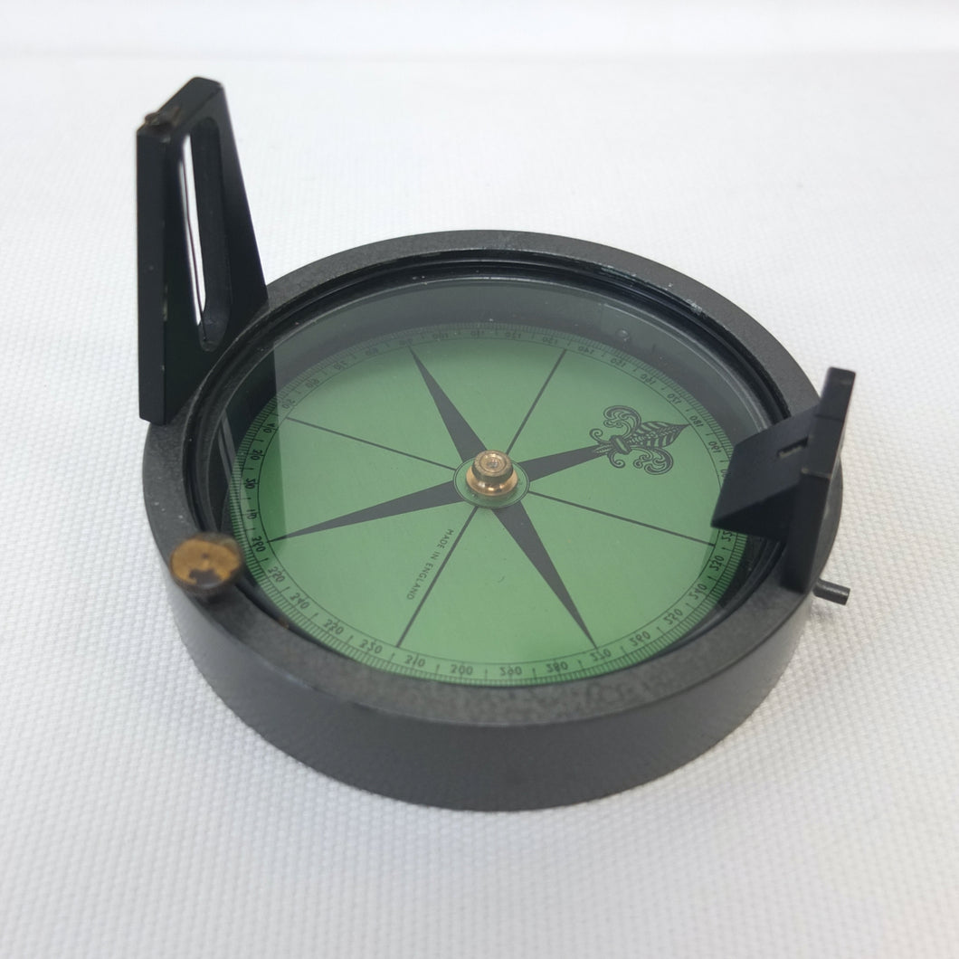 A Francis Barker prismatic compass, dating from c.1980. This compass was listed as product No. 1404 in the 1982 edition of the Francis Barker catalogue. It was described as having an 'enamel finish aluminium alloy case, with adjustable prism for focusing'. The compass has a jewelled pivot, screw-down transit lock, manual brake, height adjustable prism and sight, aluminium case, and aluminium compass card. This type of compass was first produced by Barker in the late 19th century. Although there are no maker's marks, this compass is similar to the early Barker versions, with the major differences being that the 19th century ones had a paper compass card rather than the aluminium card found in this model, and a wooden case. Details of Francis Barker compasses can be found in Paul Crespel's excellent book Trade mark London, available as a PDF at trademarklondon.com.