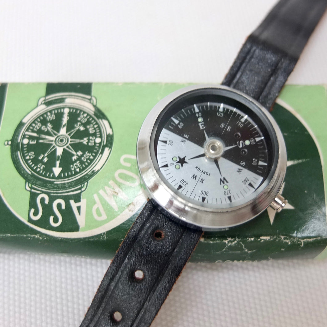 The compass is in excellent, almost 'as new' condition and finds North very well. The transit lock is working and the luminous paint markers still glow in the dark. The leather strap is in very good condition, and looks as though it has never been used. The cardboard box is a little worn, but still in good condition.
