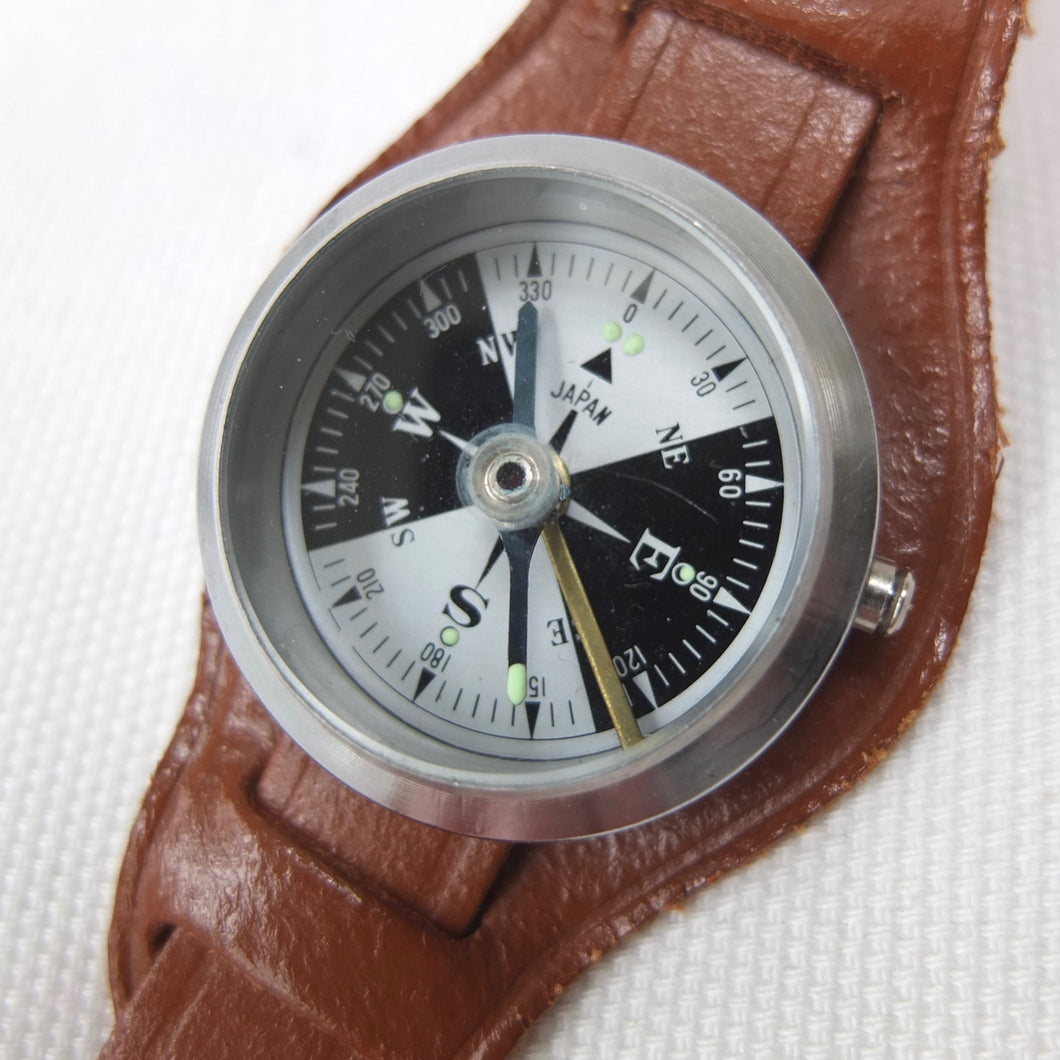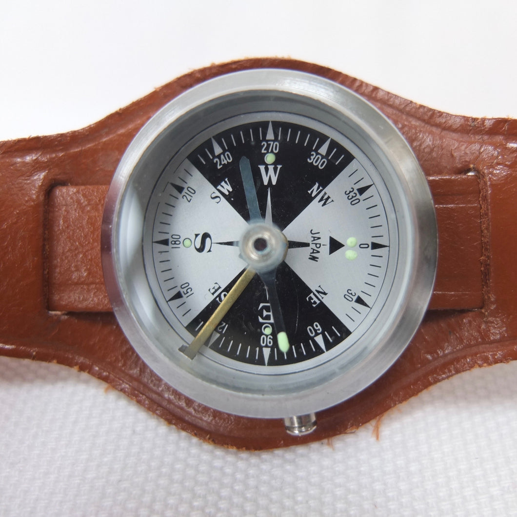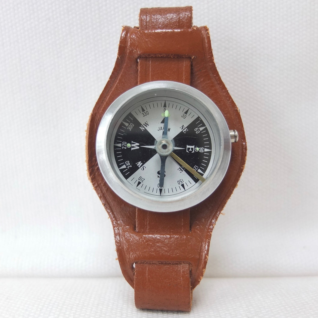 A very good example of a vintage Japanese wrist compass, dating from the mid 20th century, and probably made in the 1950's or 1960's. It features luminous paint marker dots and a manual transit lock. With a card design clearly influenced by the Singer's patent designs of the 1860's. The compass has a nickel plated case, blued needle with luminous north marker, and luminous paint dots at the cardinal points. The transit lock is operated by a button on the side of the case. Complete with original leather strap and box, marked with the serial number '210'.
