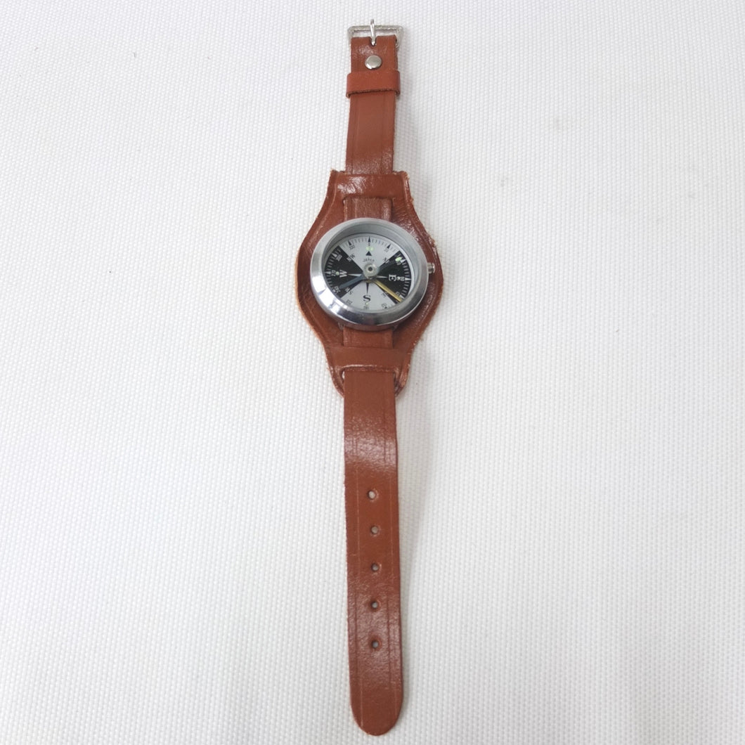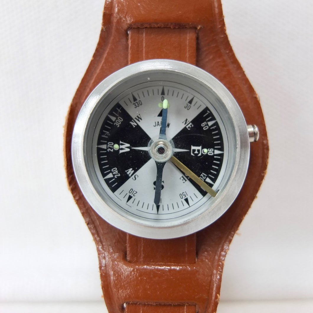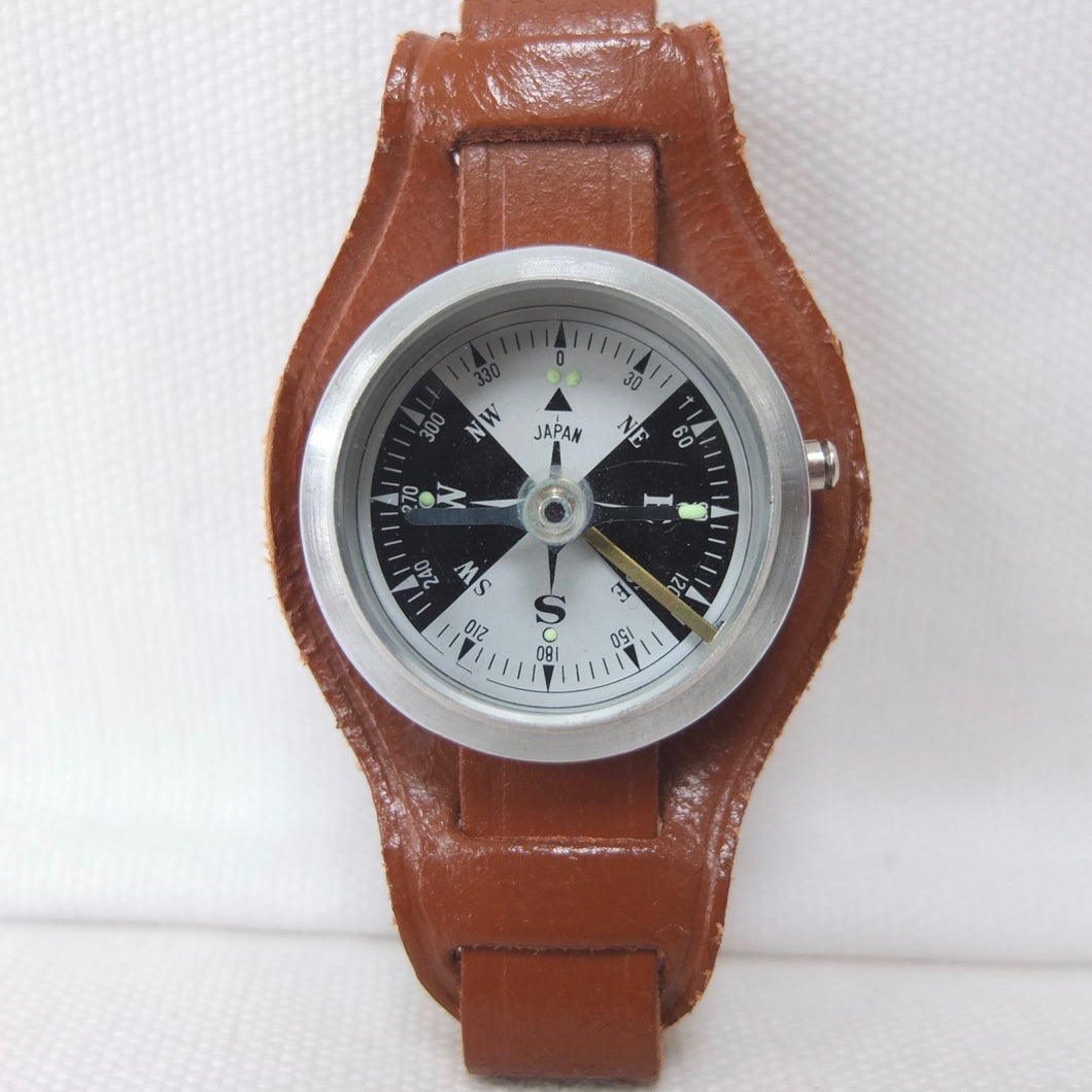 A very good example of a vintage Japanese wrist compass, dating from the mid 20th century, and probably made in the 1950's or 1960's. It features luminous paint marker dots and a manual transit lock. With a card design clearly influenced by the Singer's patent designs of the 1860's. The compass has a nickel plated case, blued needle with luminous north marker, and luminous paint dots at the cardinal points. The transit lock is operated by a button on the side of the case. Complete with original leather strap and box, marked with the serial number '210'.