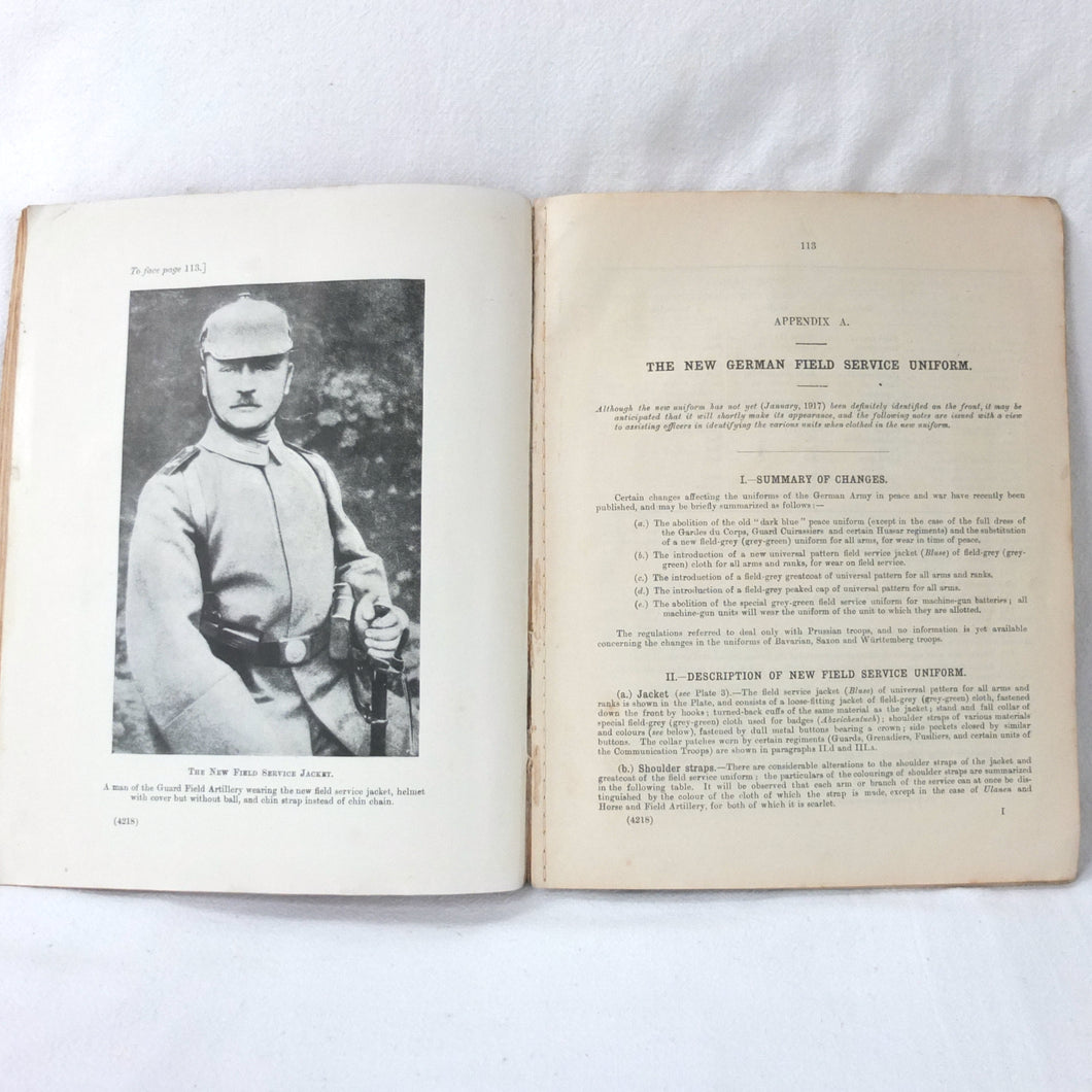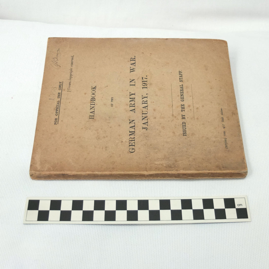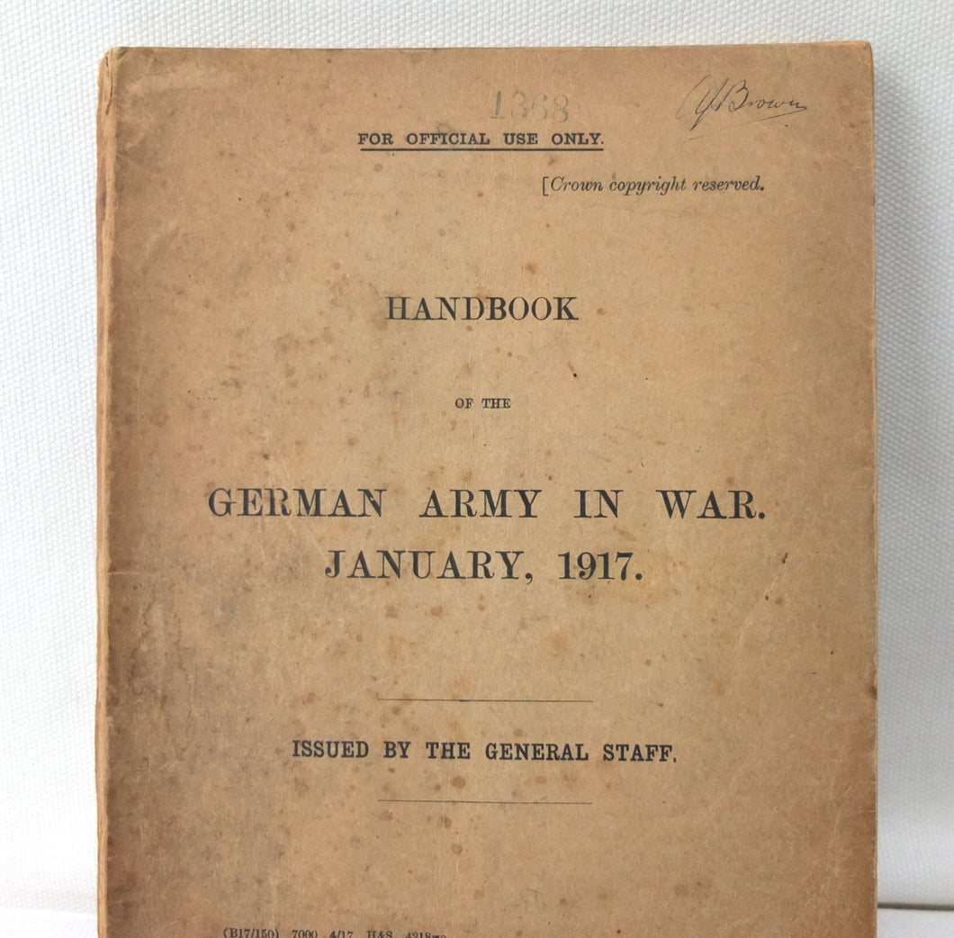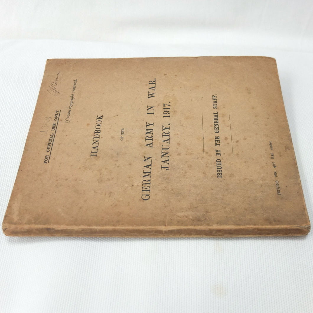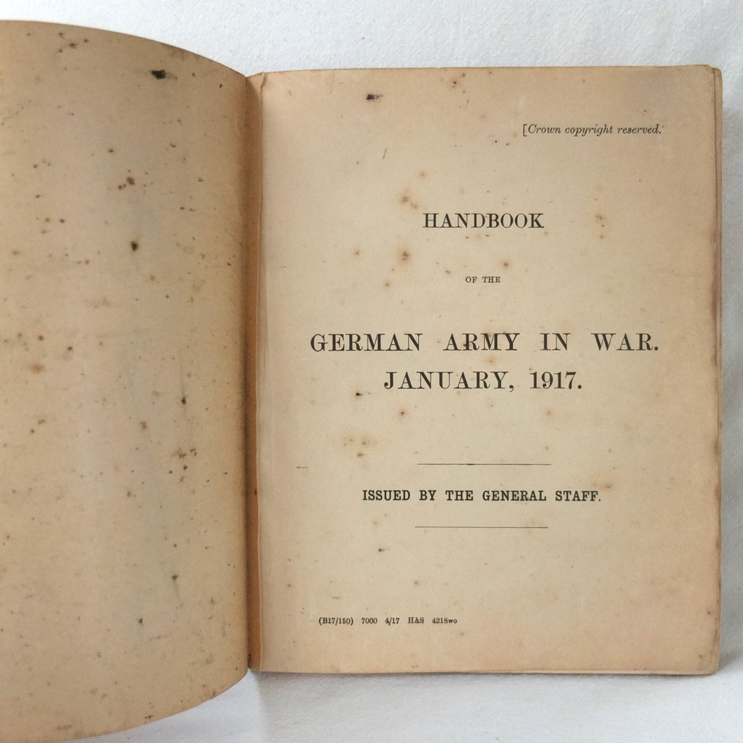 A very rare 1917 edition of Handbook of the German Army in War, a British Army General Staff manual, published by the War Office during the First World War. The handbook is a detailed survey of the units, organisation, personnel, weapons, and equipment of the Imperial German Army. Subjects covered include: Recruiting, Officers and NCOs, Staff and High Command, Infantry, Machine Guns and Automatic Rifles, Cavalry, Artillery, Field Guns, Howitzers, Trench Artillery, Ammunition Supply, Technical Troops, Air Service, Medical Services, Landsturm Units, Uniforms and Equipment. Illustrated with charts, photographs and line drawings