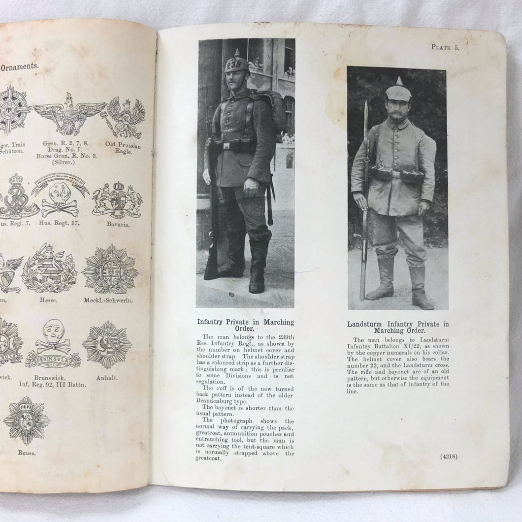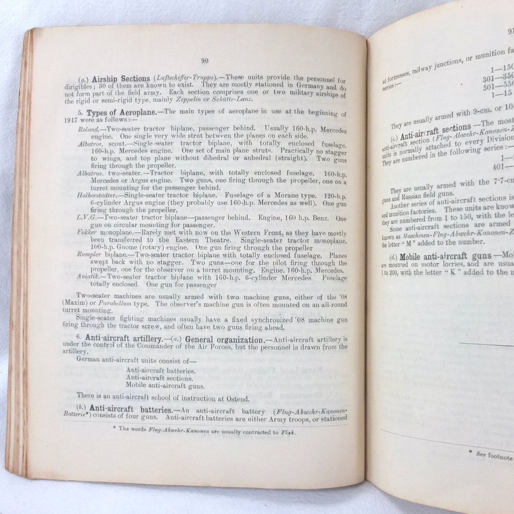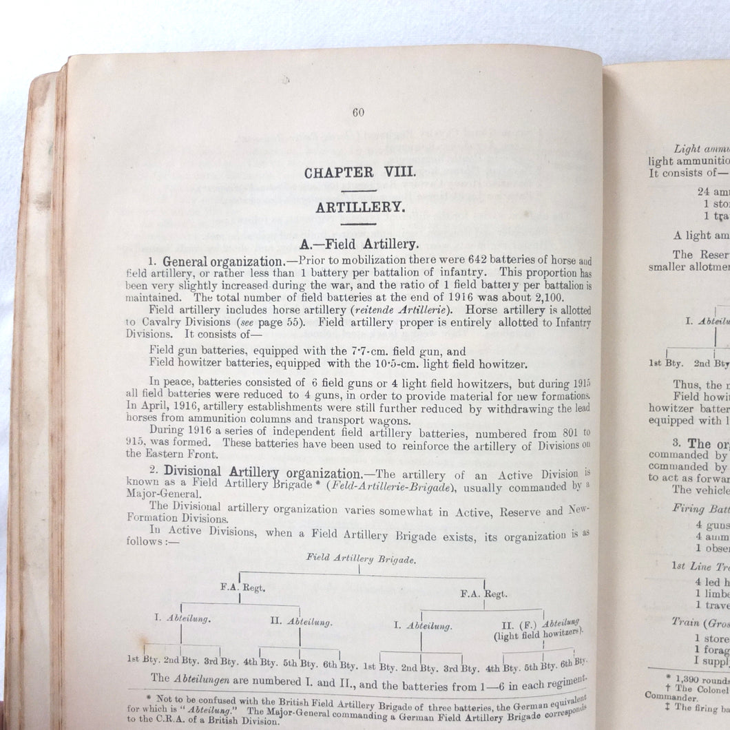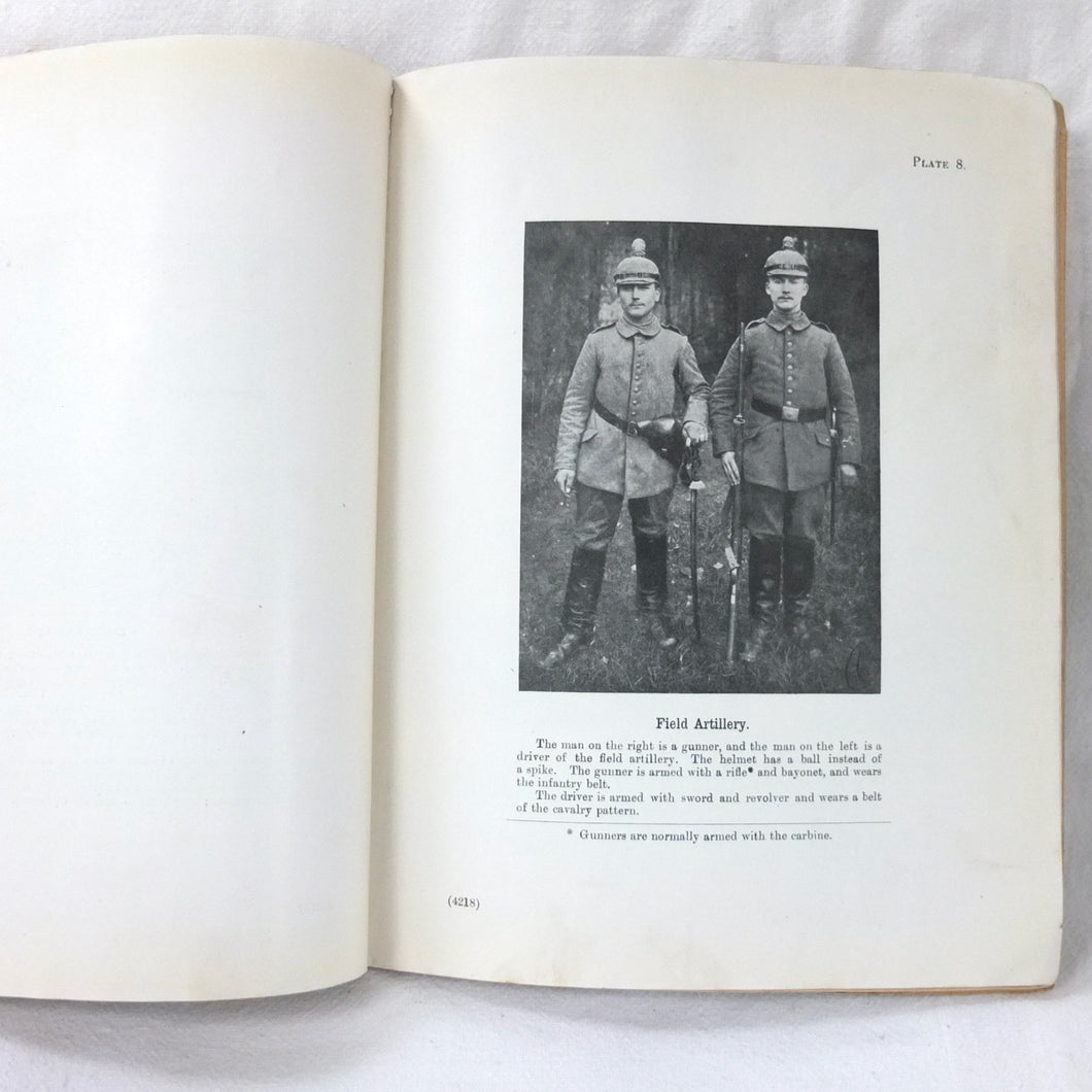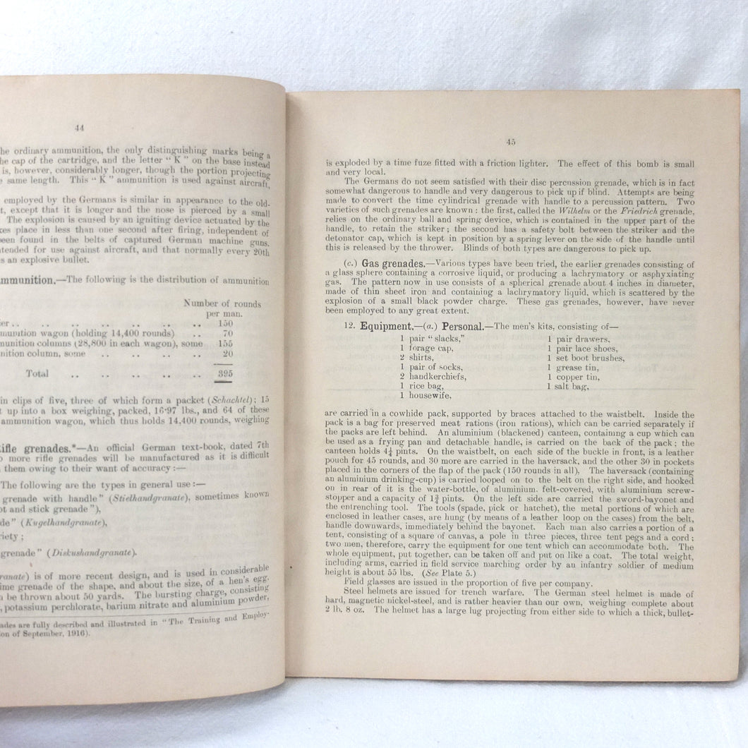 A very rare 1917 edition of Handbook of the German Army in War, a British Army General Staff manual, published by the War Office during the First World War. The handbook is a detailed survey of the units, organisation, personnel, weapons, and equipment of the Imperial German Army. Subjects covered include: Recruiting, Officers and NCOs, Staff and High Command, Infantry, Machine Guns and Automatic Rifles, Cavalry, Artillery, Field Guns, Howitzers, Trench Artillery, Ammunition Supply, Technical Troops, Air Service, Medical Services, Landsturm Units, Uniforms and Equipment. Illustrated with charts, photographs and line drawings