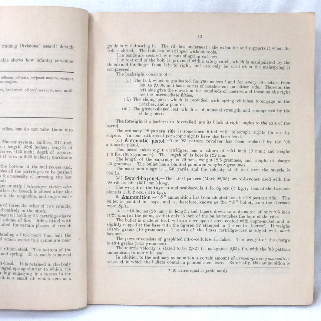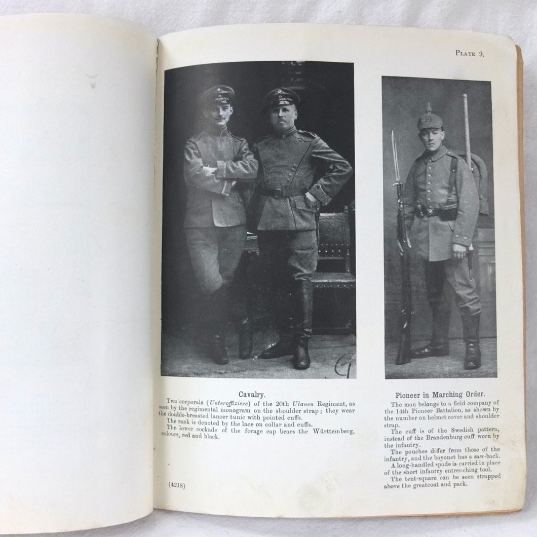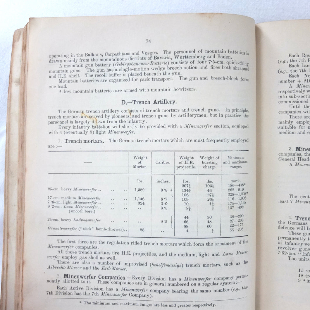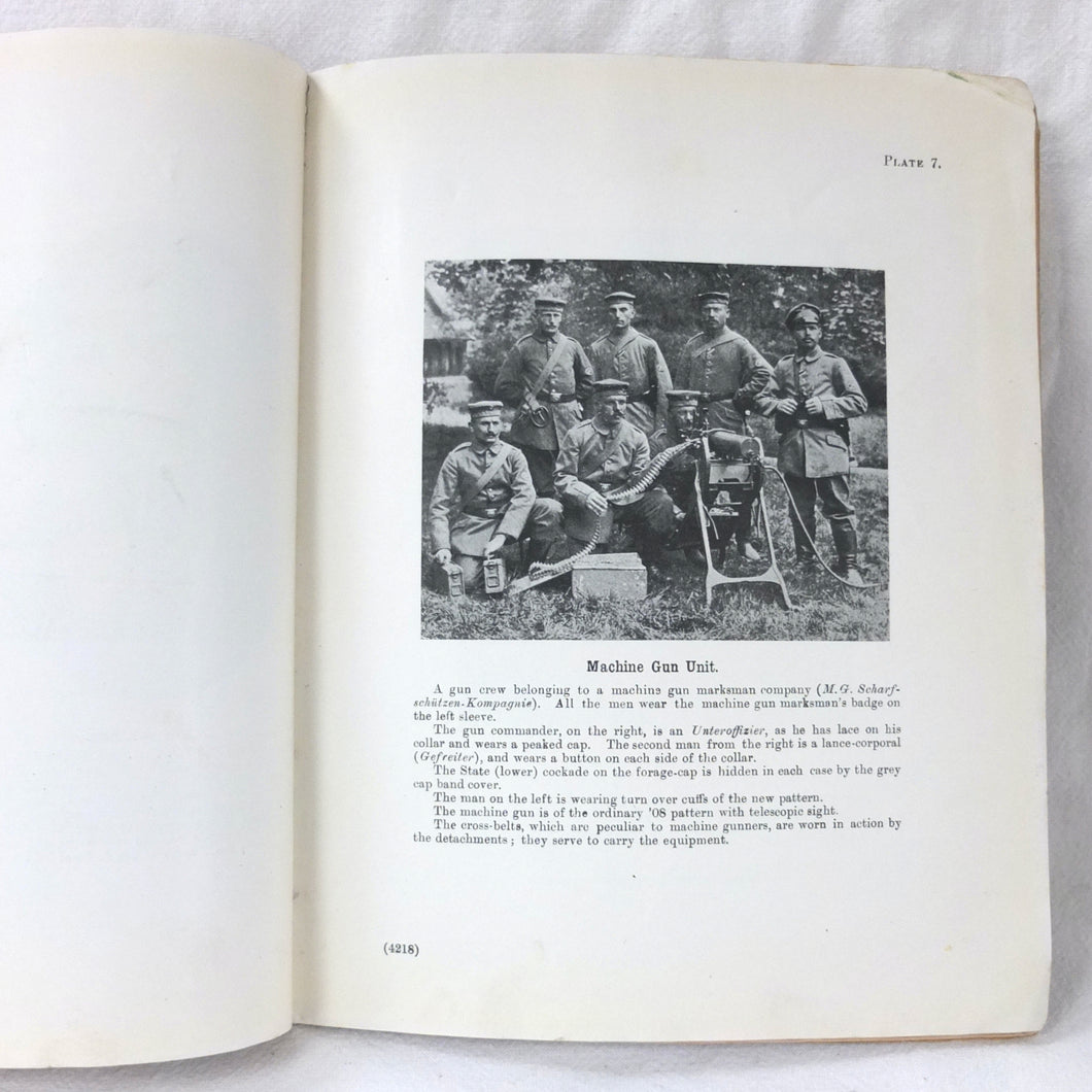 A very rare 1917 edition of Handbook of the German Army in War, a British Army General Staff manual, published by the War Office during the First World War. The handbook is a detailed survey of the units, organisation, personnel, weapons, and equipment of the Imperial German Army. Subjects covered include: Recruiting, Officers and NCOs, Staff and High Command, Infantry, Machine Guns and Automatic Rifles, Cavalry, Artillery, Field Guns, Howitzers, Trench Artillery, Ammunition Supply, Technical Troops, Air Service, Medical Services, Landsturm Units, Uniforms and Equipment. Illustrated with charts, photographs and line drawings