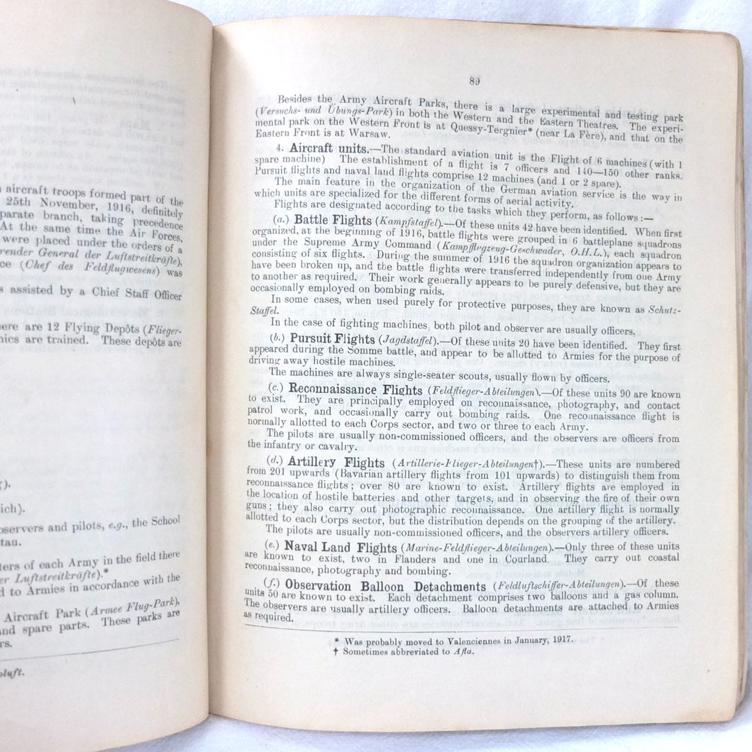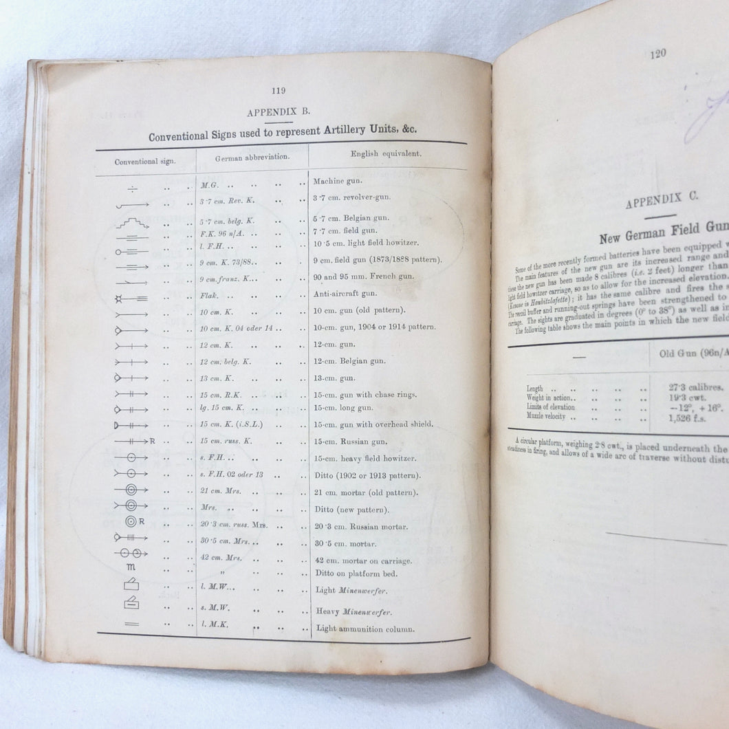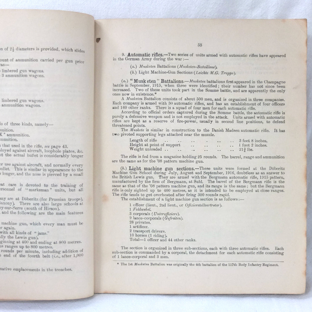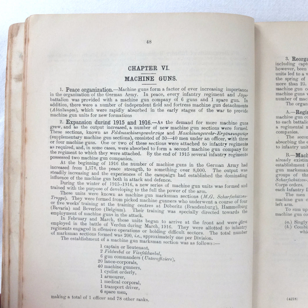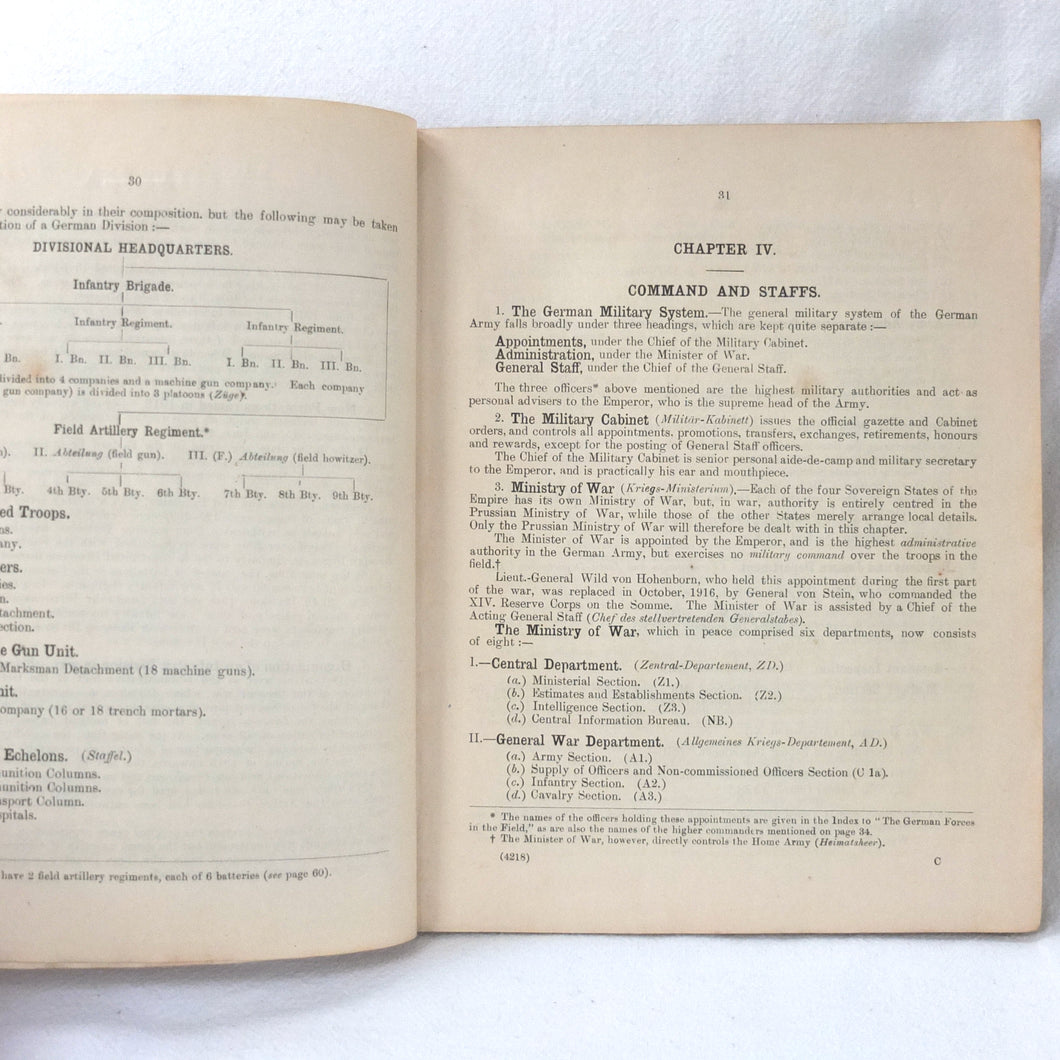 A very rare 1917 edition of Handbook of the German Army in War, a British Army General Staff manual, published by the War Office during the First World War. The handbook is a detailed survey of the units, organisation, personnel, weapons, and equipment of the Imperial German Army. Subjects covered include: Recruiting, Officers and NCOs, Staff and High Command, Infantry, Machine Guns and Automatic Rifles, Cavalry, Artillery, Field Guns, Howitzers, Trench Artillery, Ammunition Supply, Technical Troops, Air Service, Medical Services, Landsturm Units, Uniforms and Equipment. Illustrated with charts, photographs and line drawings
