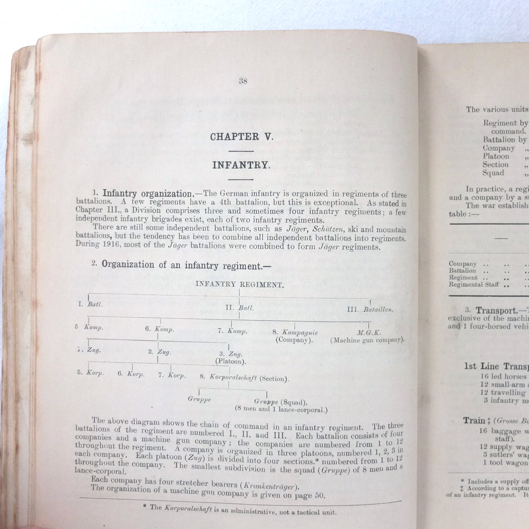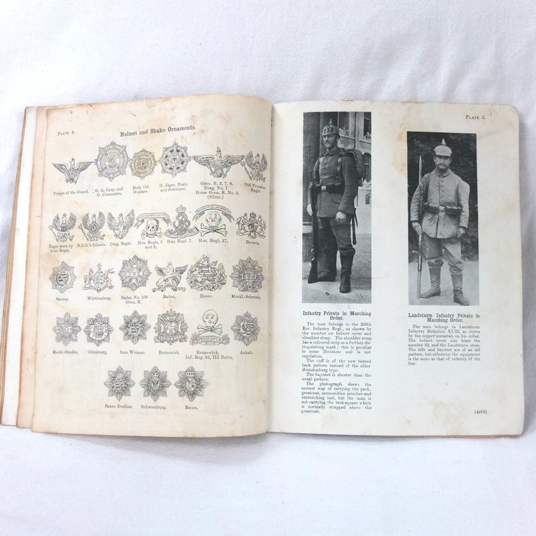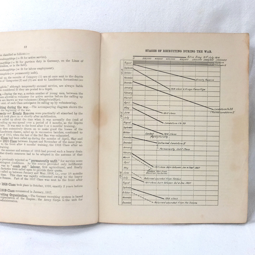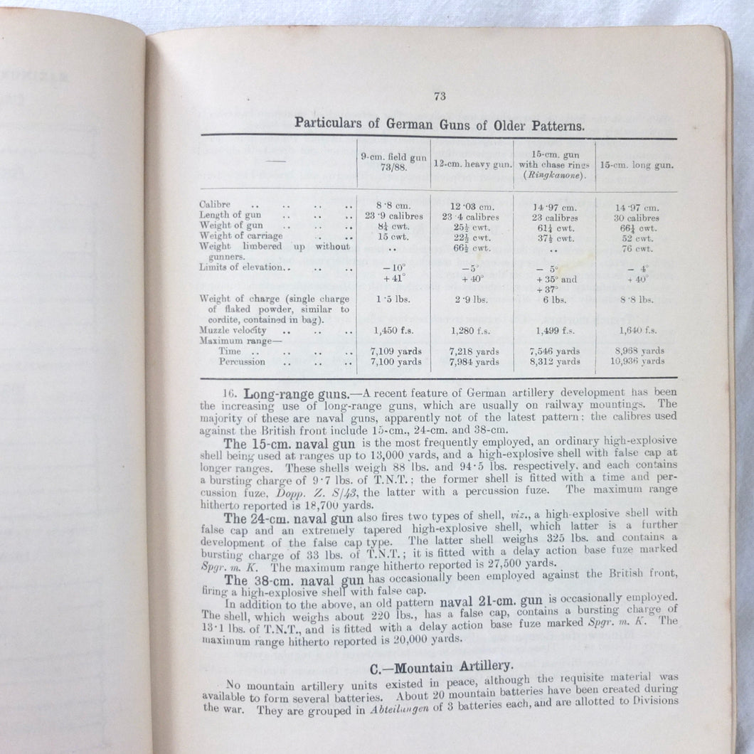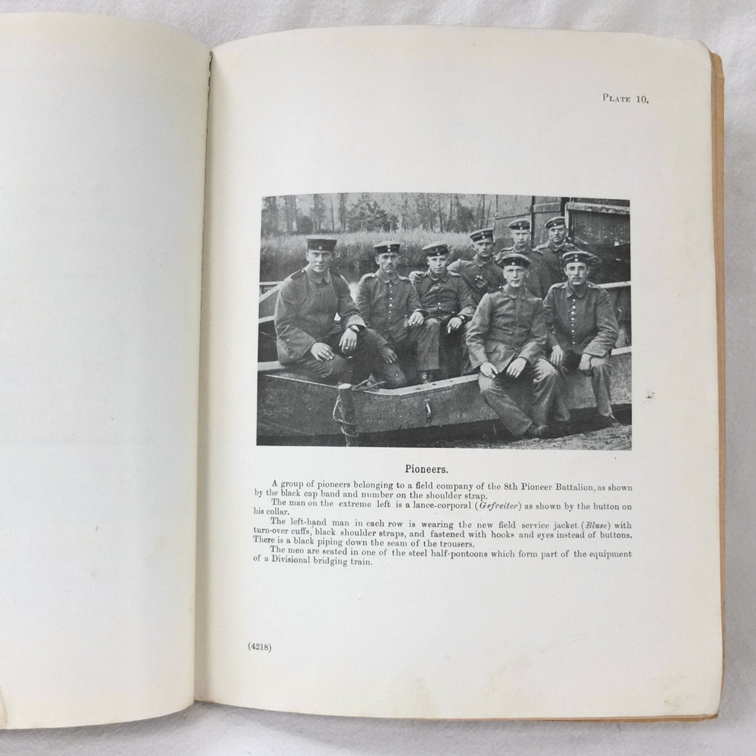 A very rare 1917 edition of Handbook of the German Army in War, a British Army General Staff manual, published by the War Office during the First World War. The handbook is a detailed survey of the units, organisation, personnel, weapons, and equipment of the Imperial German Army. Subjects covered include: Recruiting, Officers and NCOs, Staff and High Command, Infantry, Machine Guns and Automatic Rifles, Cavalry, Artillery, Field Guns, Howitzers, Trench Artillery, Ammunition Supply, Technical Troops, Air Service, Medical Services, Landsturm Units, Uniforms and Equipment. Illustrated with charts, photographs and line drawings