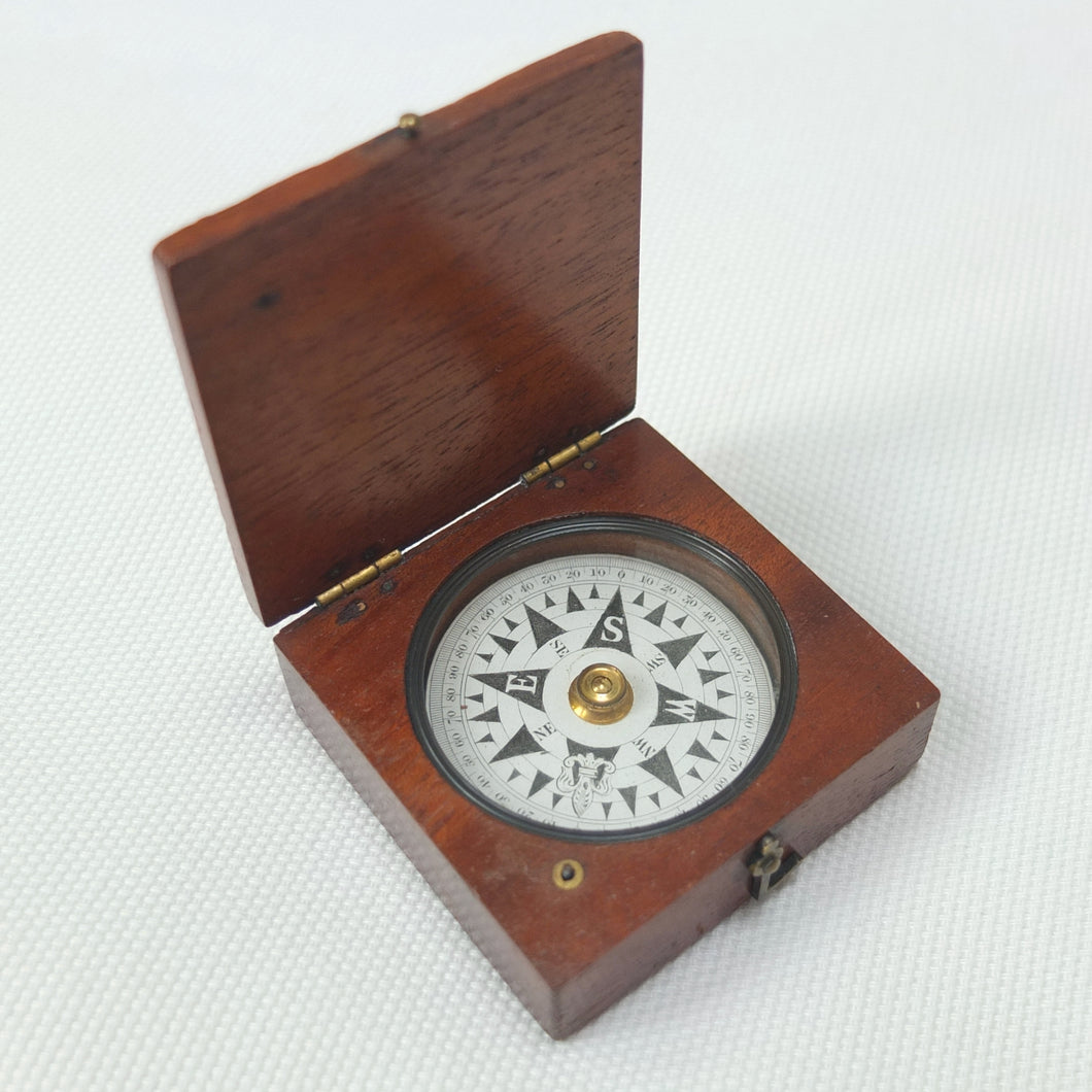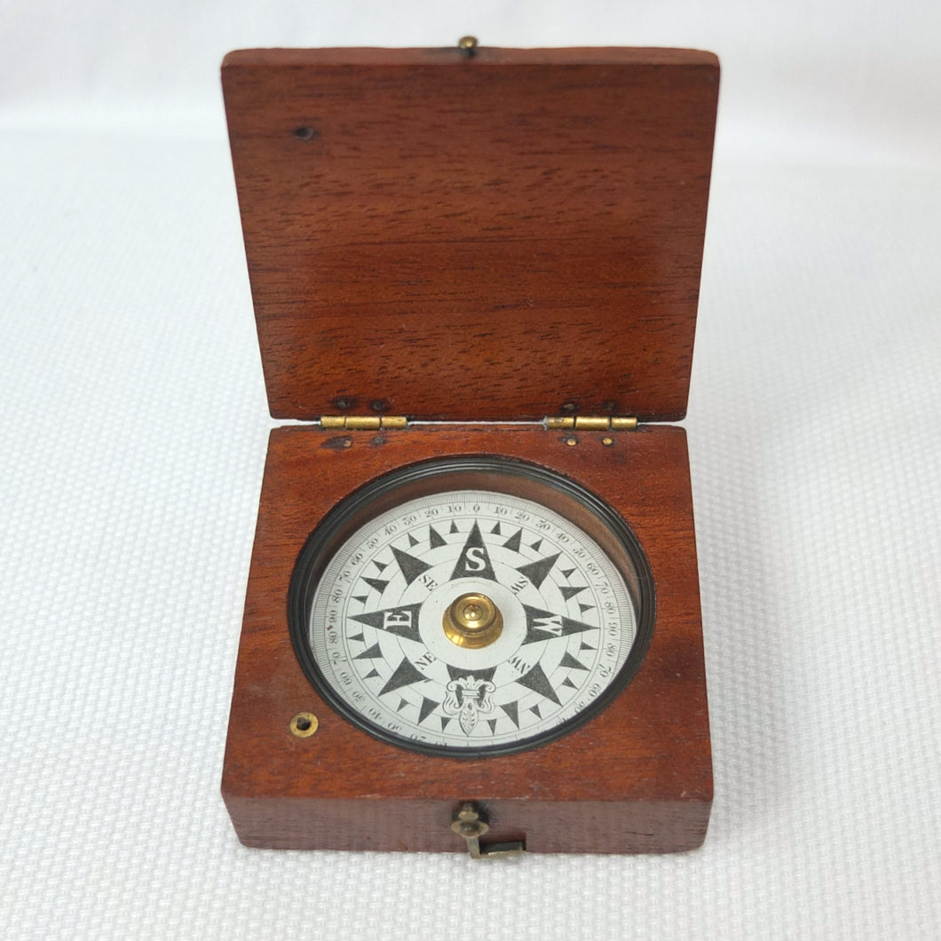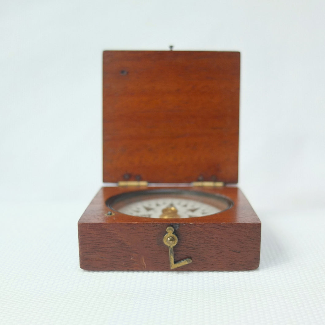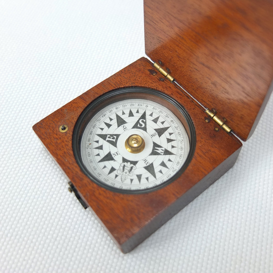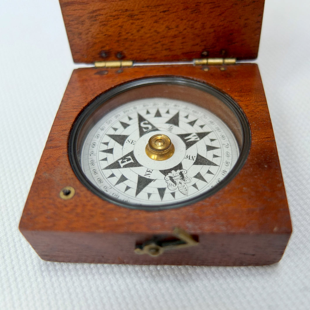 In very good condition and full working order. It finds north very well. The hand-drawn compass card is in very good condition. There is a transit lock operated by a small pin which locks the needle when the lid is closed. The wooden case is in very good condition, with a lovely patina, strong hinges and '7' shaped clasp.