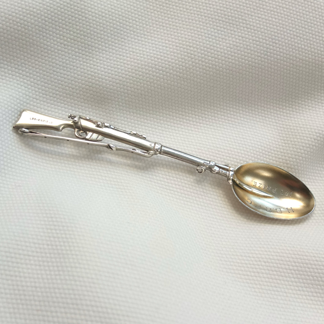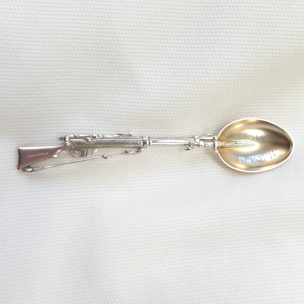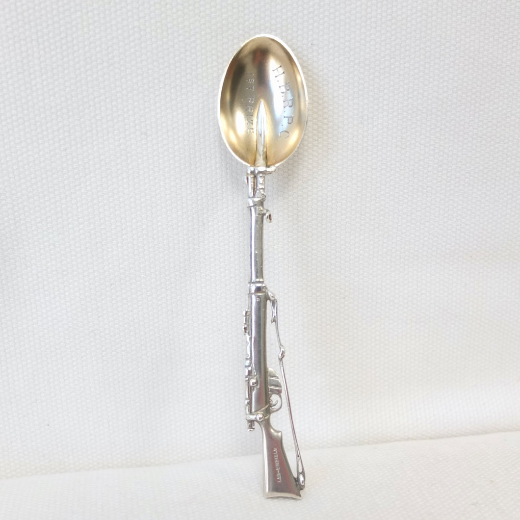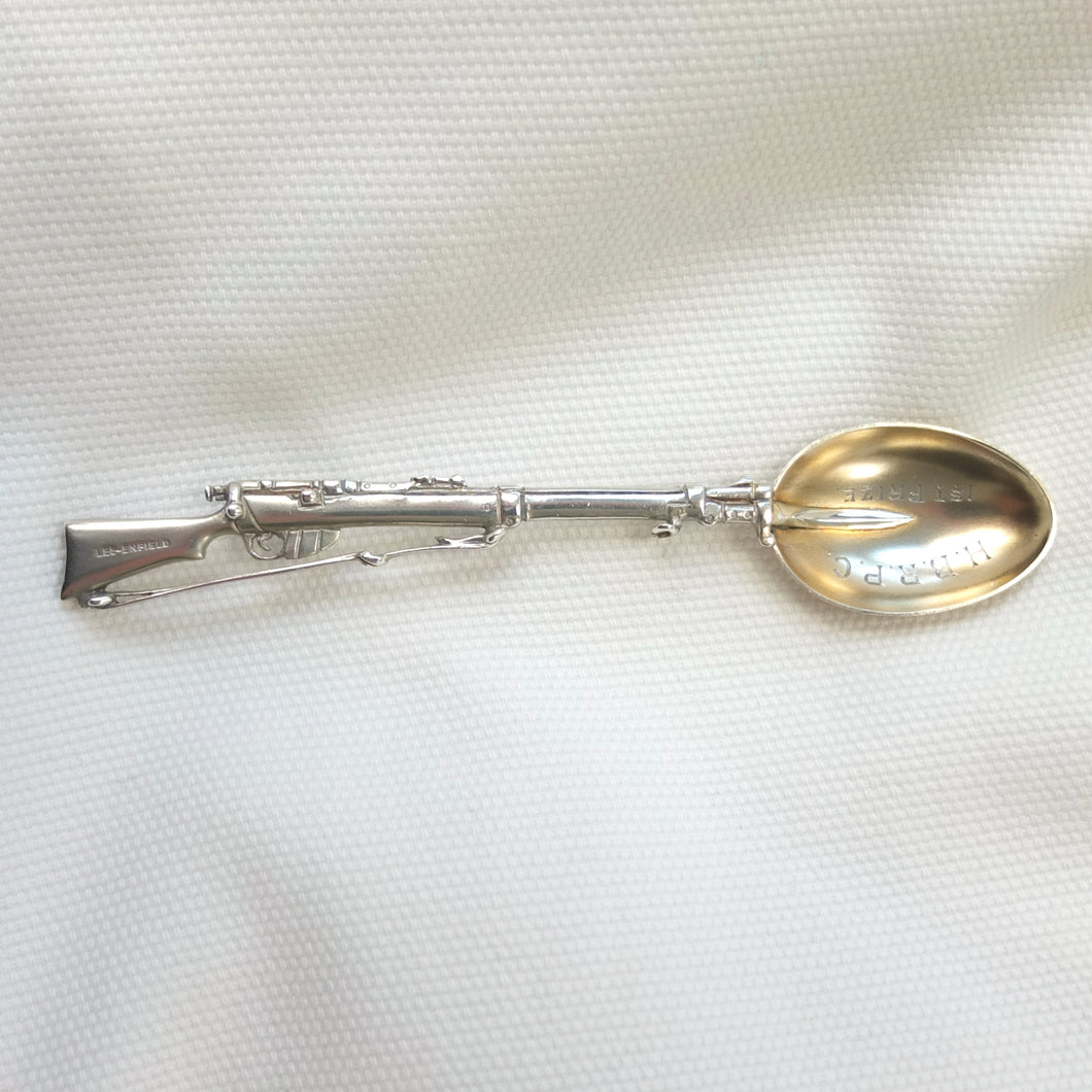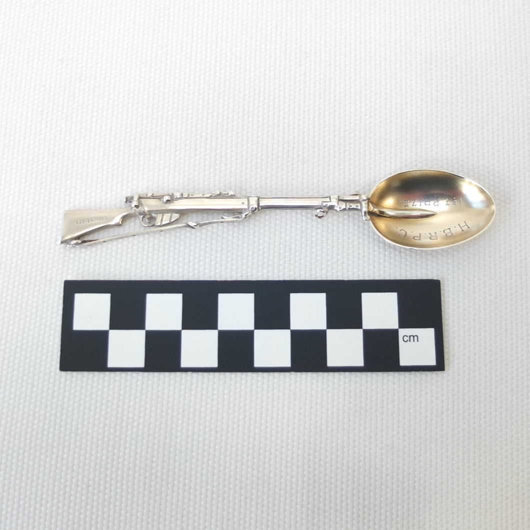 A sterling silver spoon in the form of a Lee Enfield service rifle, dating from 1904. It was made by Saunders & Shepherd, a well-known Edwardian firm of silversmiths and jewellers, and is hallmarked for Chester 1904. Saunders & Shepherd made silver rifle spoons from 1899 (Design number 349937, registered November 1899), originally as souvenirs of the Boer War, and also as prizes for rifle clubs and other shooting associations. The highly detailed and accurate representation of a Lee Enfield rifle is very finely made and is stamped on one side of the butt with the maker's mark, 'CS*FS', the Chester Assay marks, and the date letter 'D' for 1904. The other side of the butt is stamped 'Lee-Enfield'. The bowl of the spoon is engraved with the letters 'H.B.R.P.C.' and '1st Prize'.