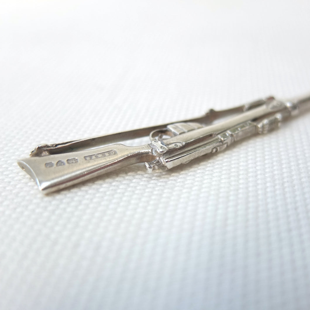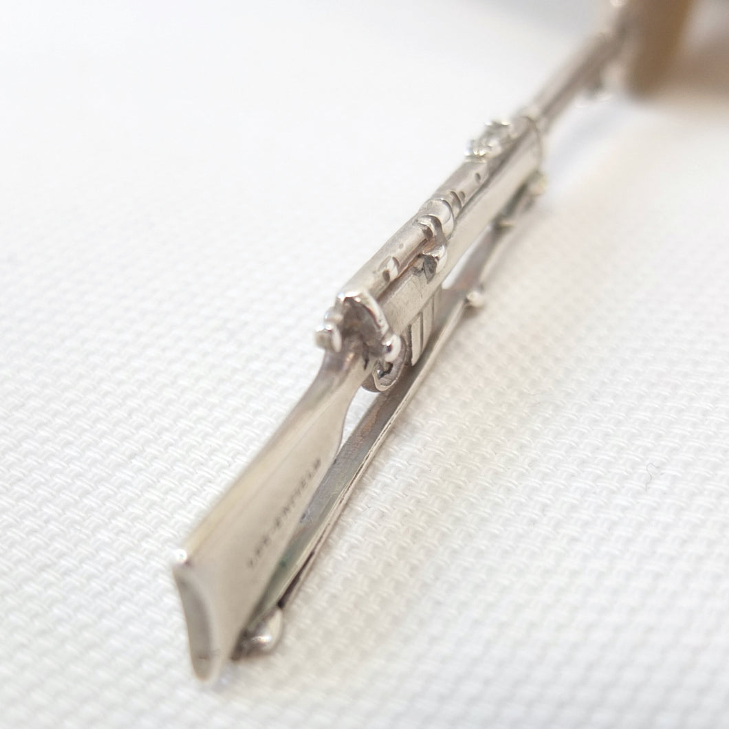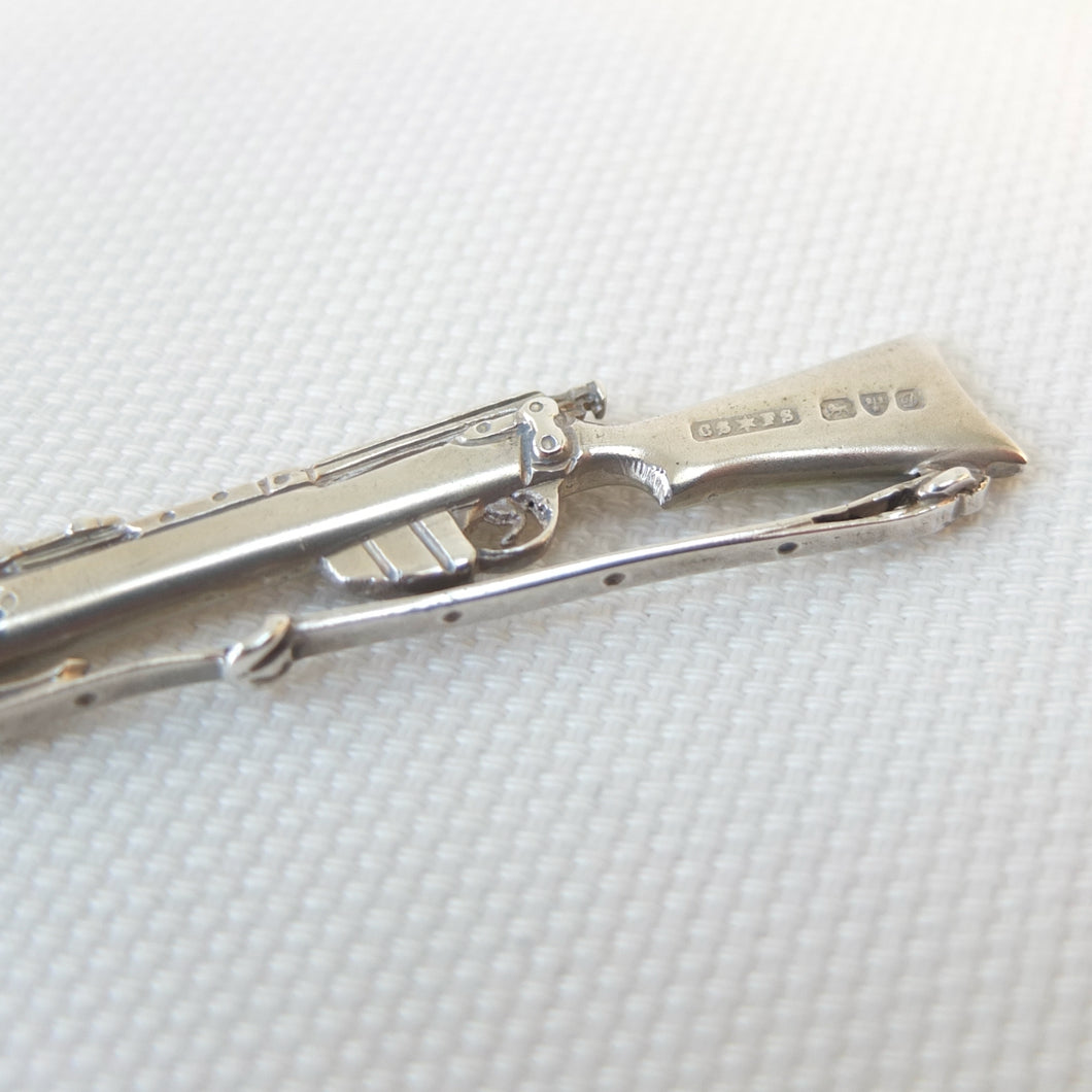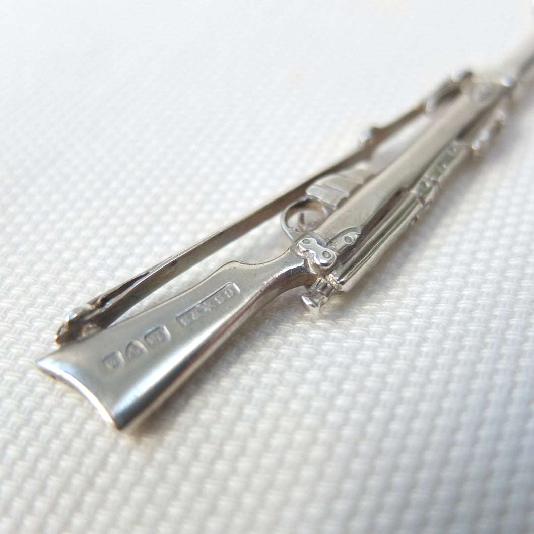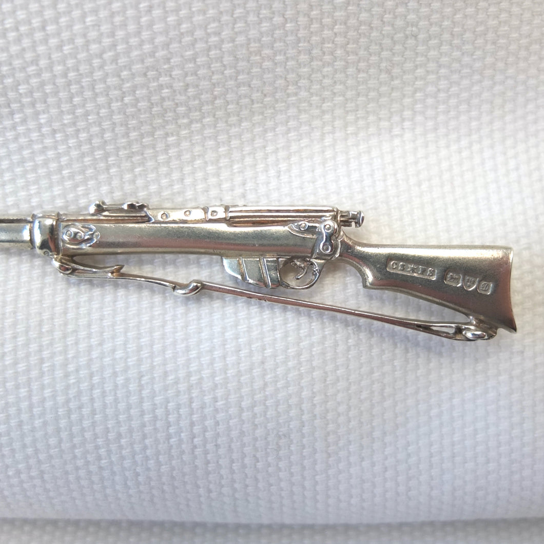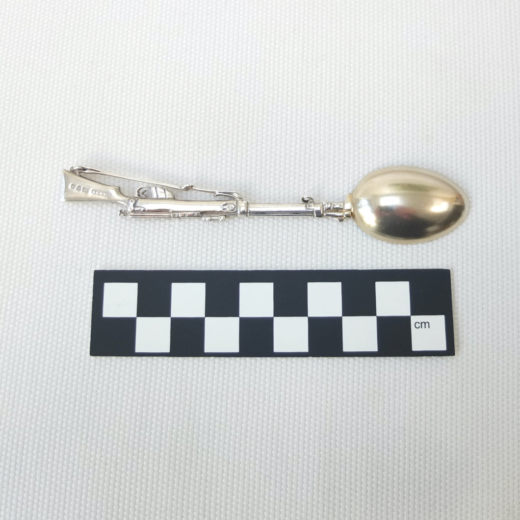 A sterling silver spoon in the form of a Lee Enfield service rifle, dating from 1904. It was made by Saunders & Shepherd, a well-known Edwardian firm of silversmiths and jewellers, and is hallmarked for Chester 1904. Saunders & Shepherd made silver rifle spoons from 1899 (Design number 349937, registered November 1899), originally as souvenirs of the Boer War, and also as prizes for rifle clubs and other shooting associations. The highly detailed and accurate representation of a Lee Enfield rifle is very finely made and is stamped on one side of the butt with the maker's mark, 'CS*FS', the Chester Assay marks, and the date letter 'D' for 1904. The other side of the butt is stamped 'Lee-Enfield'. The bowl of the spoon is engraved with the letters 'H.B.R.P.C.' and '1st Prize'.
