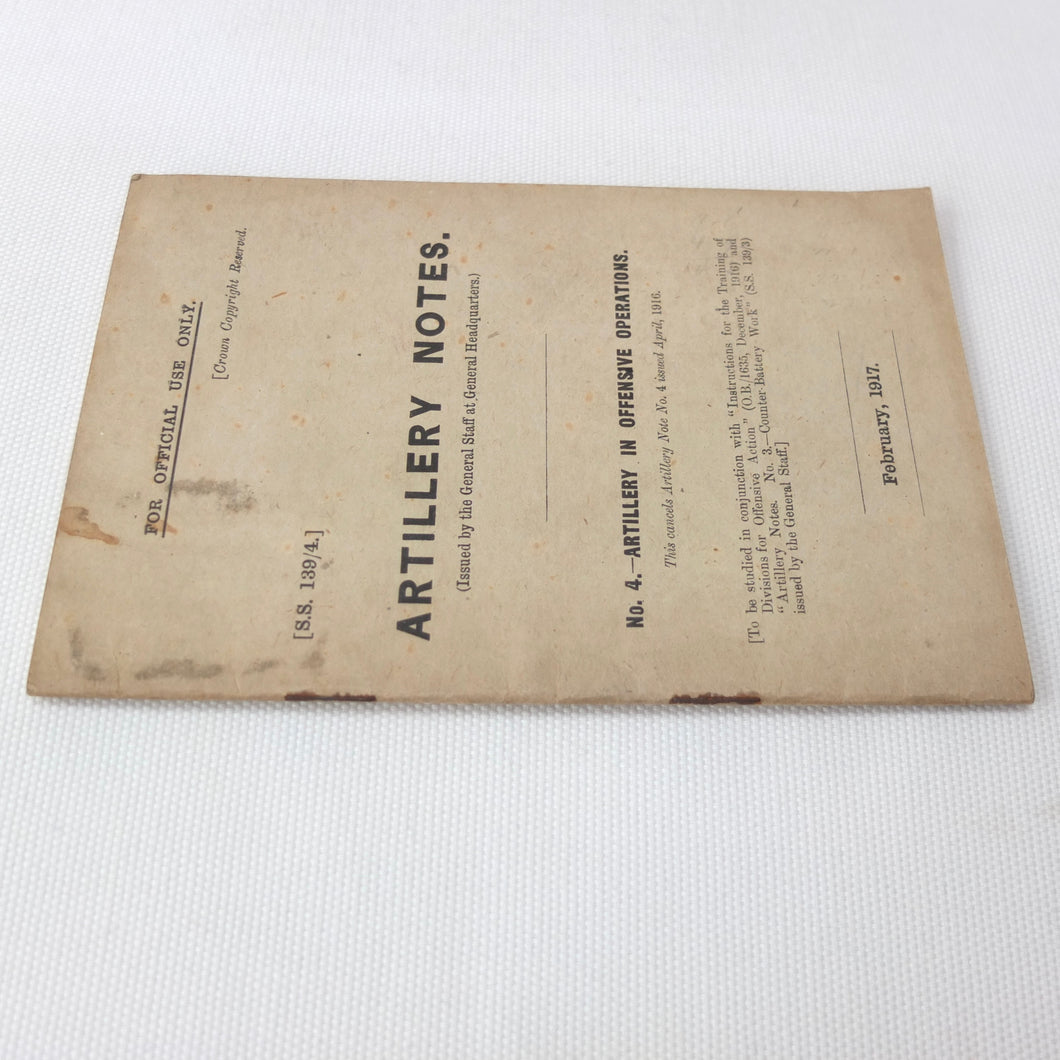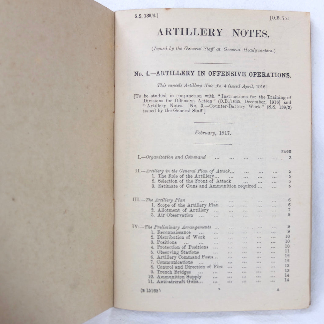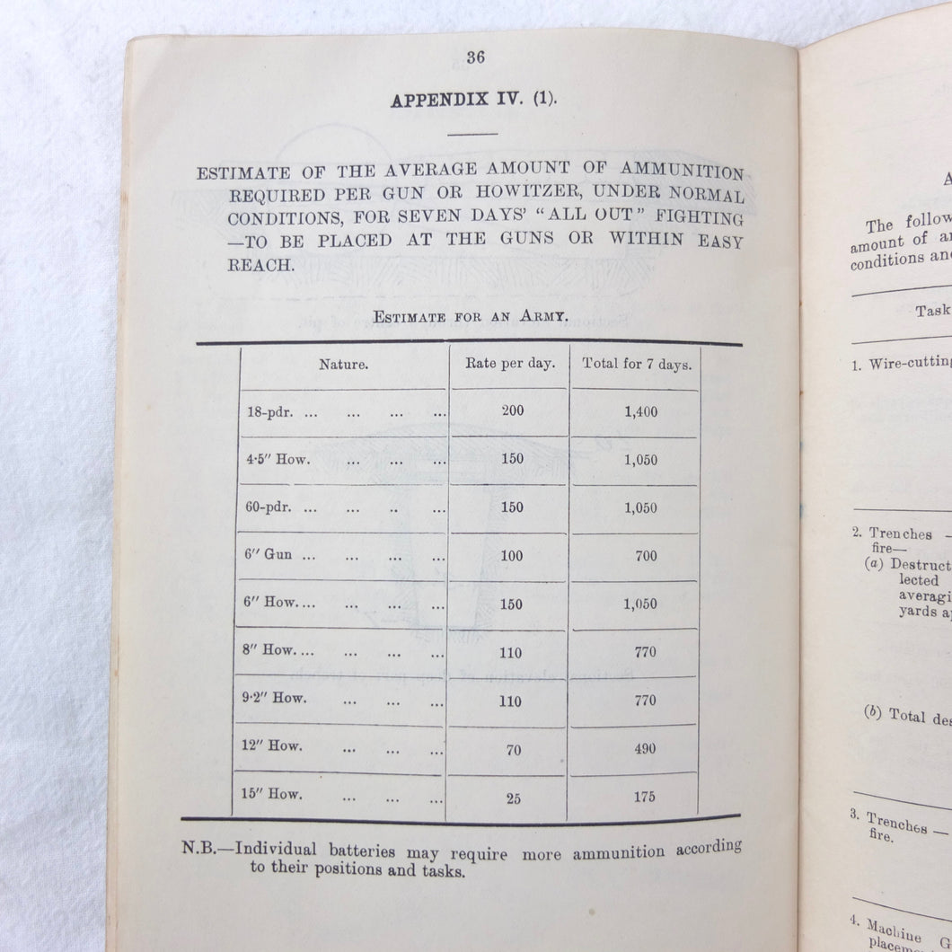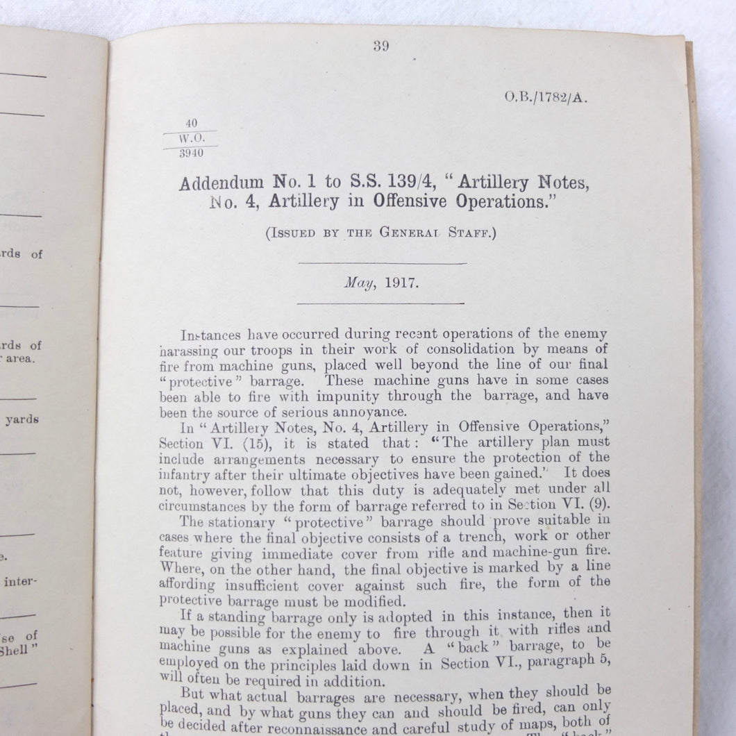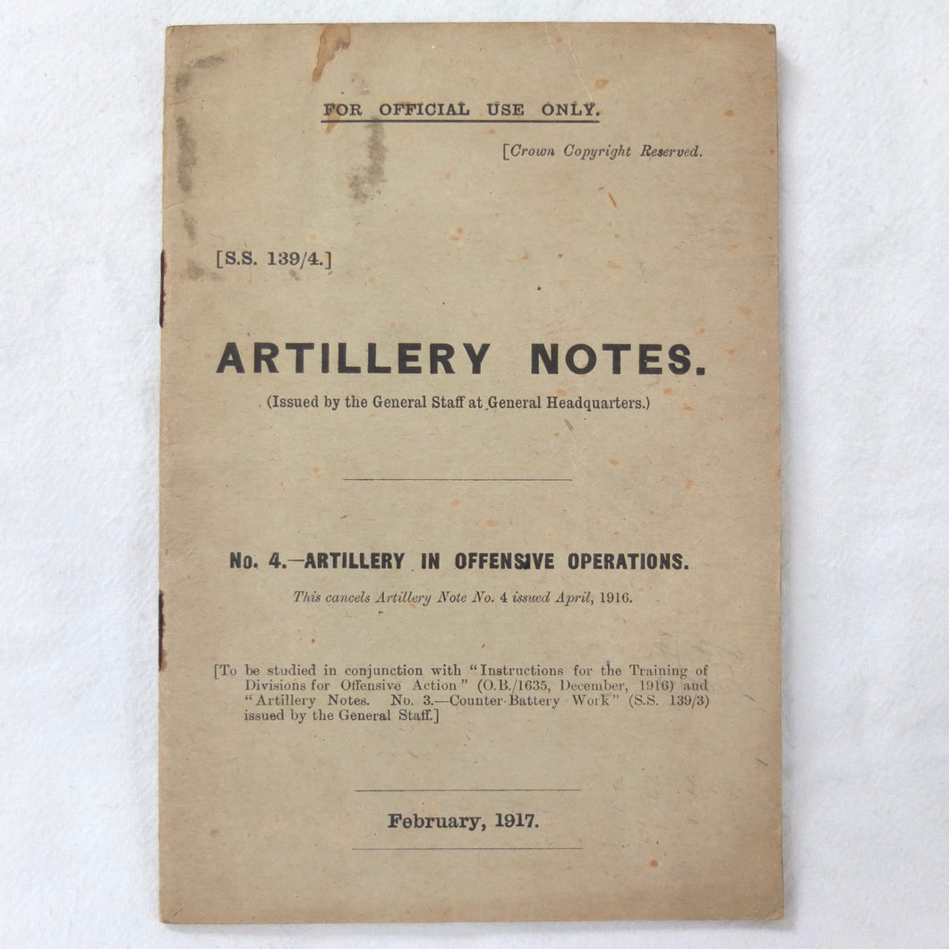 Artillery Notes No.4 is a rare original WW1 British Army manual, published in February 1917 by H.M.S.O. for the War Office. It includes a great deal of very useful information that an artillery officer would have needed to know in the front line in 1917. Subjects covered include: artillery in attack, ammunitiuon, air observation, anti-aircraft guns, reconnaissance, howitzers, creeping barrages, fortified positions, fire control, destruction of defences, wire cutting, targets, dug-outs, machine guns, bombardment, field artillery, rate of fire, shrapnel, and high explosive shells. The manual includes tables showing the amounts of ammunition required to achieve certain tasks, such as wire cutting, trench destruction, gas attacks, and destruction of machine gun emplacements.