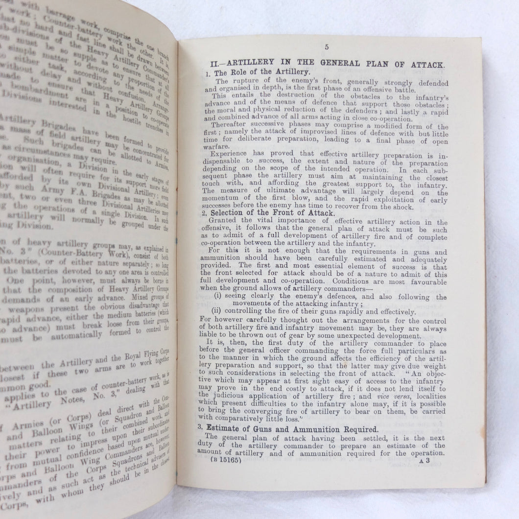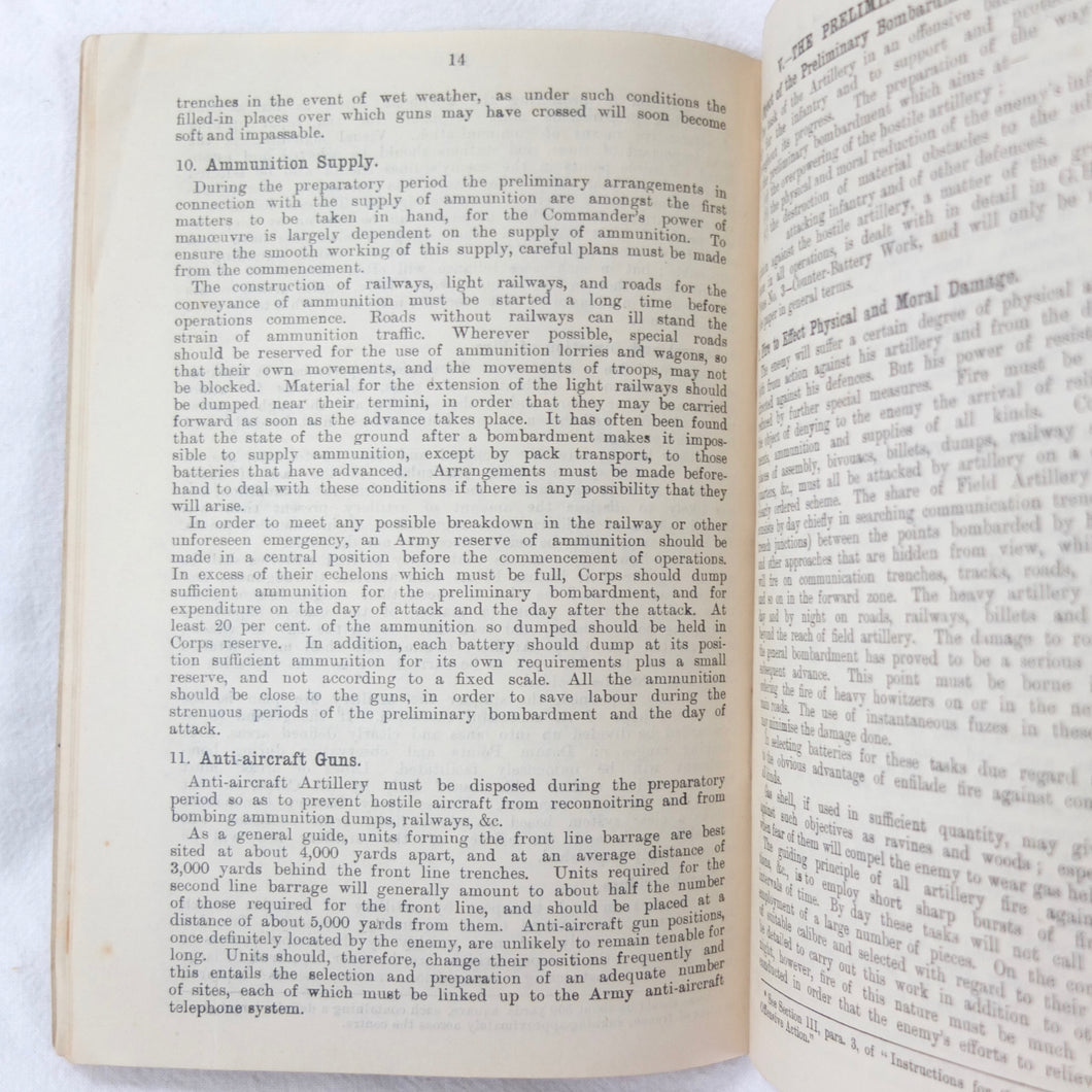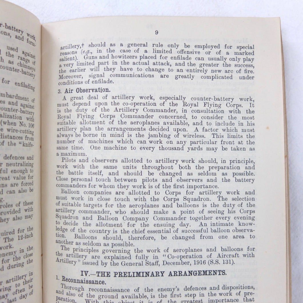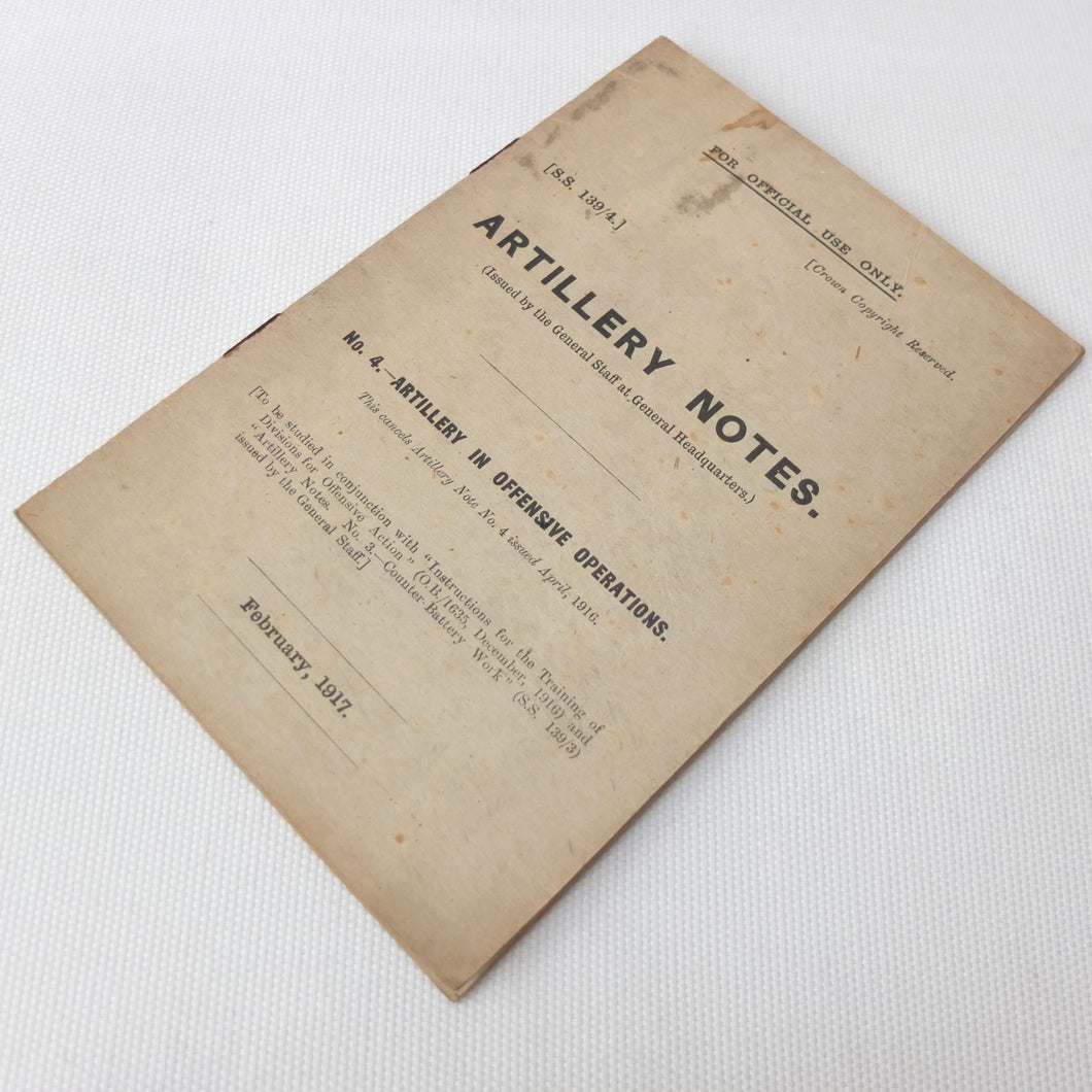 Artillery Notes No.4 is a rare original WW1 British Army manual, published in February 1917 by H.M.S.O. for the War Office. It includes a great deal of very useful information that an artillery officer would have needed to know in the front line in 1917. Subjects covered include: artillery in attack, ammunitiuon, air observation, anti-aircraft guns, reconnaissance, howitzers, creeping barrages, fortified positions, fire control, destruction of defences, wire cutting, targets, dug-outs, machine guns, bombardment, field artillery, rate of fire, shrapnel, and high explosive shells. The manual includes tables showing the amounts of ammunition required to achieve certain tasks, such as wire cutting, trench destruction, gas attacks, and destruction of machine gun emplacements.