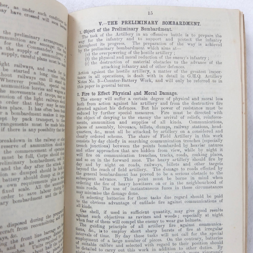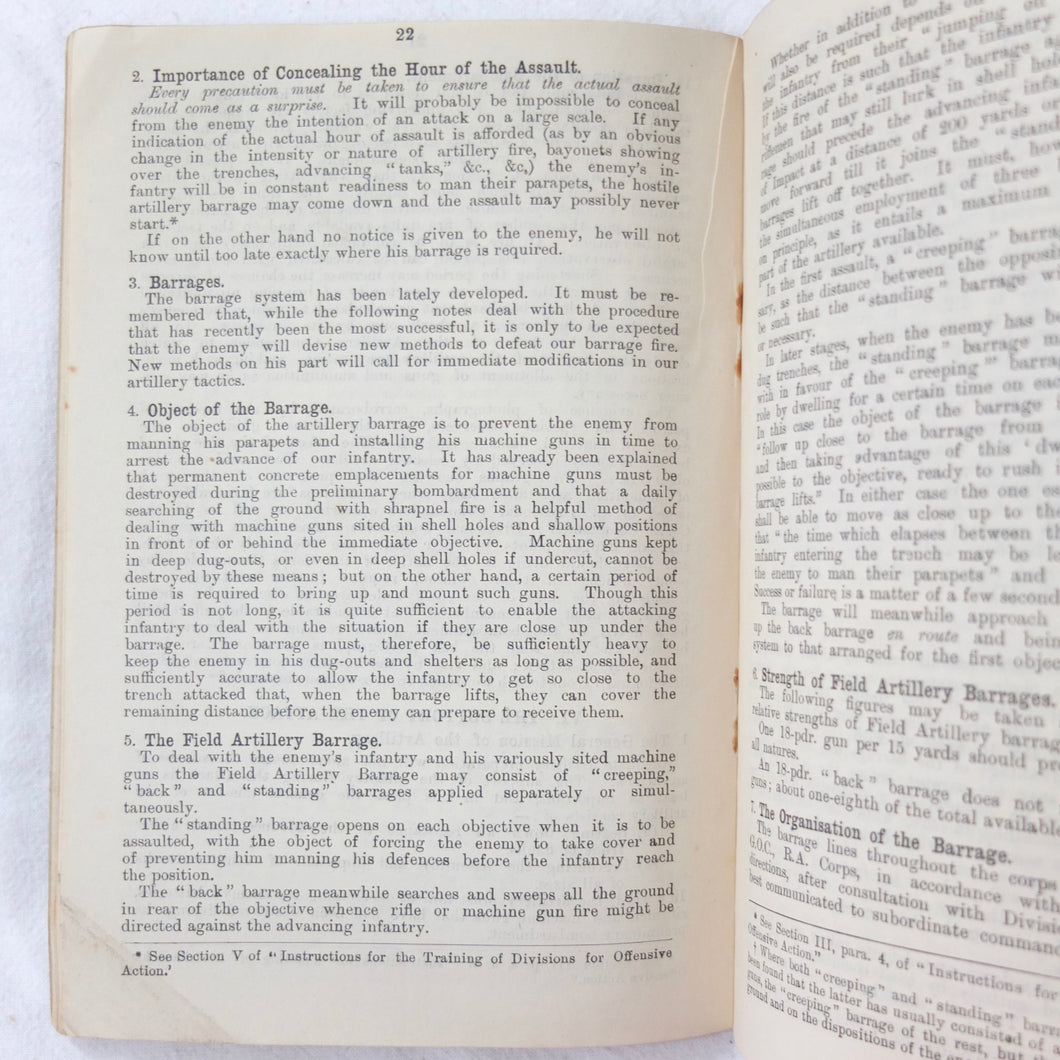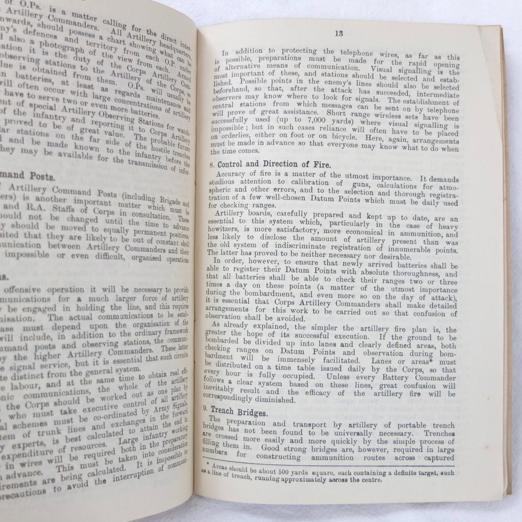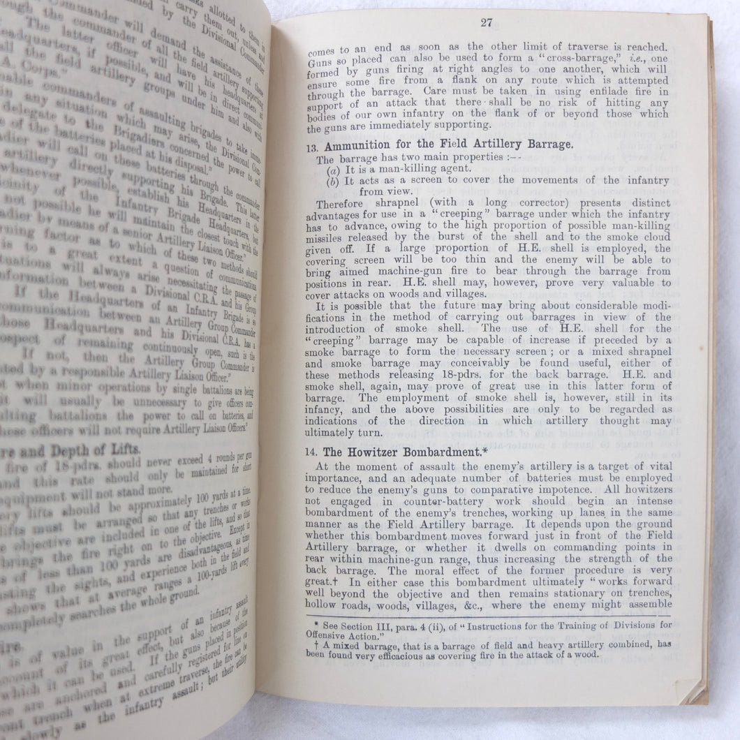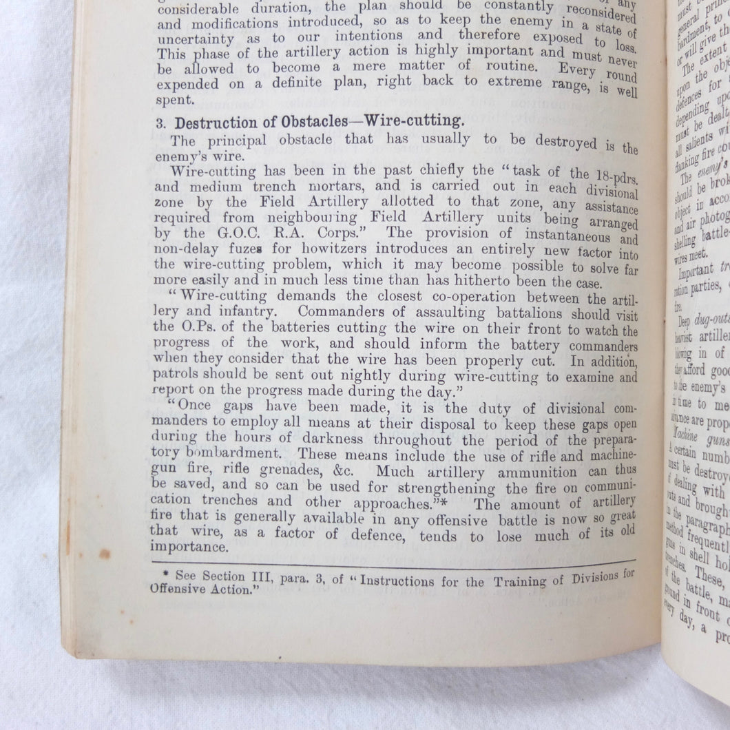 Artillery Notes No.4 is a rare original WW1 British Army manual, published in February 1917 by H.M.S.O. for the War Office. It includes a great deal of very useful information that an artillery officer would have needed to know in the front line in 1917. Subjects covered include: artillery in attack, ammunitiuon, air observation, anti-aircraft guns, reconnaissance, howitzers, creeping barrages, fortified positions, fire control, destruction of defences, wire cutting, targets, dug-outs, machine guns, bombardment, field artillery, rate of fire, shrapnel, and high explosive shells. The manual includes tables showing the amounts of ammunition required to achieve certain tasks, such as wire cutting, trench destruction, gas attacks, and destruction of machine gun emplacements.