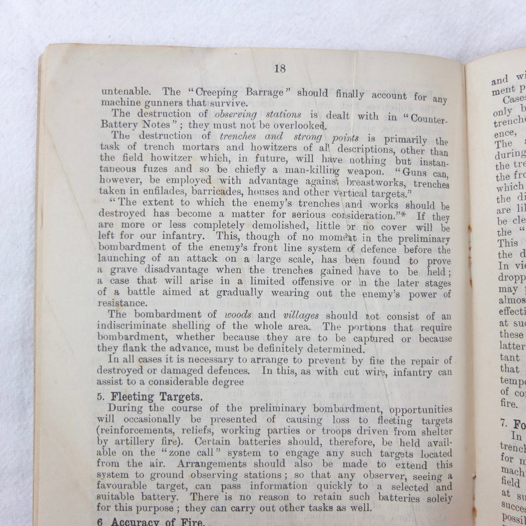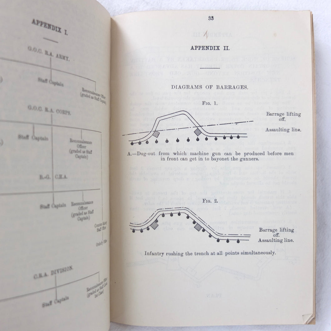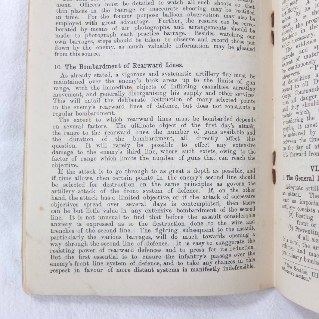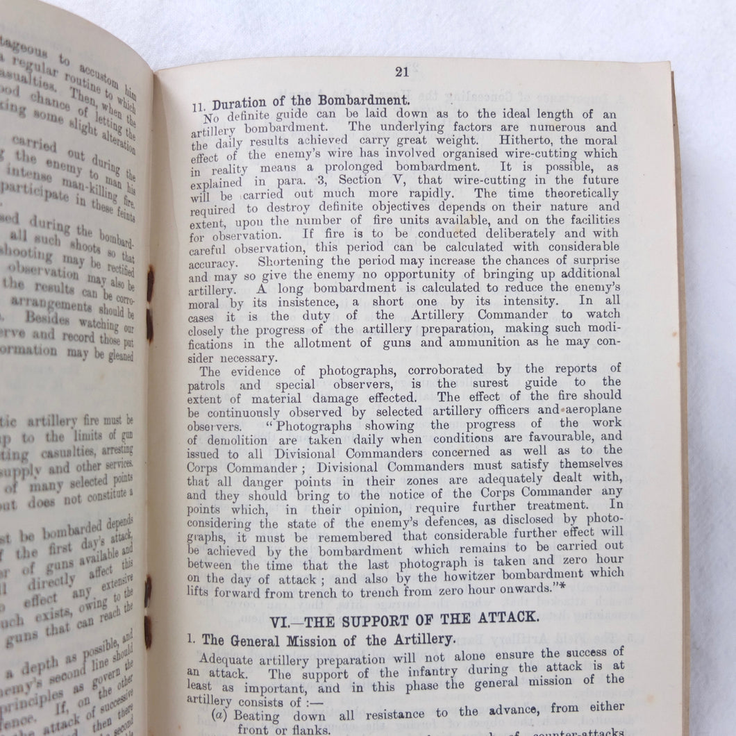 Artillery Notes No.4 is a rare original WW1 British Army manual, published in February 1917 by H.M.S.O. for the War Office. It includes a great deal of very useful information that an artillery officer would have needed to know in the front line in 1917. Subjects covered include: artillery in attack, ammunitiuon, air observation, anti-aircraft guns, reconnaissance, howitzers, creeping barrages, fortified positions, fire control, destruction of defences, wire cutting, targets, dug-outs, machine guns, bombardment, field artillery, rate of fire, shrapnel, and high explosive shells. The manual includes tables showing the amounts of ammunition required to achieve certain tasks, such as wire cutting, trench destruction, gas attacks, and destruction of machine gun emplacements.