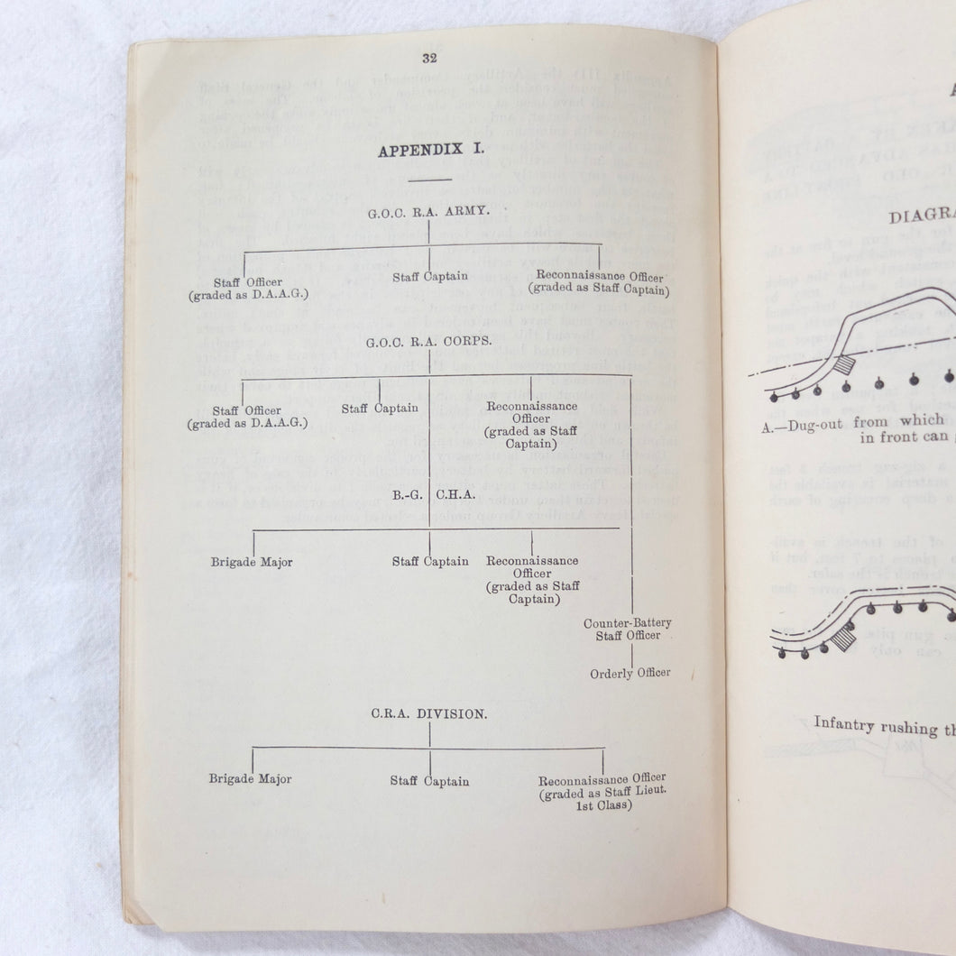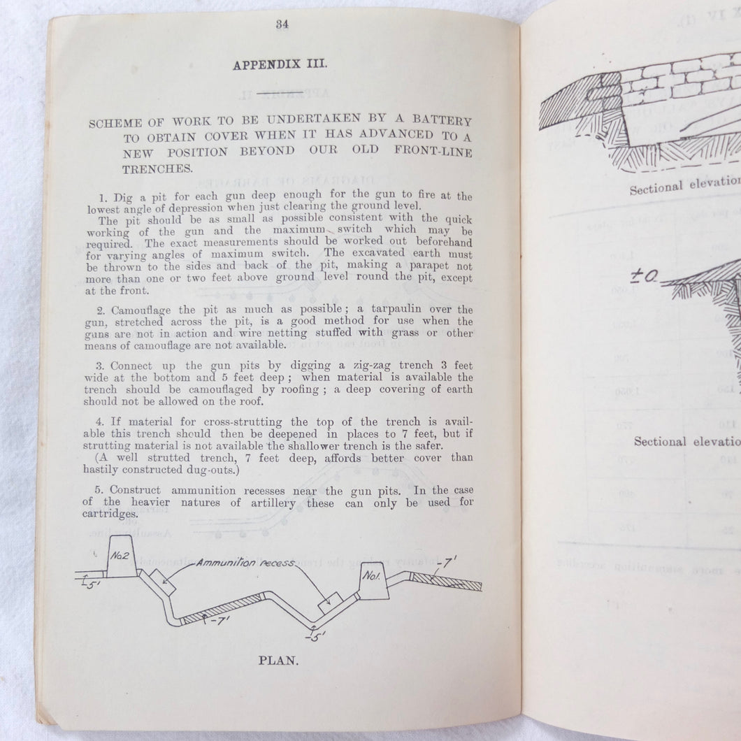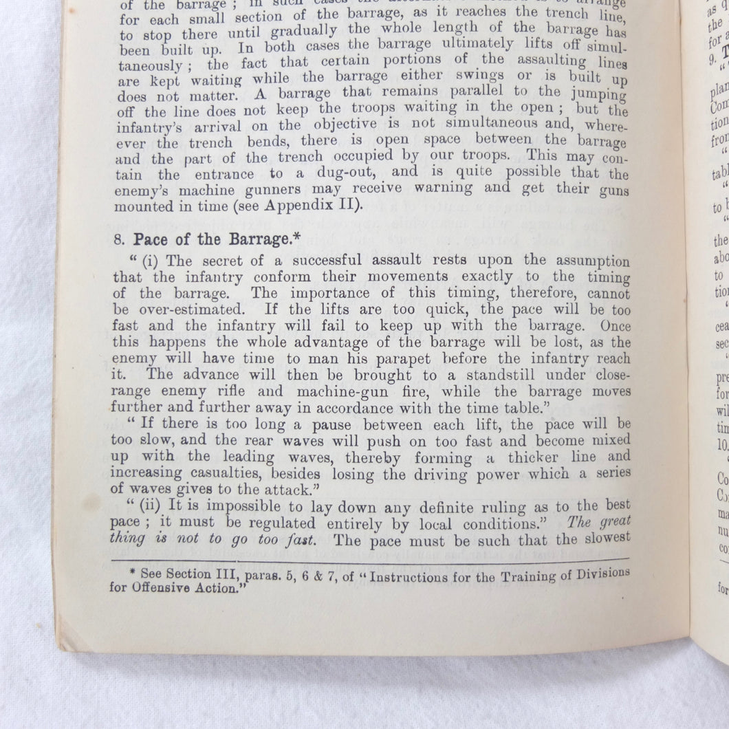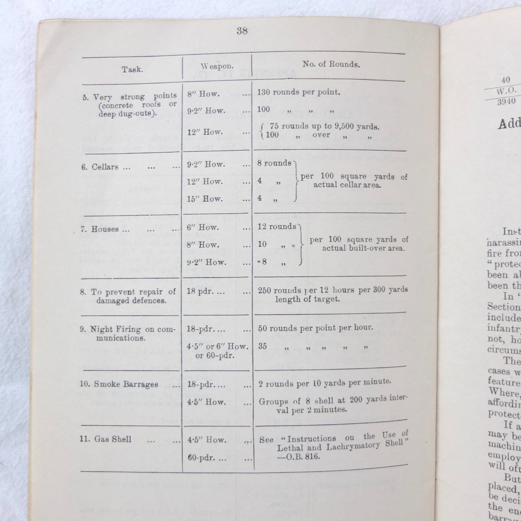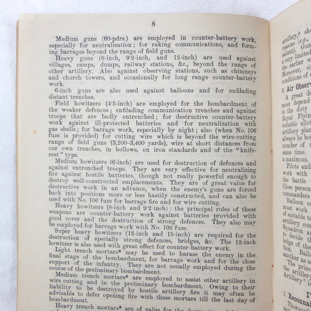 Artillery Notes No.4 is a rare original WW1 British Army manual, published in February 1917 by H.M.S.O. for the War Office. It includes a great deal of very useful information that an artillery officer would have needed to know in the front line in 1917. Subjects covered include: artillery in attack, ammunitiuon, air observation, anti-aircraft guns, reconnaissance, howitzers, creeping barrages, fortified positions, fire control, destruction of defences, wire cutting, targets, dug-outs, machine guns, bombardment, field artillery, rate of fire, shrapnel, and high explosive shells. The manual includes tables showing the amounts of ammunition required to achieve certain tasks, such as wire cutting, trench destruction, gas attacks, and destruction of machine gun emplacements.