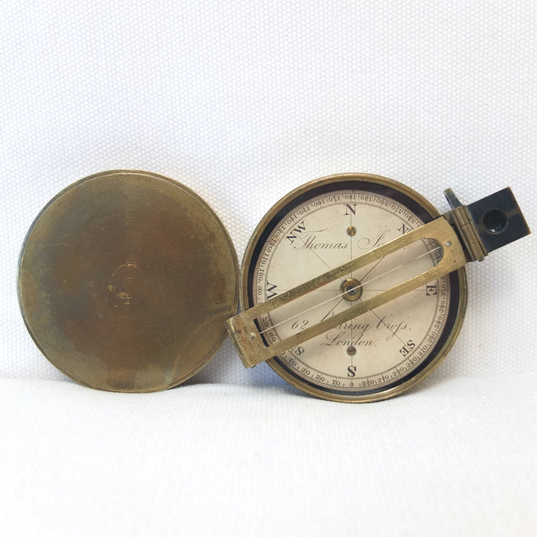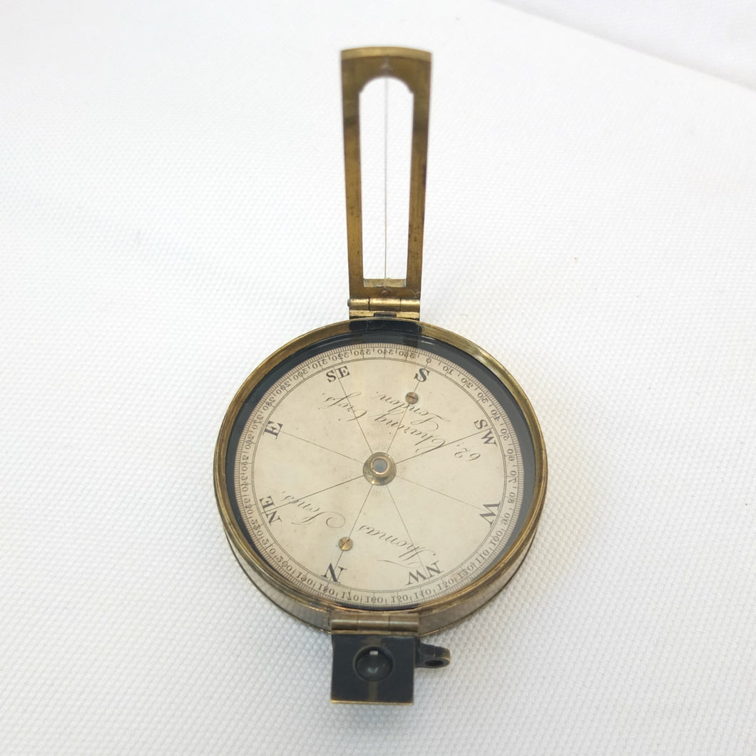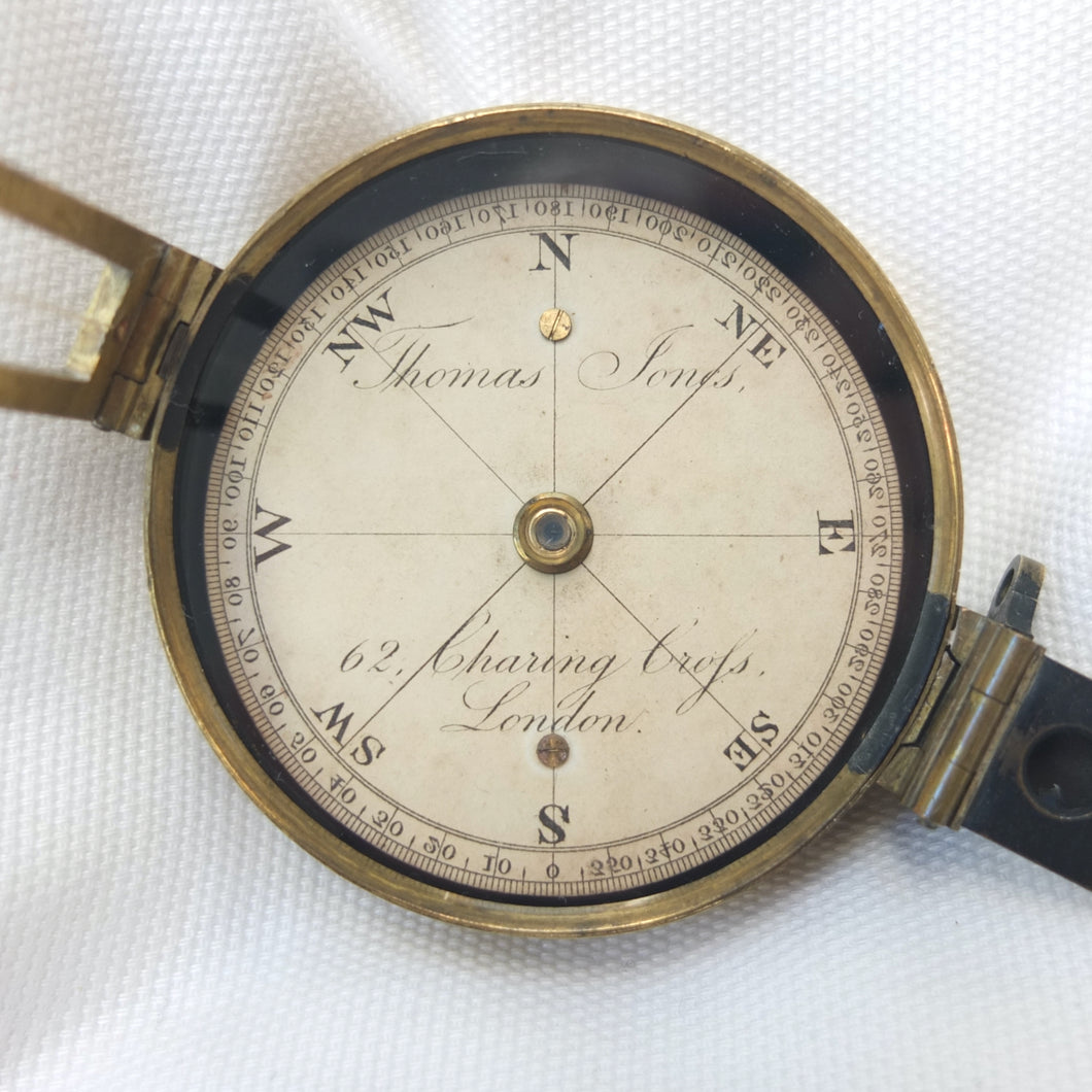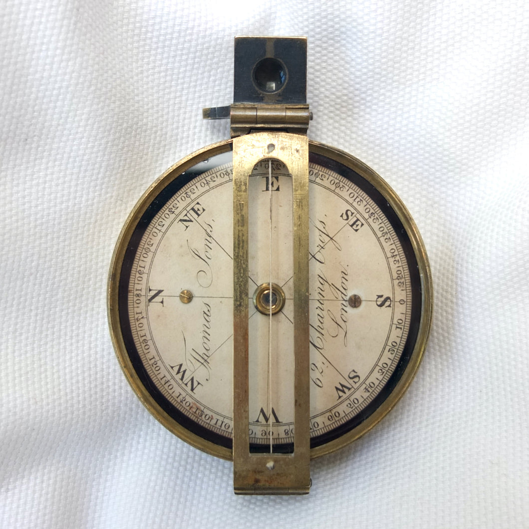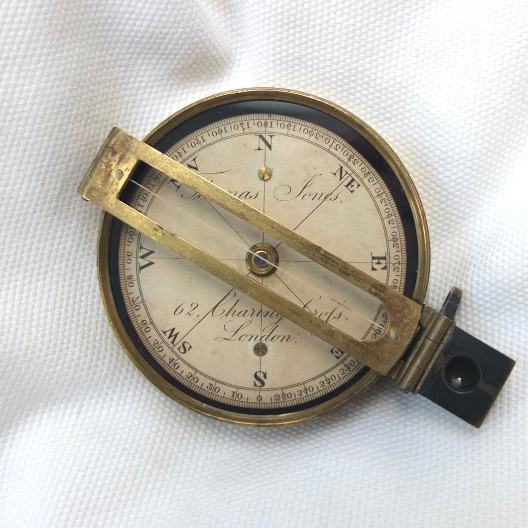 An extremely rare Schmalcalder's Patent type prismatic compass, made in London by Thomas Jones c.1826. The compass card is signed 'Thomas Jones, 62 Charing Cross, London'. Jones moved his business to Charing Cross in 1816, and remained there until he relocated to Rupert Street in 1850. The compass has a hand-drawn white coloured card, brass case with push-fit lid, prism and vane sights, and transit lock. The base of the compass has a screw-threaded mounting point for a tripod.