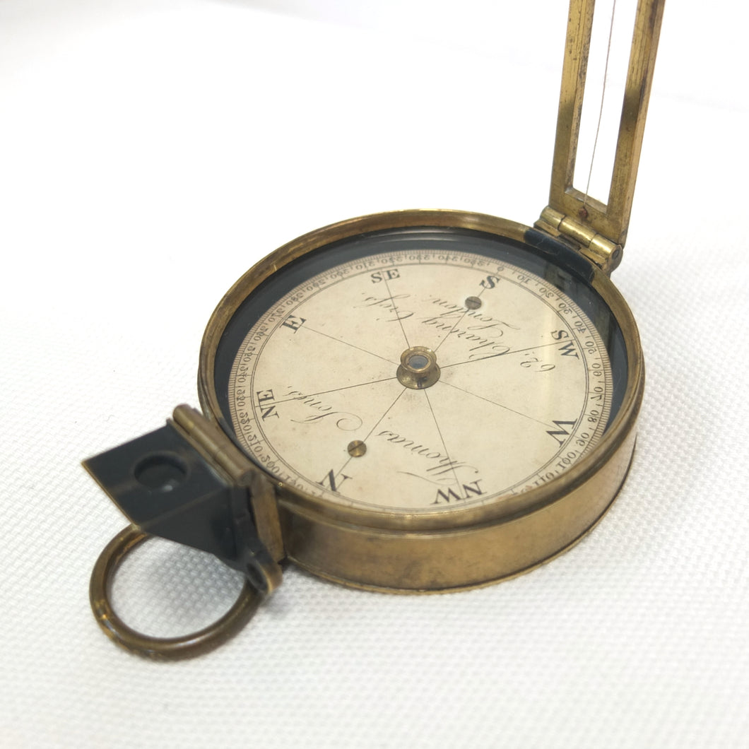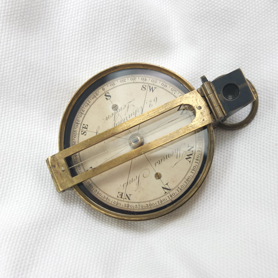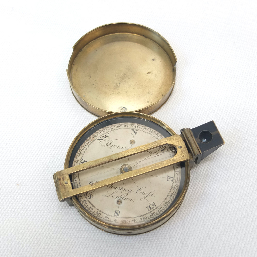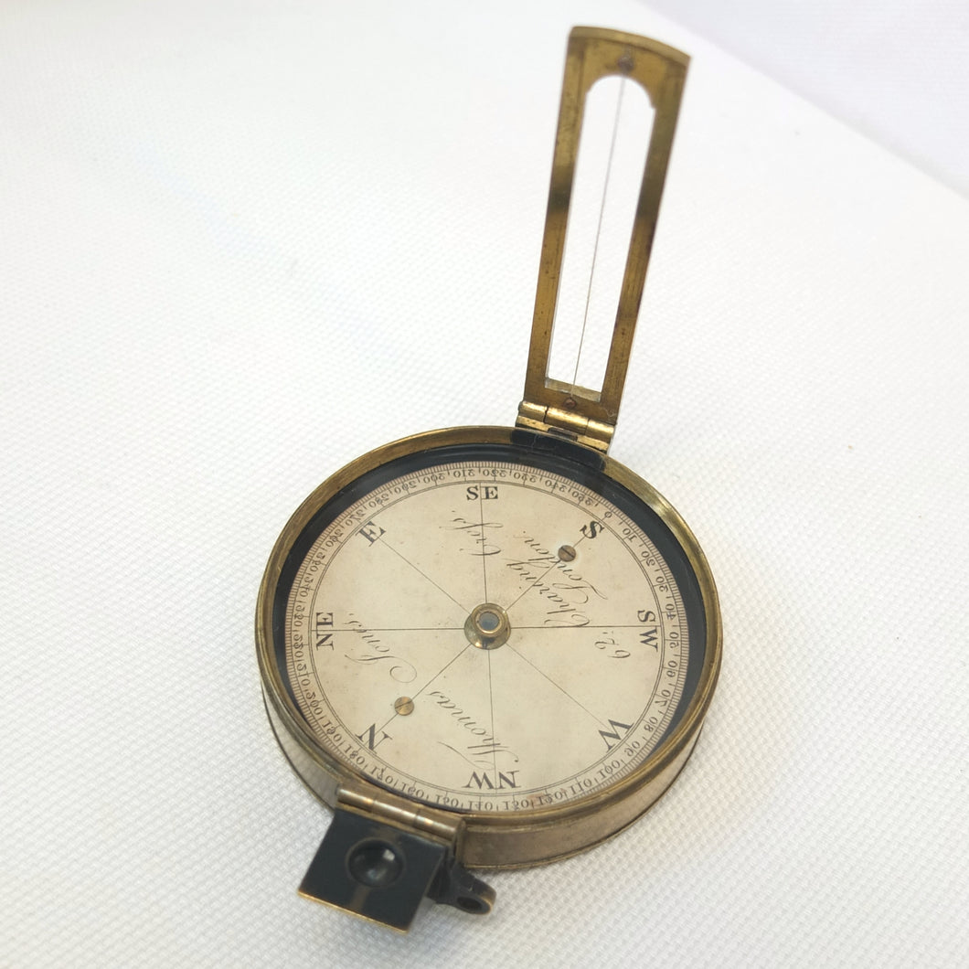 An extremely rare Schmalcalder's Patent type prismatic compass, made in London by Thomas Jones c.1826. The compass card is signed 'Thomas Jones, 62 Charing Cross, London'. Jones moved his business to Charing Cross in 1816, and remained there until he relocated to Rupert Street in 1850. The compass has a hand-drawn white coloured card, brass case with push-fit lid, prism and vane sights, and transit lock. The base of the compass has a screw-threaded mounting point for a tripod.