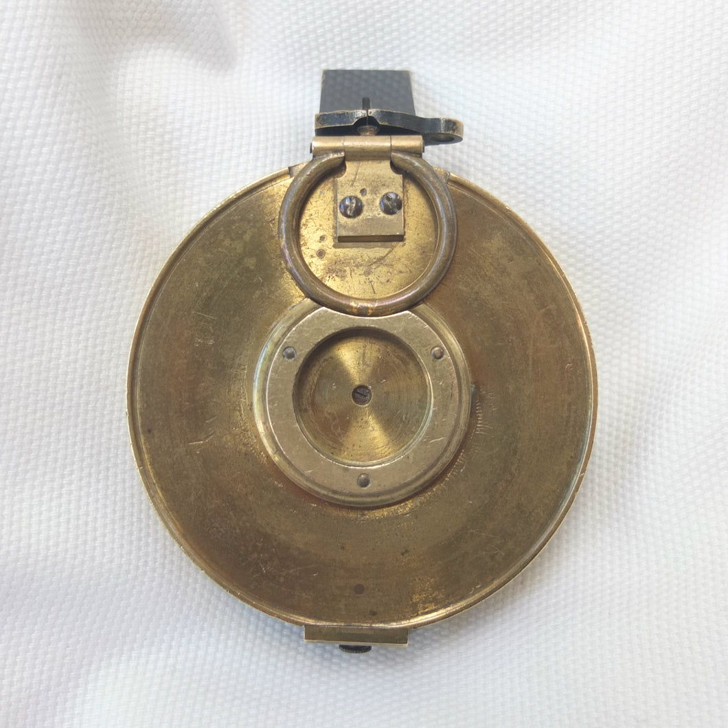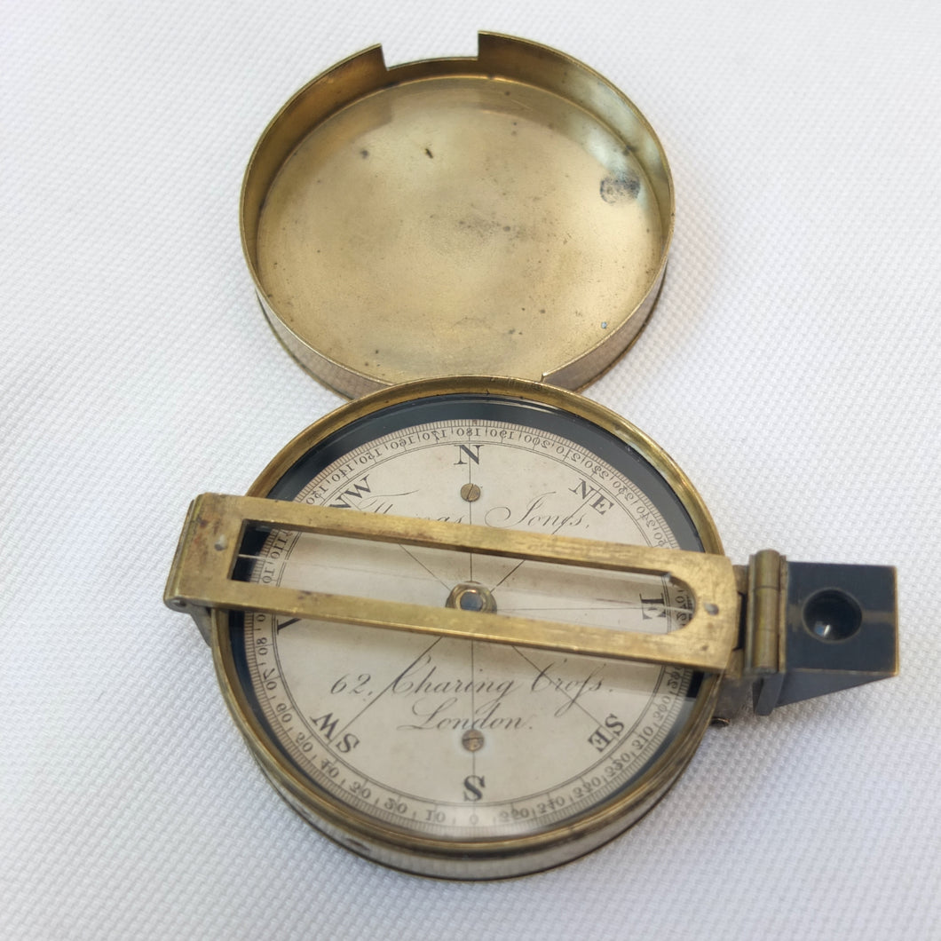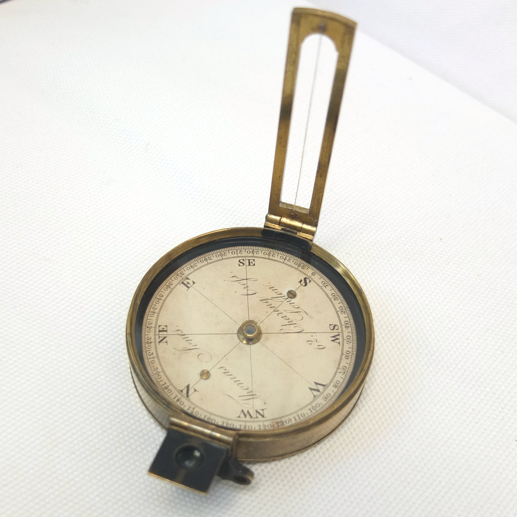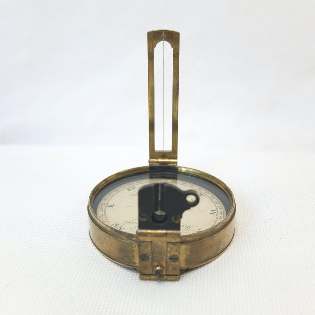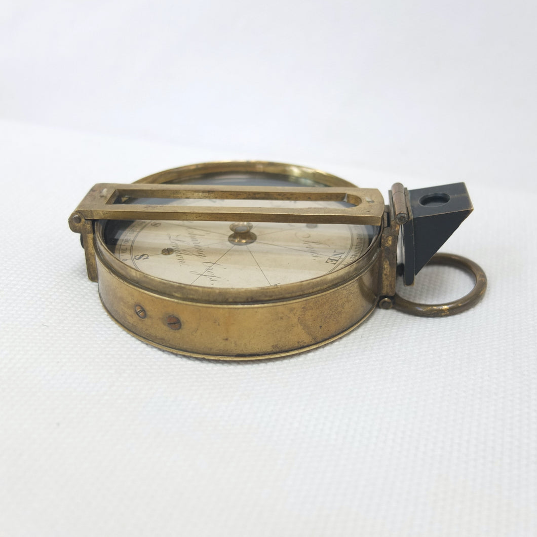 An extremely rare Schmalcalder's Patent type prismatic compass, made in London by Thomas Jones c.1826. The compass card is signed 'Thomas Jones, 62 Charing Cross, London'. Jones moved his business to Charing Cross in 1816, and remained there until he relocated to Rupert Street in 1850. The compass has a hand-drawn white coloured card, brass case with push-fit lid, prism and vane sights, and transit lock. The base of the compass has a screw-threaded mounting point for a tripod.