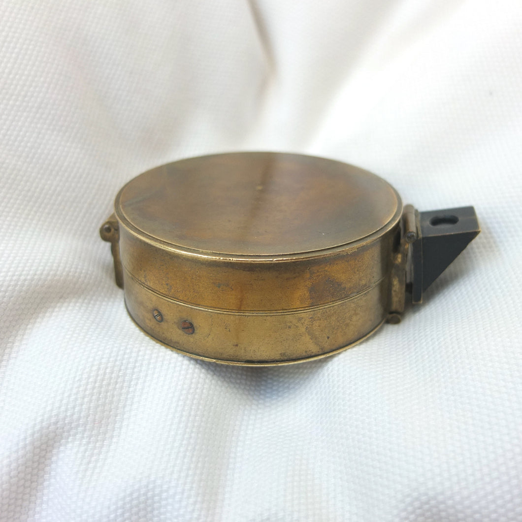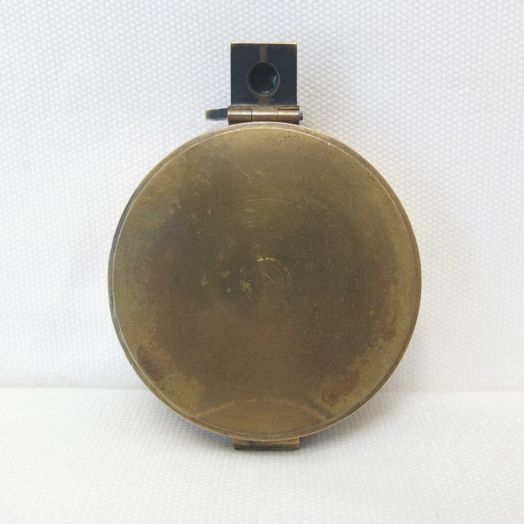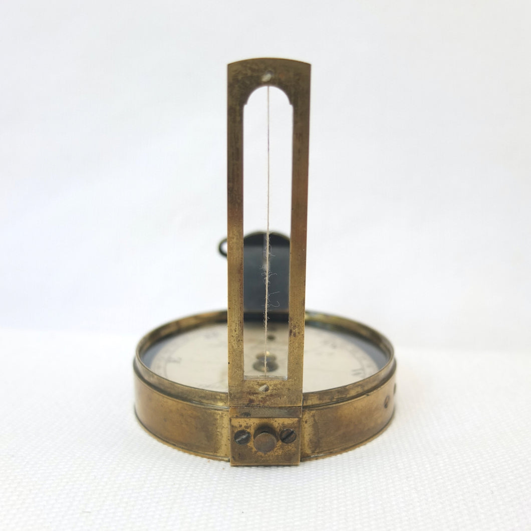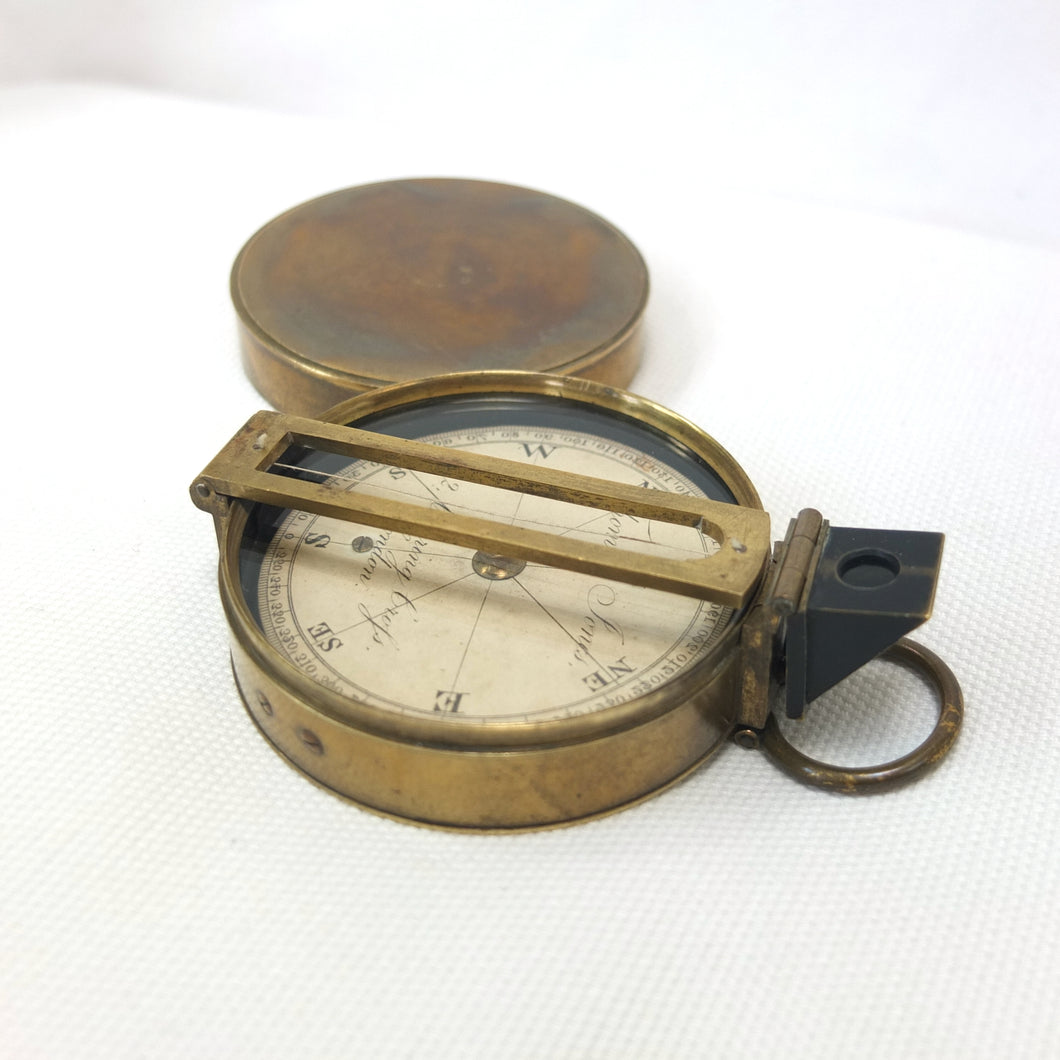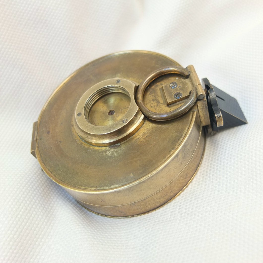 In very good, virtually 'museum', condition, and full working order. The compass finds North well. The original glass and prism are in very good condition, with an excellent view of the card through the prism. The compass card is in excellent condition. There is some wear and a few marks to the original lacquered finish of the brass case.