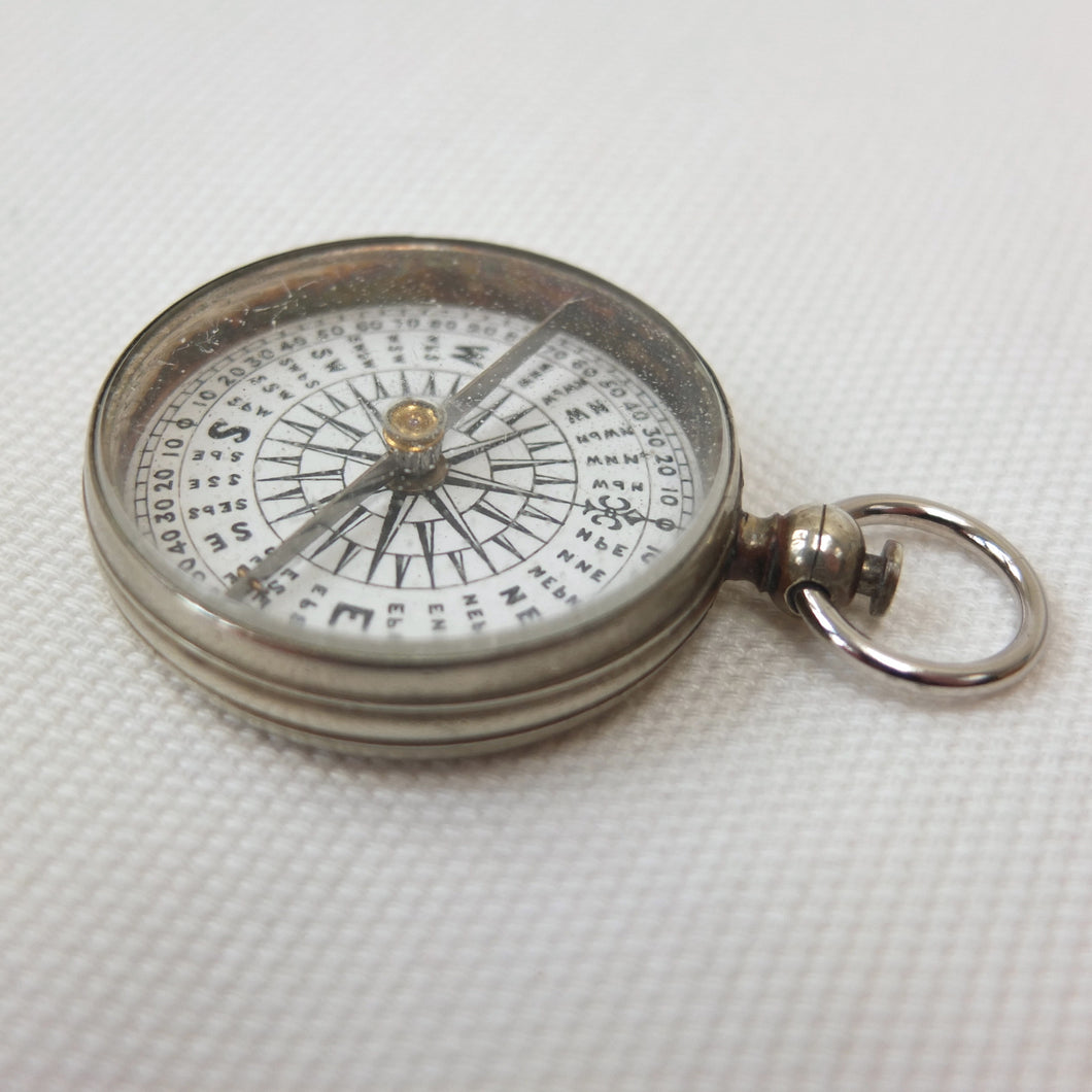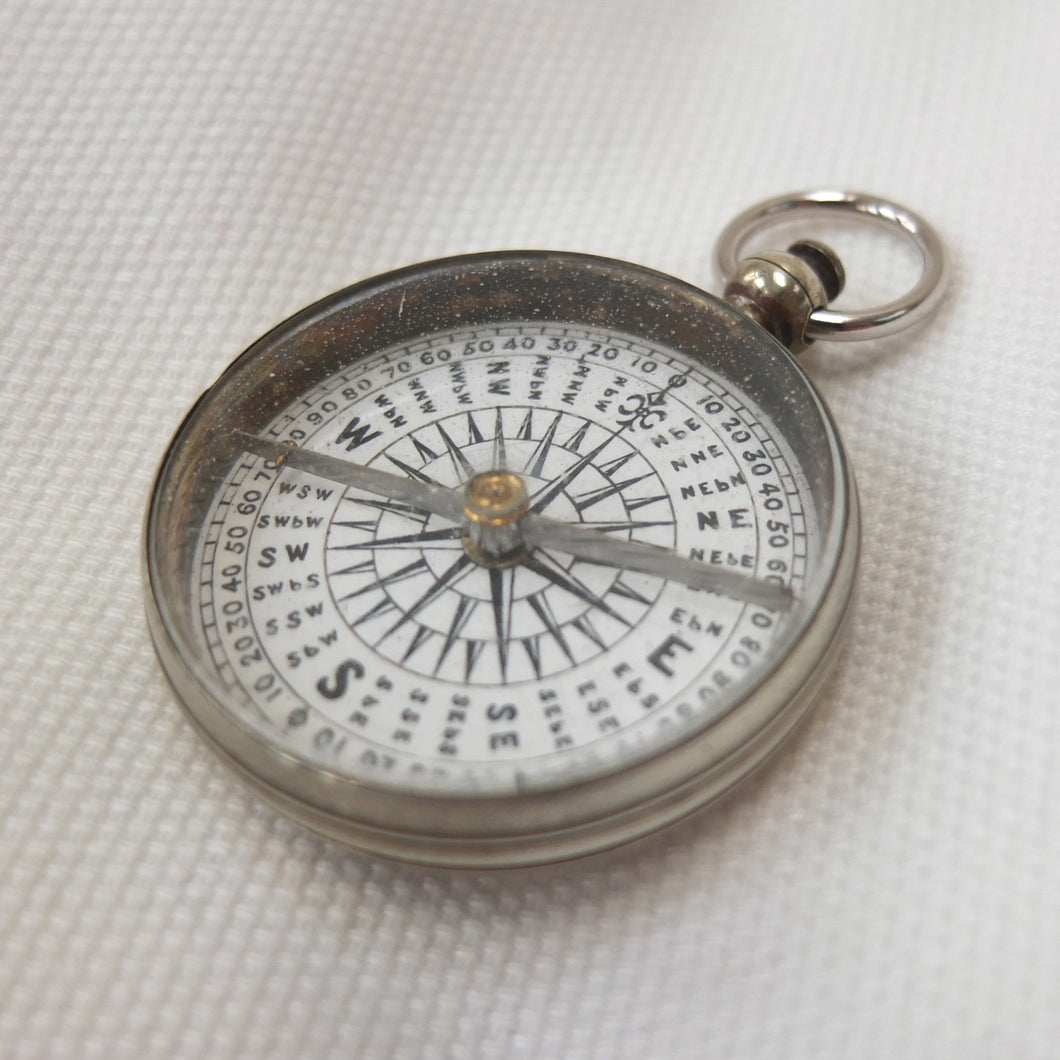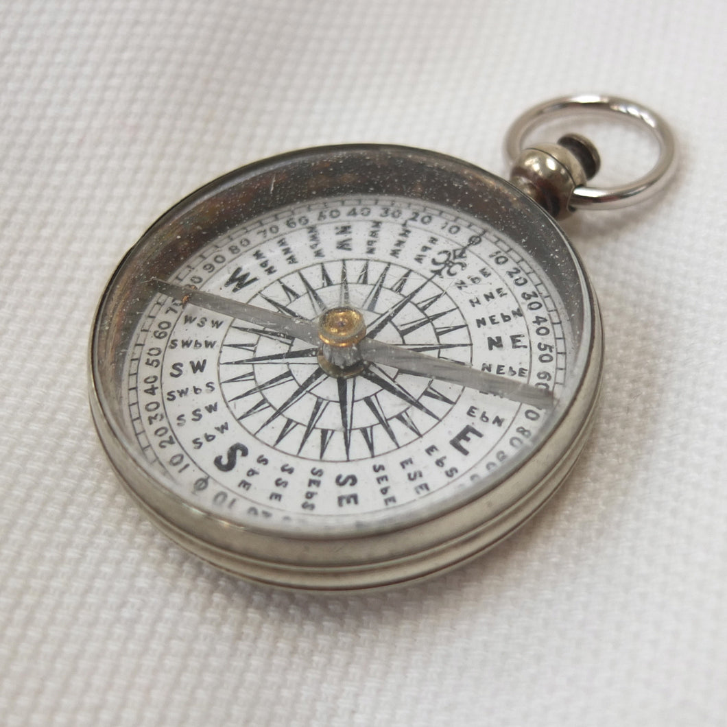 A late Georgian or early Victorian English pocket compass dating from c.1830. With a hand painted enamel compass card of a typically ornate, highly detailed Georgian style. The design is similar to that of a compass made by Francis Barker for the firm of J & G Simms of London in 1842. The compass has a delicate and finely made English bar needle, and a jewelled pivot. In a nickel plated brass case, with a transit lock operated by a button at the bow. The compass is in full working order and finds North well. Although there are no maker's marks, this is a very high quality compass, undoubtedly from one of the finest makers of the time.