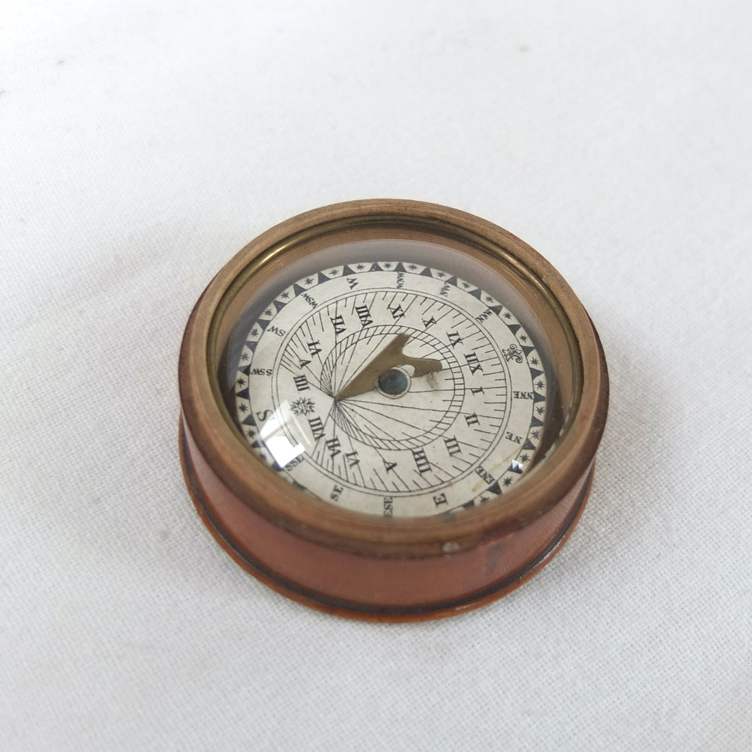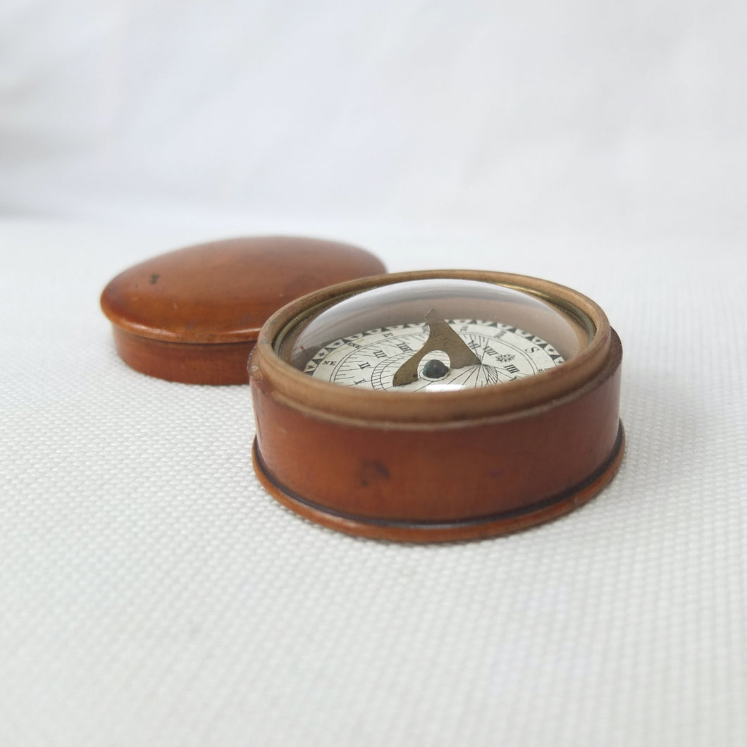 This example features a turned wooden case and floating sundial compass card, incorporating a brass gnomon under a domed glass. The compass is in full working order and finds North very well.