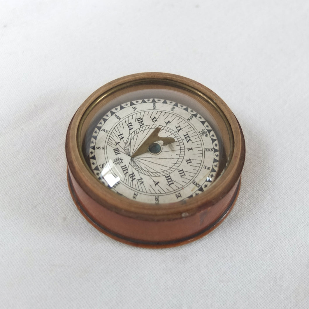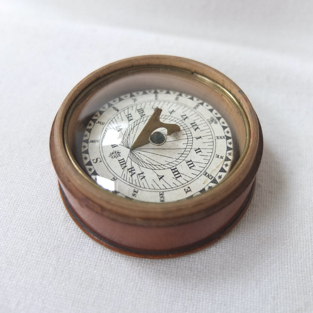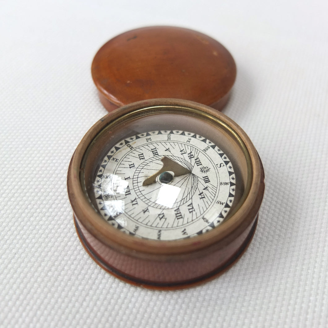 A Georgian or early Victorian wooden pocket sundial compass, also known as a 'Pantochronometer' or 'Magnetic Dial', dating from c.1840. The term pantochronometer was apparently coined in the early 19th century by Charles Essex & Co. of Clerkenwell, London. This particular type of floating sundial compass was patented by the London instrument maker Samuel Porter in 1824, who referred to these instruments as 'Magnetic Dials' and often labelled them to that effect on the base. Similar instruments are known to have been made in Europe in the late 18th century. Further details of the history of pocket sundials can be found at the excellent compassmuseum.com website.