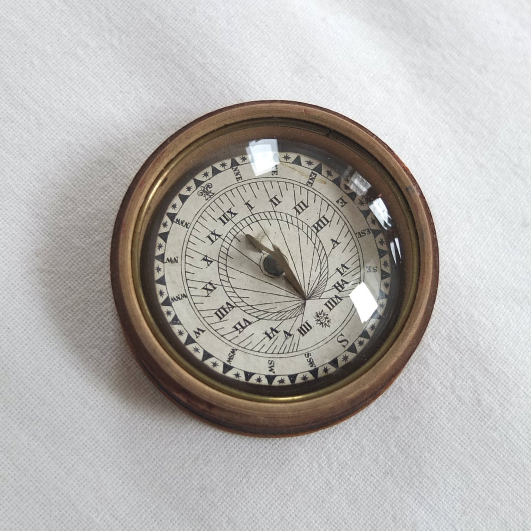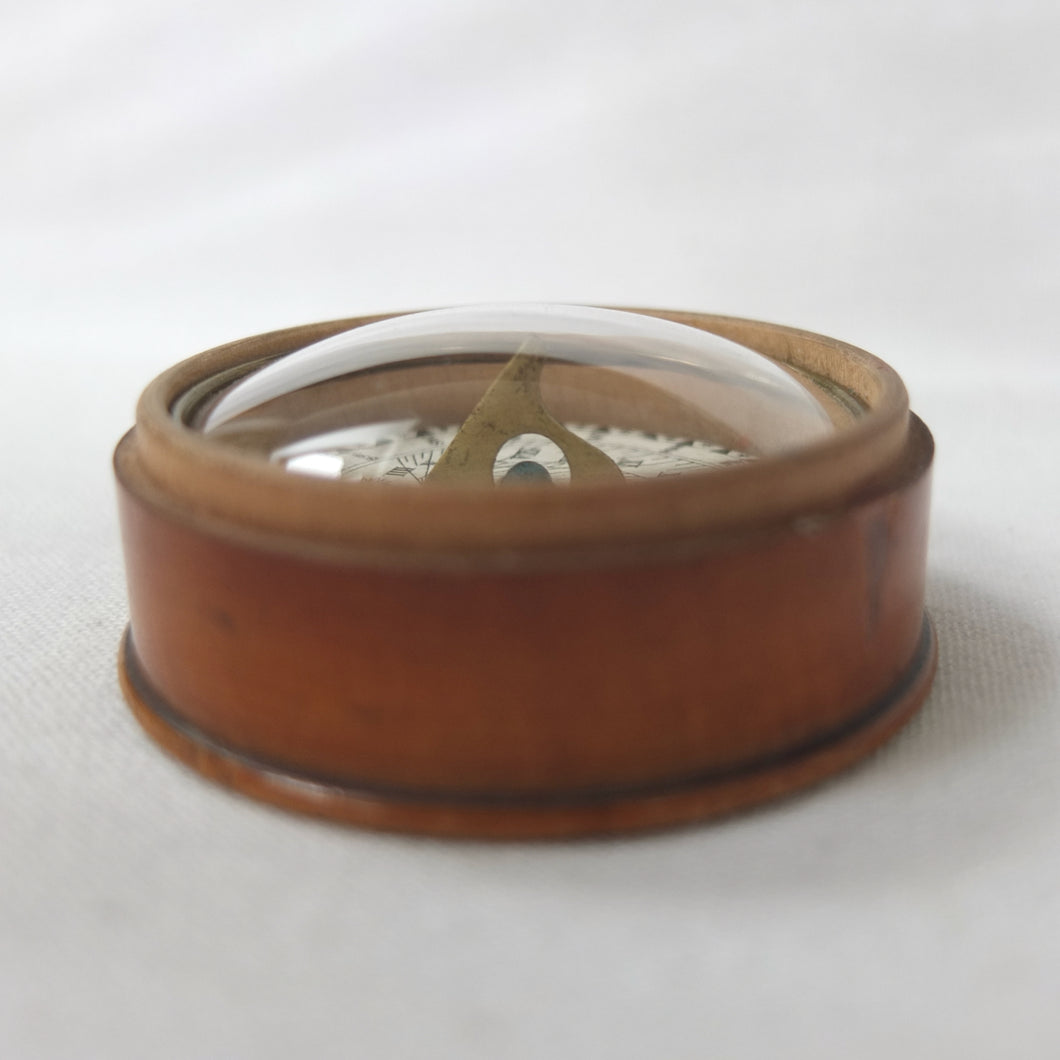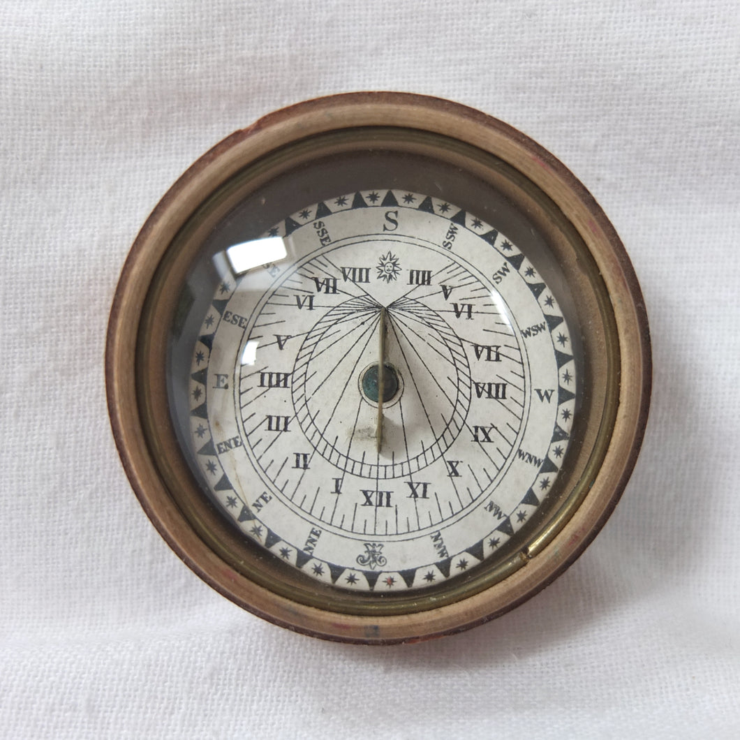 A Georgian or early Victorian wooden pocket sundial compass, also known as a 'Pantochronometer' or 'Magnetic Dial', dating from c.1840. The term pantochronometer was apparently coined in the early 19th century by Charles Essex & Co. of Clerkenwell, London. This particular type of floating sundial compass was patented by the London instrument maker Samuel Porter in 1824, who referred to these instruments as 'Magnetic Dials' and often labelled them to that effect on the base. Similar instruments are known to have been made in Europe in the late 18th century. Further details of the history of pocket sundials can be found at the excellent compassmuseum.com website.