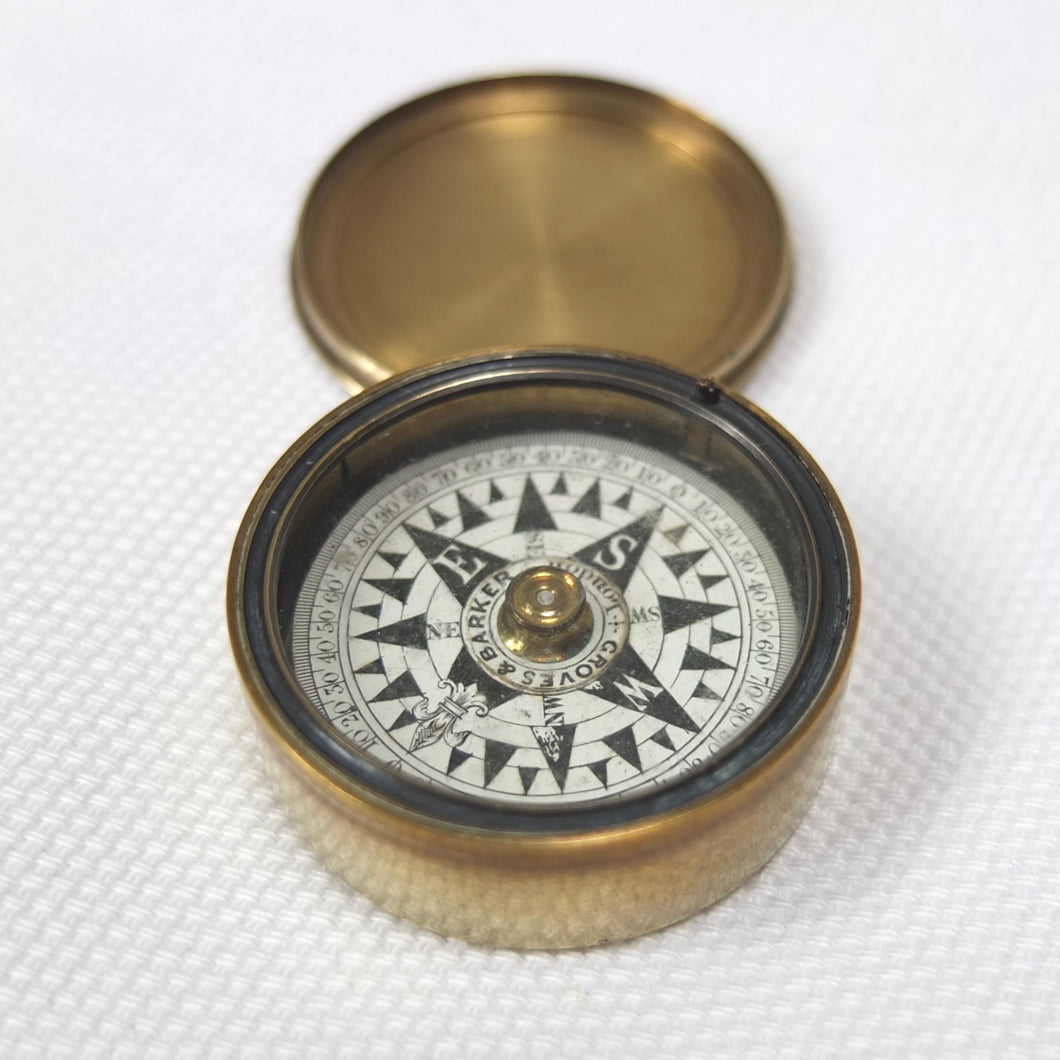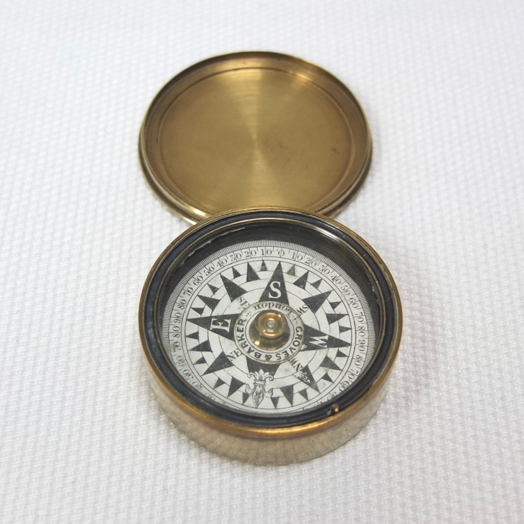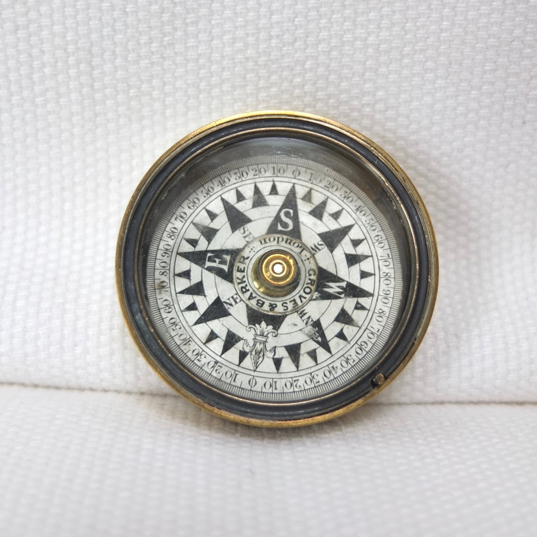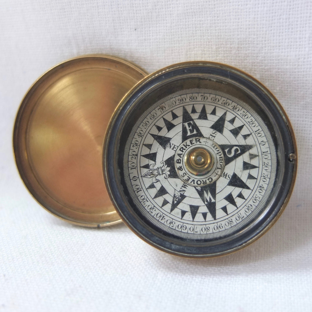 An extremely rare Groves & Barker early Victorian pocket compass, dating from c.1848. The compass is clearly signed on the card with the Groves & Barker name. This distinctive compass card design was used by Francis Barker for many years during the Victorian era, but compasses produced during his partnership with Richard Groves are very rare. They had both been apprenticed to the firm of J & G Simms in the latter part of the Georgian period, before going into business together in 1848. The compass has a brass box and lid, jewelled pivot, transit lock, and hand-drawn paper compass card.