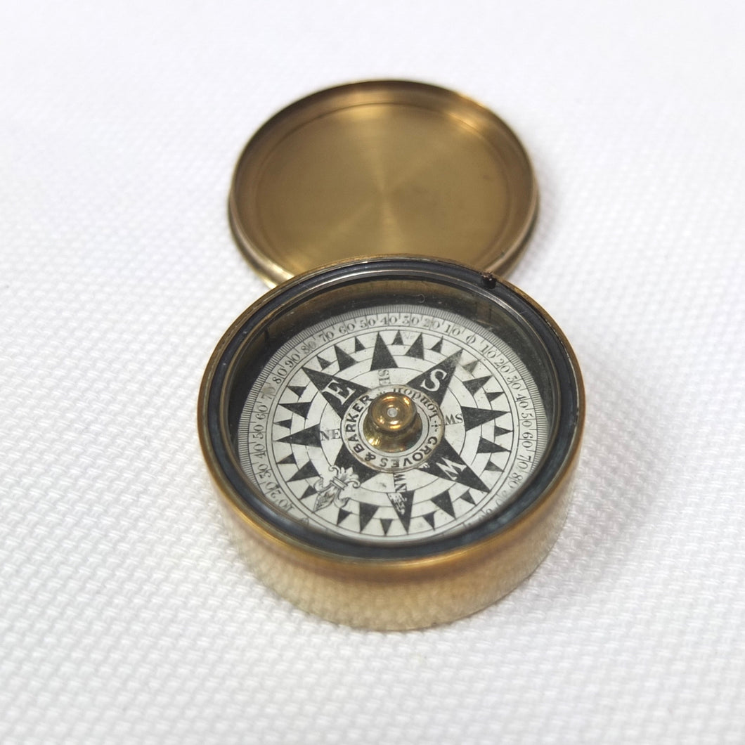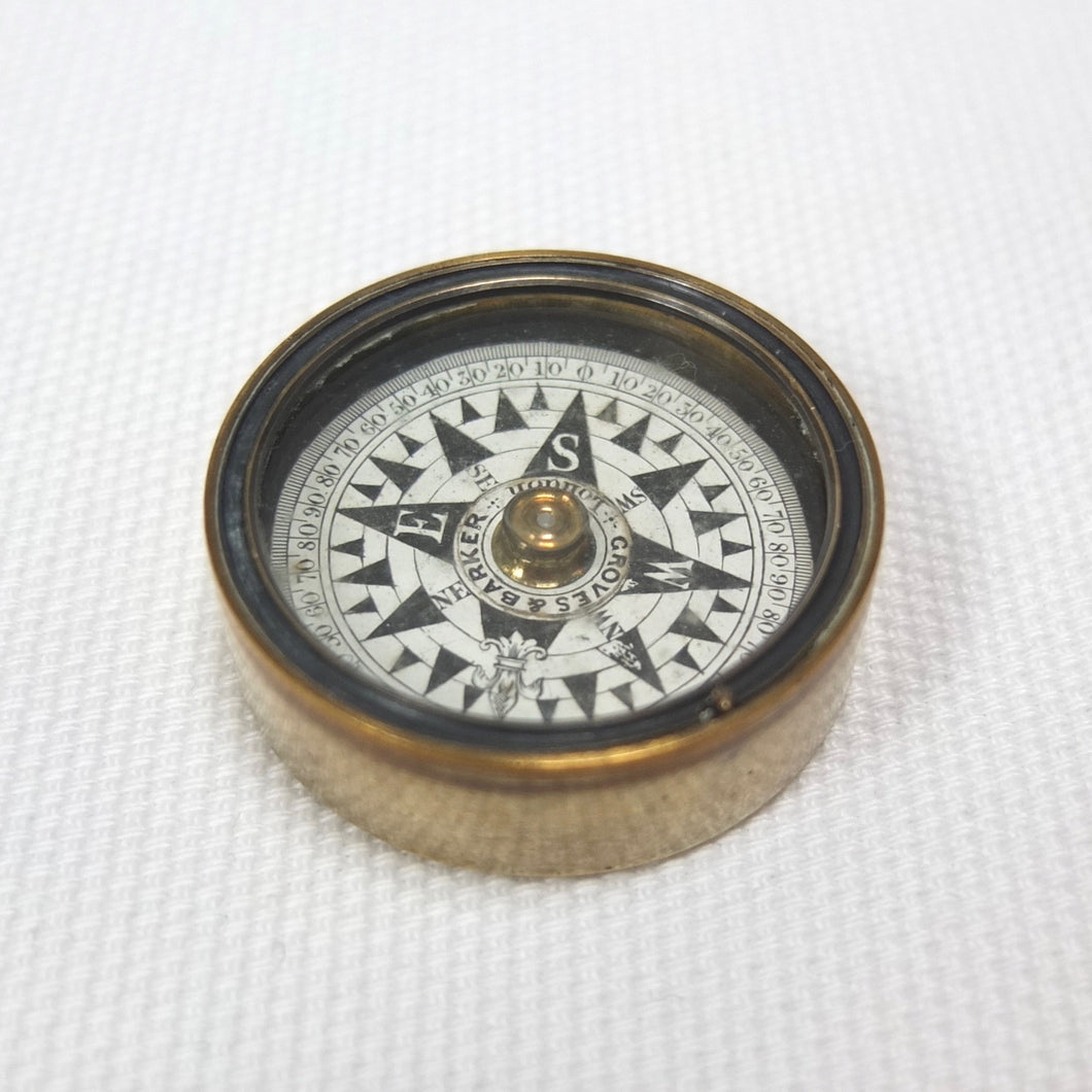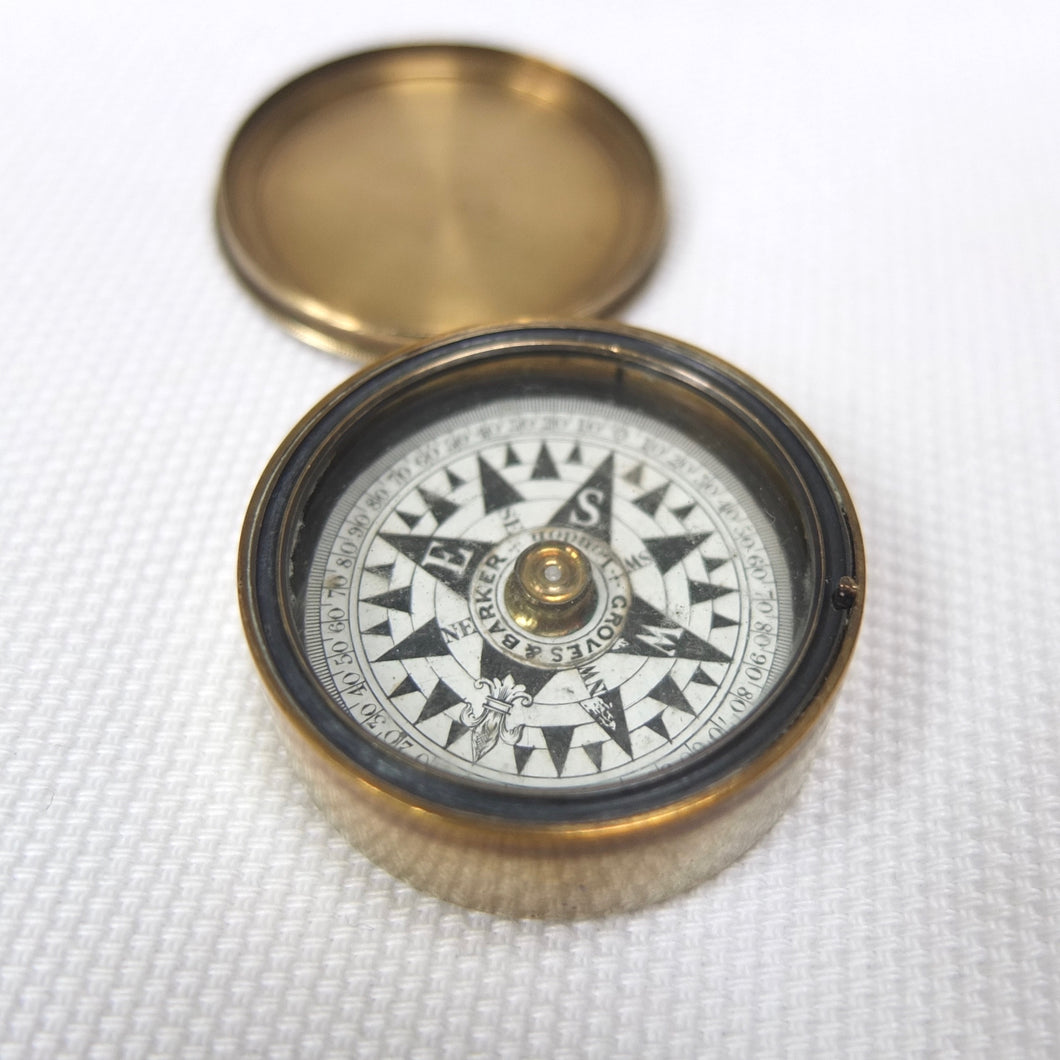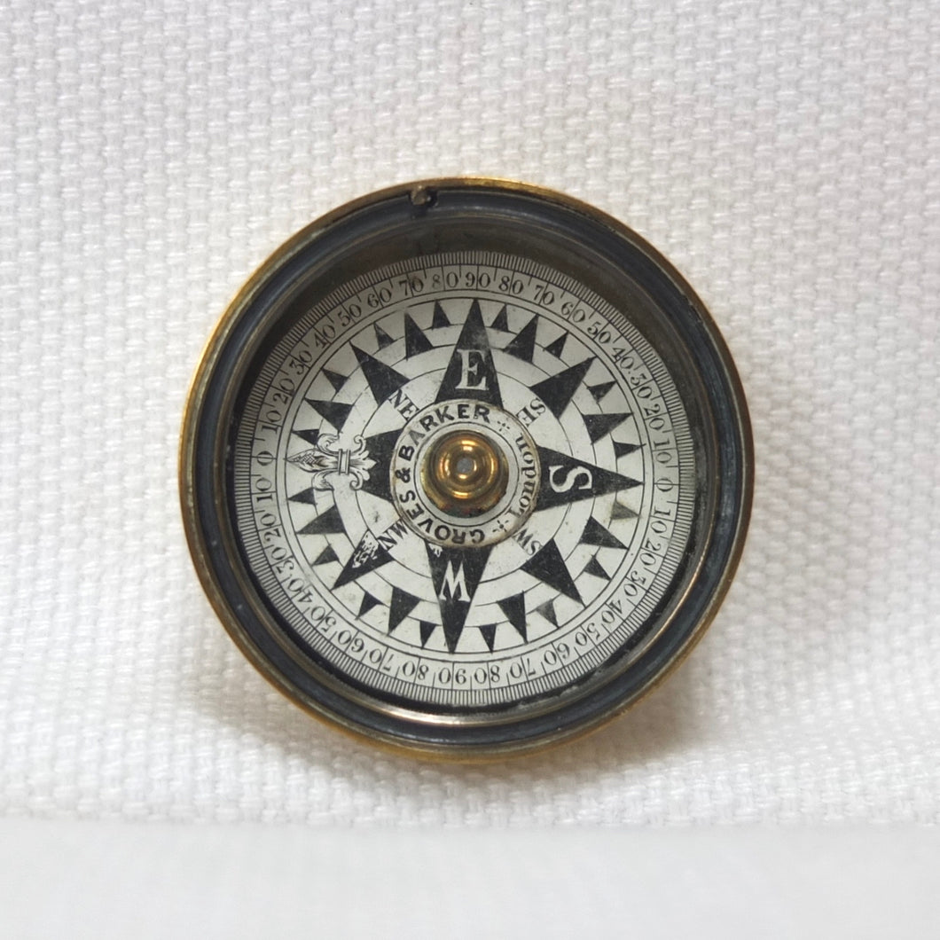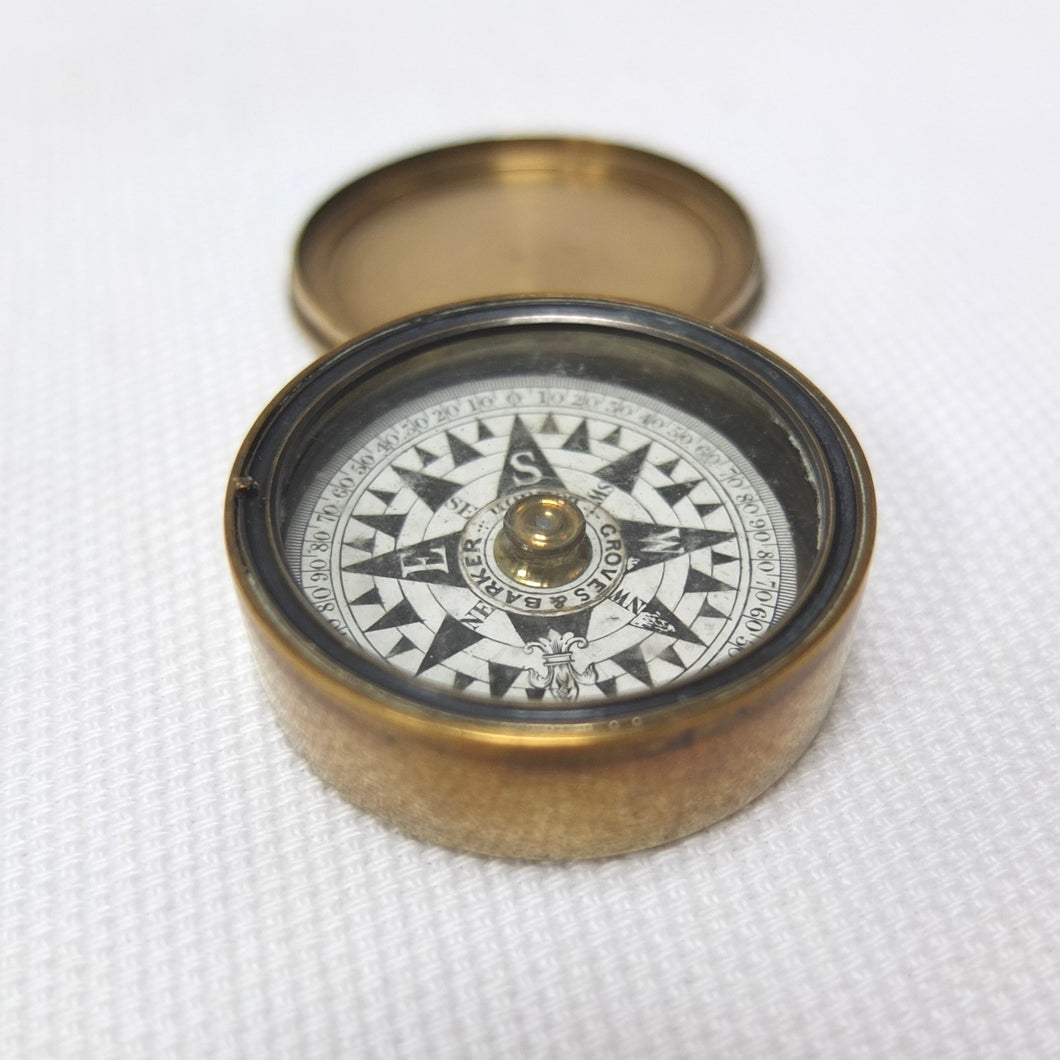An extremely rare Groves & Barker early Victorian pocket compass, dating from c.1848. The compass is clearly signed on the card with the Groves & Barker name. This distinctive compass card design was used by Francis Barker for many years during the Victorian era, but compasses produced during his partnership with Richard Groves are very rare. They had both been apprenticed to the firm of J & G Simms in the latter part of the Georgian period, before going into business together in 1848. The compass has a brass box and lid, jewelled pivot, transit lock, and hand-drawn paper compass card.