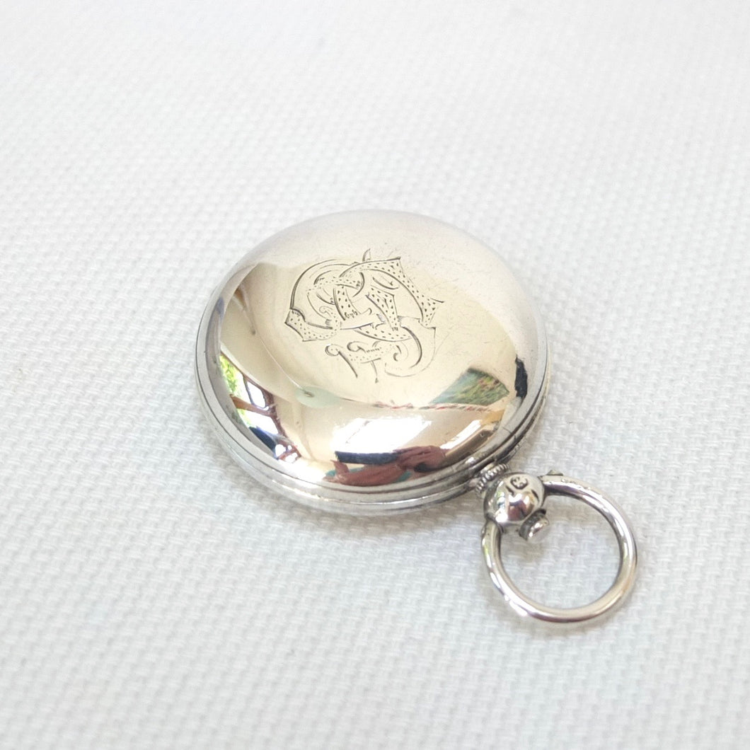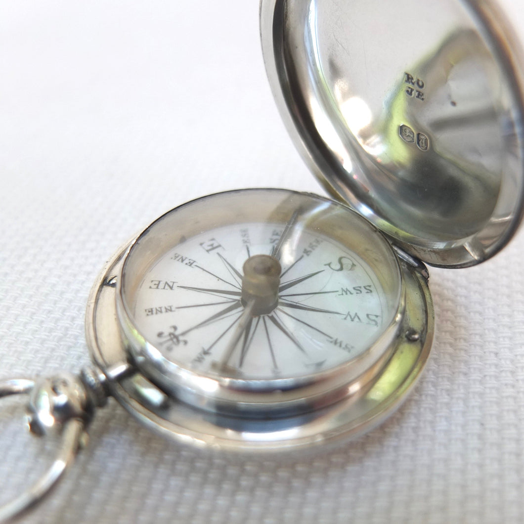 A rare and beautifully made sterling silver early Victorian pocket compass, dating from 1856. The compass has a silver hunter case, hallmarked for London 1856, English bar needle, jewelled pivot, and hand-painted Georgian style enamel compass card. The case has the maker's mark of Richard Oliver and John Edwards, case makers who worked in Galway Street, London from 1846 - 1859. Richard James Oliver was first recorded as working in Galway Street in 1845. Oliver was in partnership at this address with John Edwards and they traded as Oliver and Edwards. The maker's mark 'RO' over 'JE' was first registered at the London Assay Office in 1846. When the partnership was dissolved in 1859, Richard Oliver continued in business at the same address until 1876, when he moved to 1 Northampton Square, Clerkenwell. In 1895 he relocated to 31 Wynyatt Street, Clerkenwell. From 1903 the business was carried on by his son Albert Thomas Oliver. Oliver's business never used modern industrial techniques or machines, continuing to make cases by hand in the old-fashioned way, until the business eventually closed in 1970. The tools and techniques used by the Olivers were a relic of the Georgian era, and they would have been familiar to watch case makers of the eighteenth century.