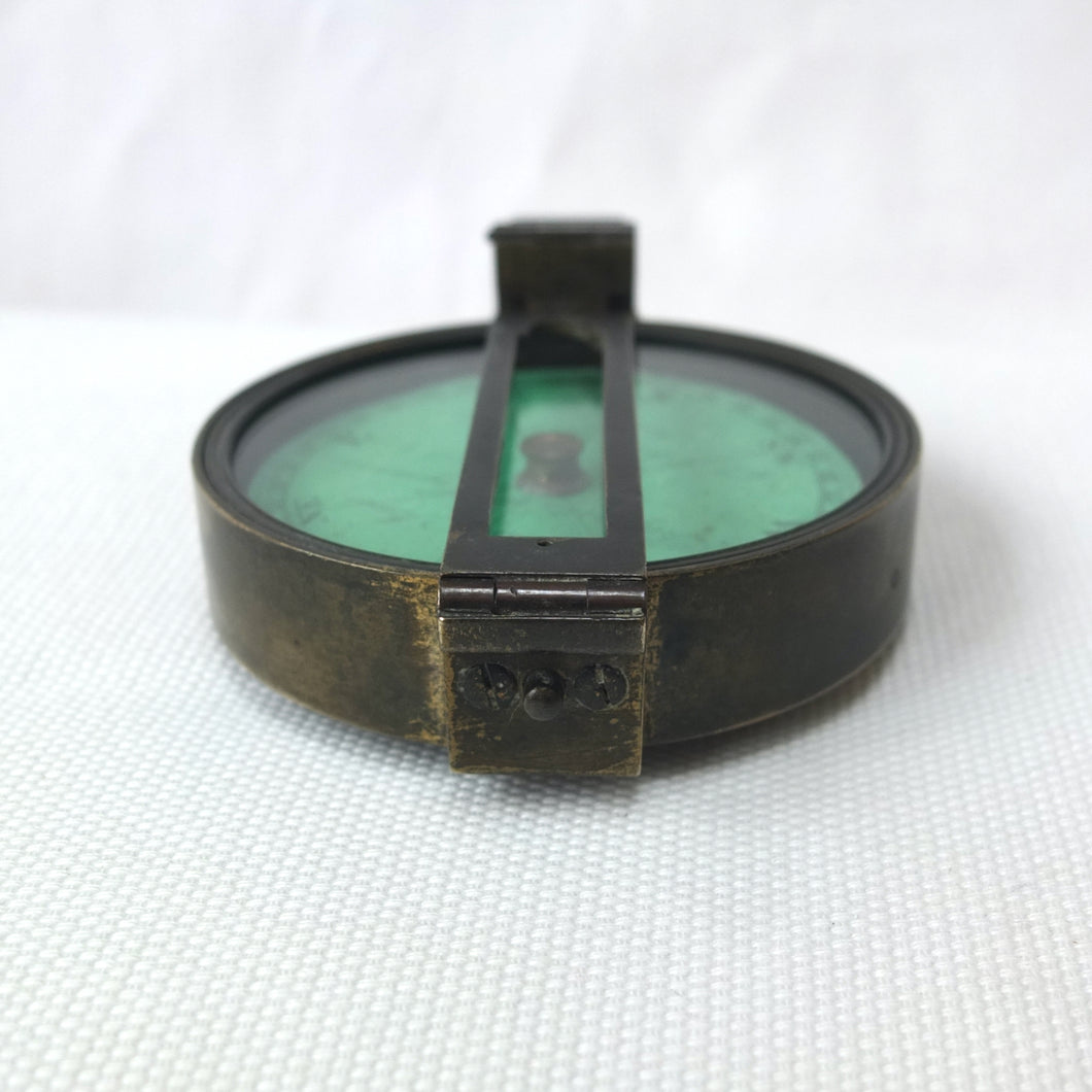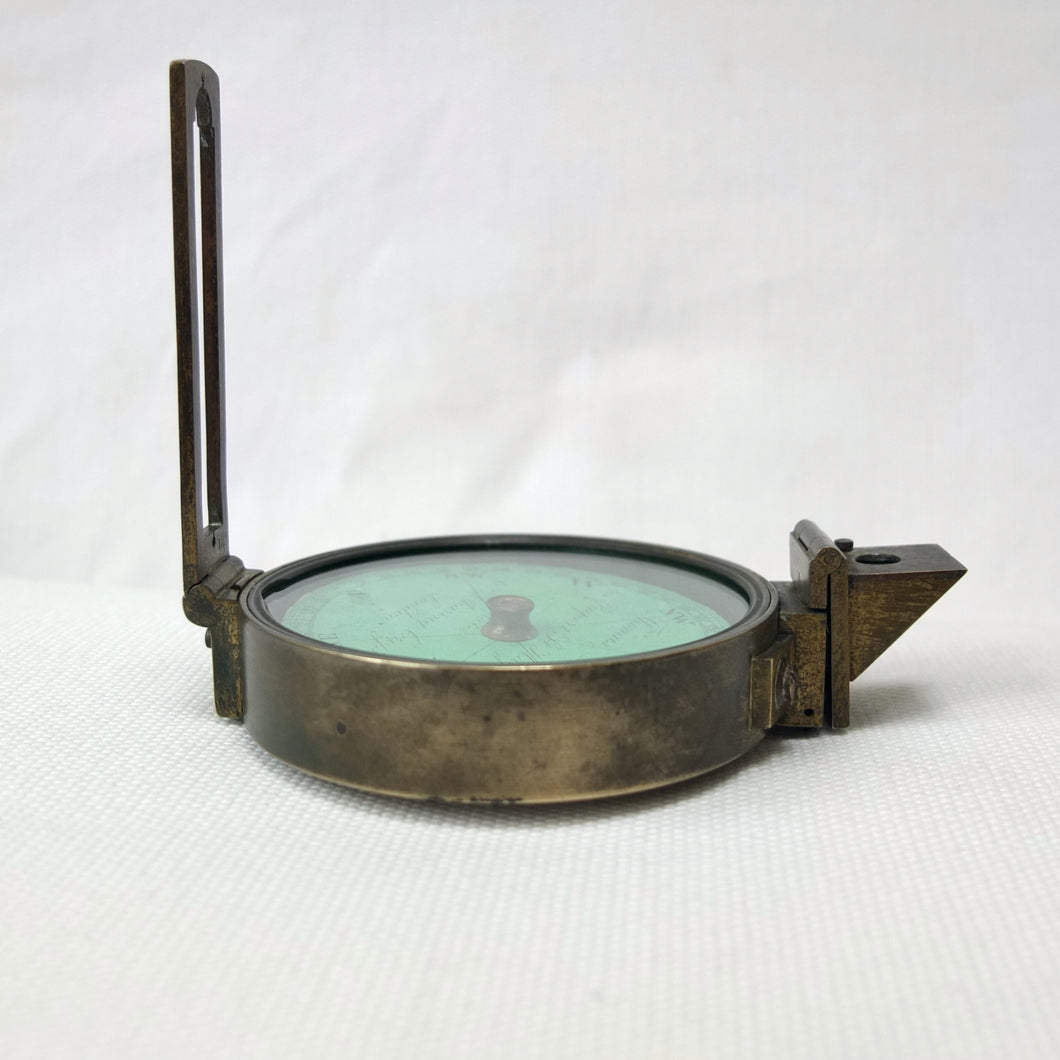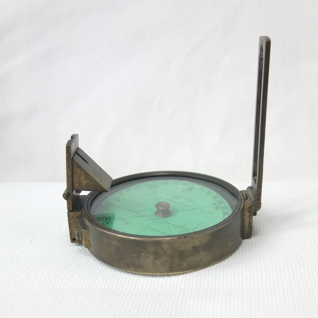 In good condition, and full working order. The compass finds North well. The glass, sighting vane, prism and compass card are in good condition. The case would originally have had a blackened or 'bronzed' finish - some of this finish is still present, but much has worn away over time, revealing the brass underneath.