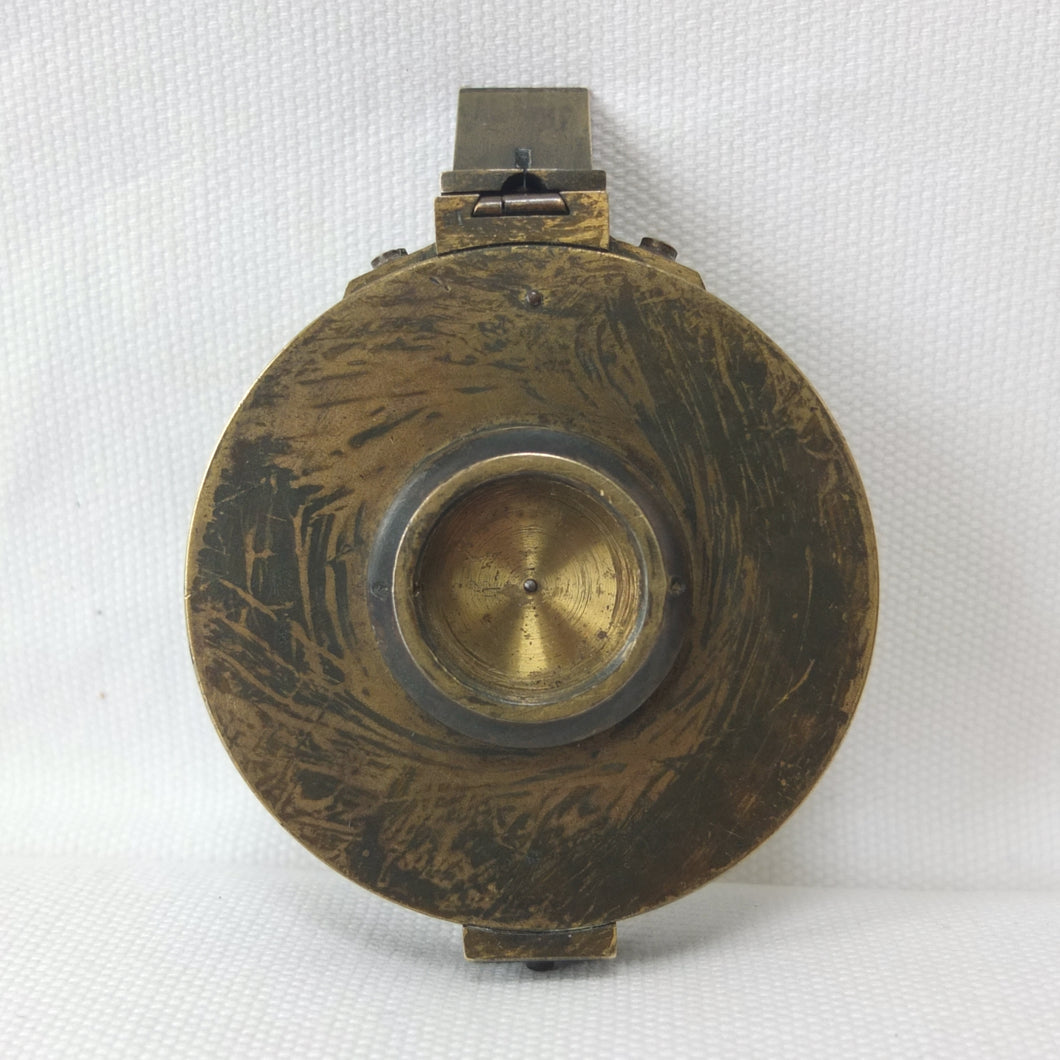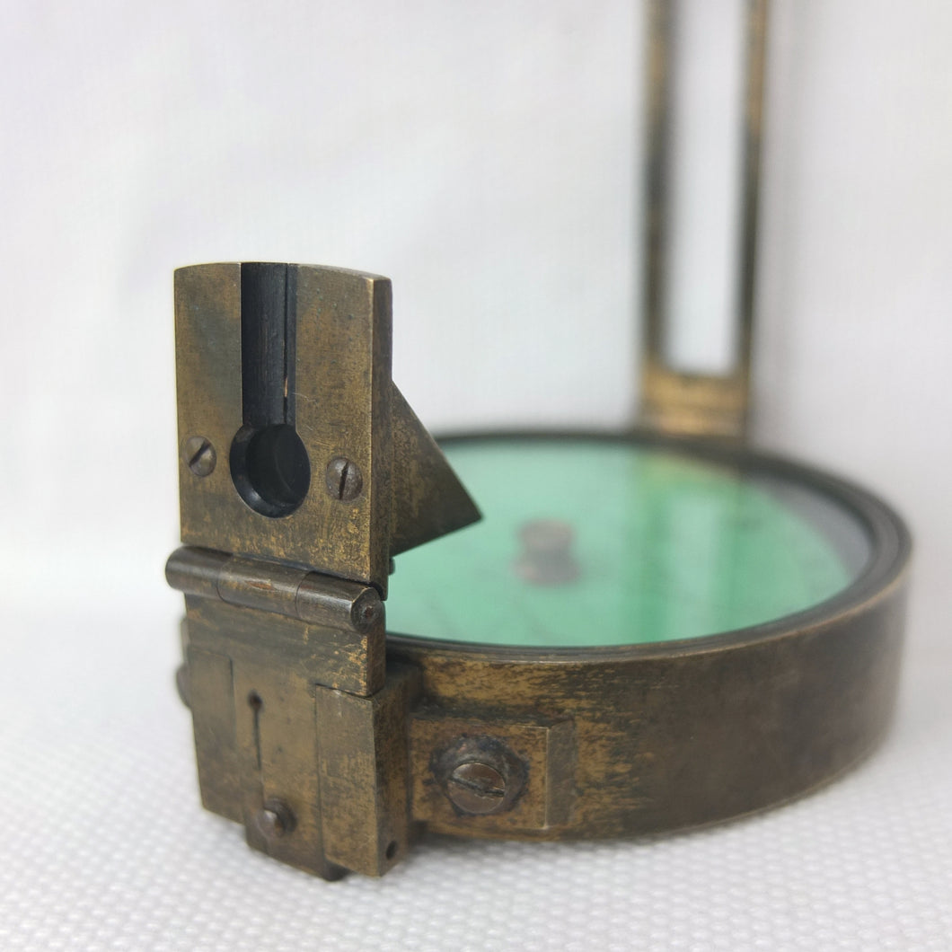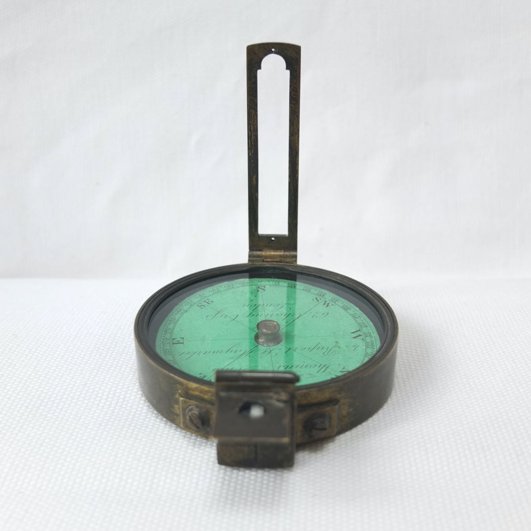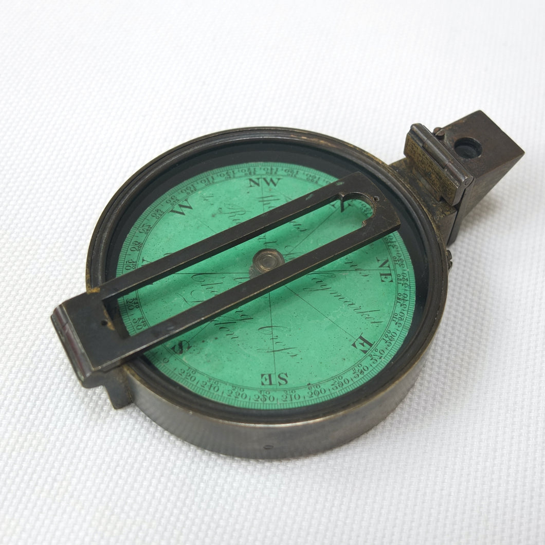 In good condition, and full working order. The compass finds North well. The glass, sighting vane, prism and compass card are in good condition. The case would originally have had a blackened or 'bronzed' finish - some of this finish is still present, but much has worn away over time, revealing the brass underneath.
