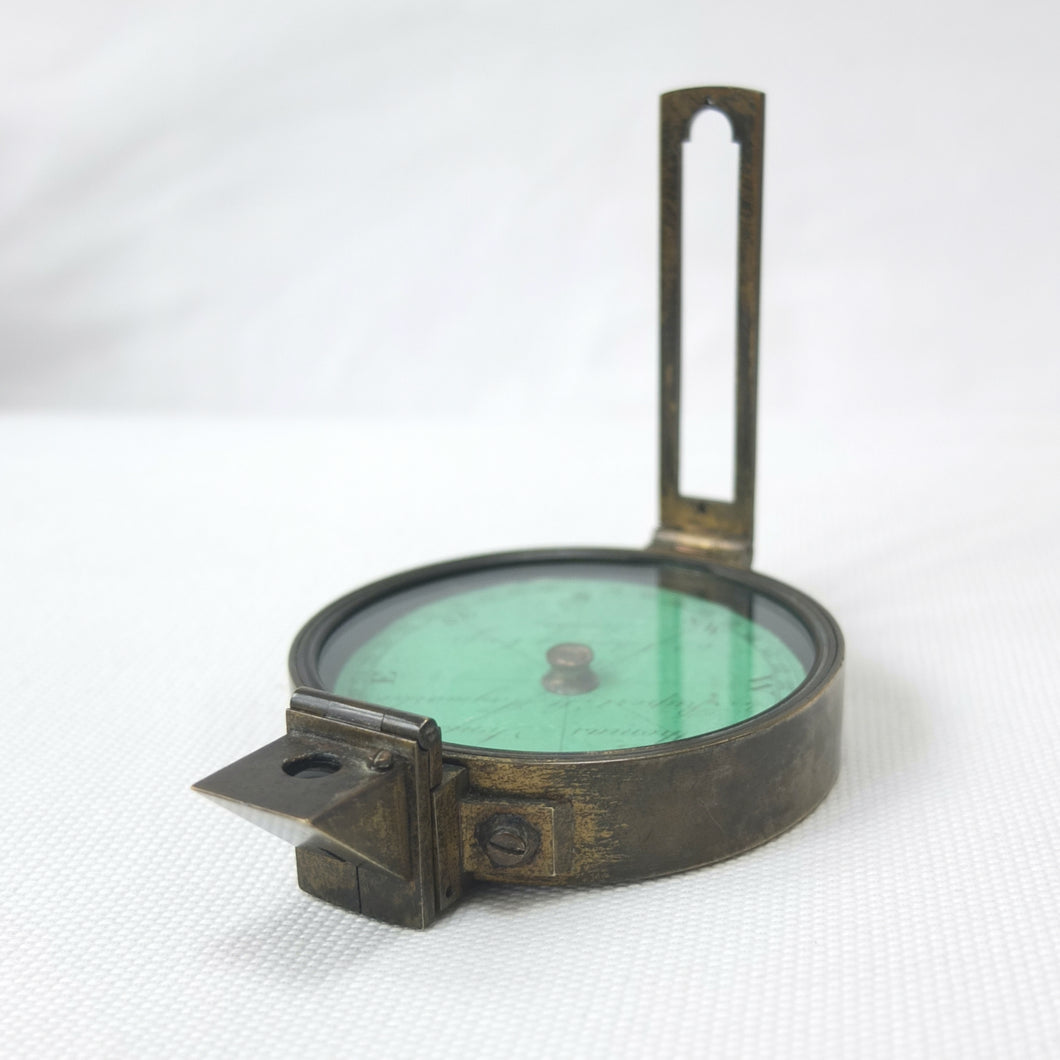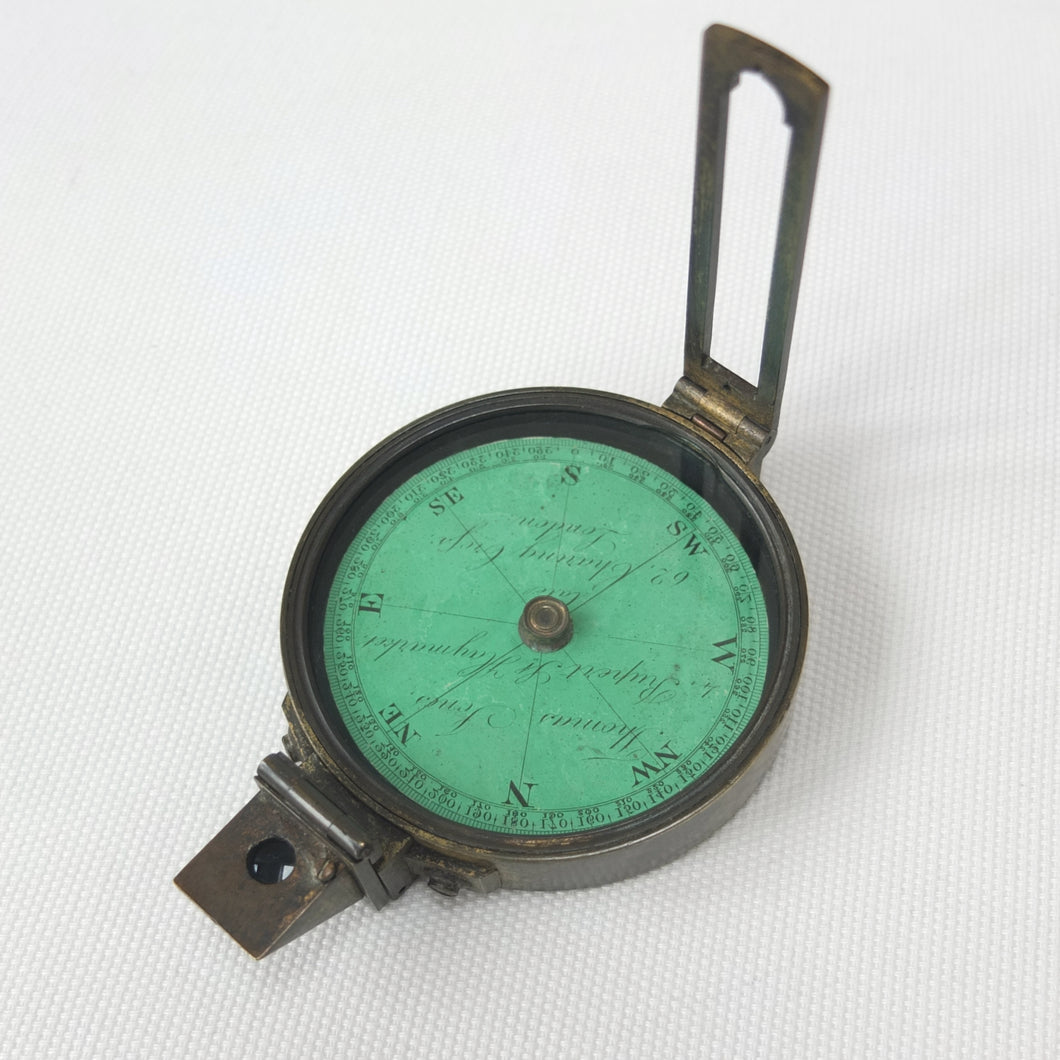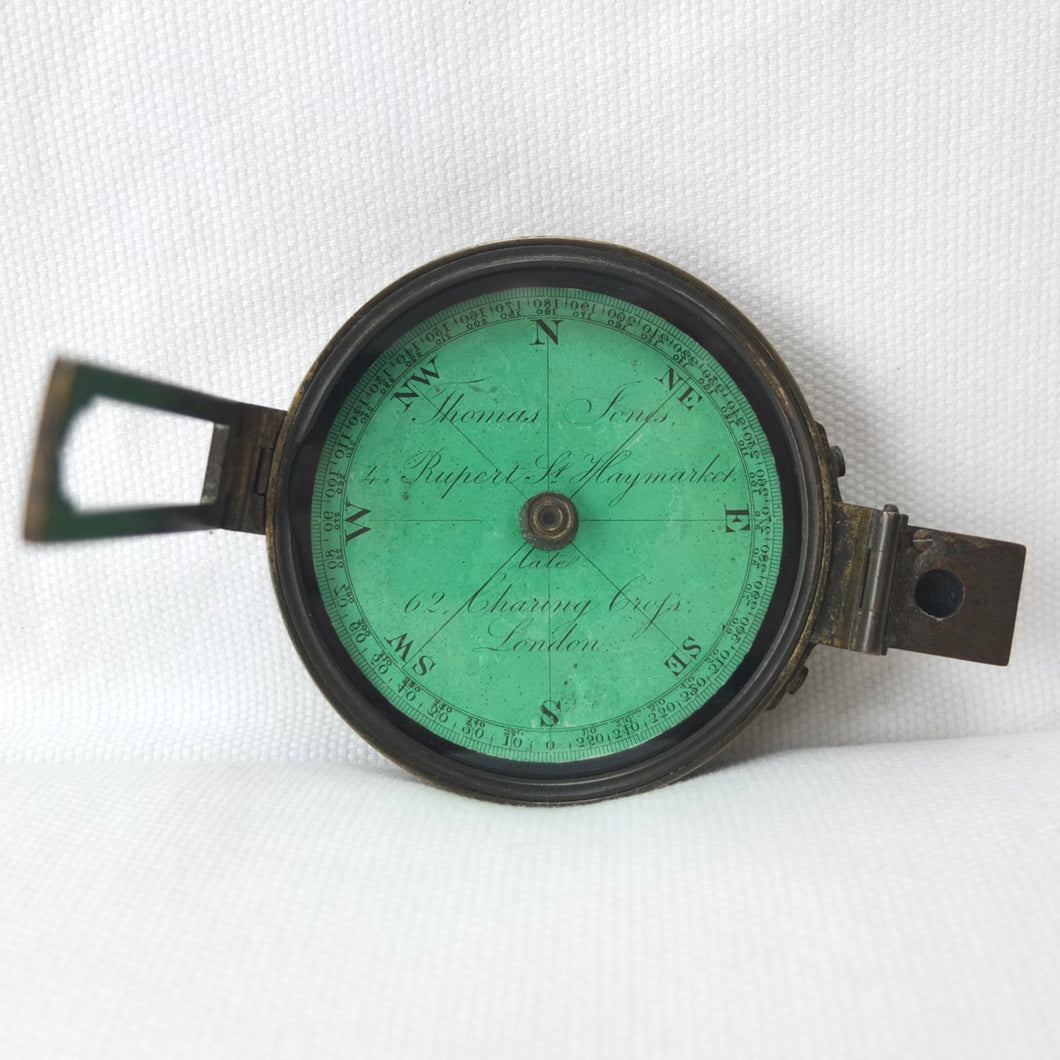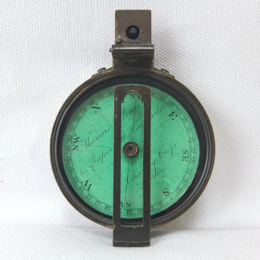 A Schmalcalder-type prismatic surveying compass, made in London between 1850 and 1852 by Thomas Jones, one of the finest scientific instrument makers of the Georgian and early Victorian eras. The compass card is signed 'Thomas Jones, 4 Rupert St, Haymarket, Late 62, Charing Cross, London'. It is possible to date this compass very accurately, as Thomas Jones moved his business to Rupert Street in 1850, and remained there until his death in 1852. The compass is very much in the style of Jones' earlier Georgian work - he made the first prismatic compasses for Charles Schmalcalder, who had patented the design in 1812. Featuring a hand-drawn green compass card, lacquered brass case with prism and vane sights, transit lock, and manual brake. There is a screw-threaded tripod mounting fixed to the base of the compass case. The case would originally have had a bronzed finish - some of this finish is still present, but much has worn away over time, revealing the brass underneath.