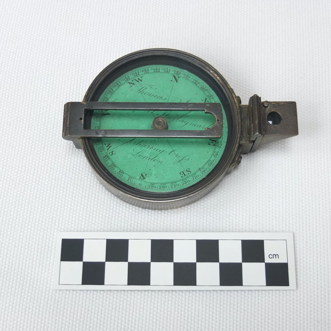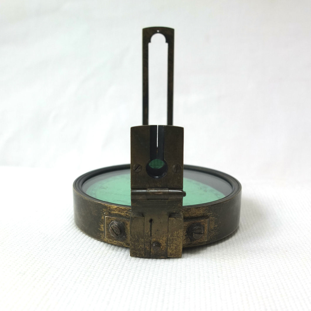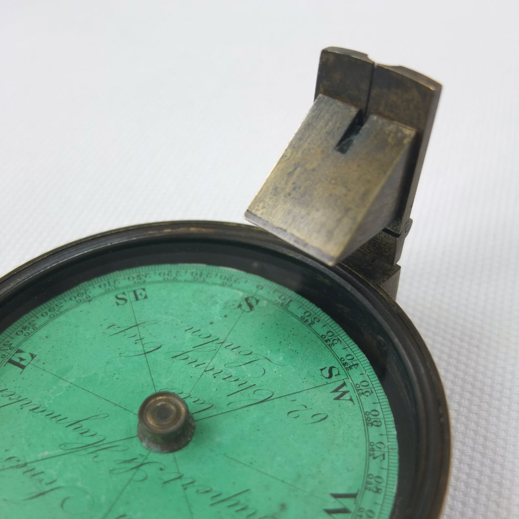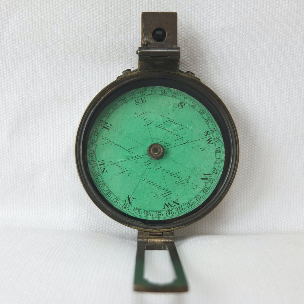 A Schmalcalder-type prismatic surveying compass, made in London between 1850 and 1852 by Thomas Jones, one of the finest scientific instrument makers of the Georgian and early Victorian eras. The compass card is signed 'Thomas Jones, 4 Rupert St, Haymarket, Late 62, Charing Cross, London'. It is possible to date this compass very accurately, as Thomas Jones moved his business to Rupert Street in 1850, and remained there until his death in 1852. The compass is very much in the style of Jones' earlier Georgian work - he made the first prismatic compasses for Charles Schmalcalder, who had patented the design in 1812. Featuring a hand-drawn green compass card, lacquered brass case with prism and vane sights, transit lock, and manual brake. There is a screw-threaded tripod mounting fixed to the base of the compass case. The case would originally have had a bronzed finish - some of this finish is still present, but much has worn away over time, revealing the brass underneath.