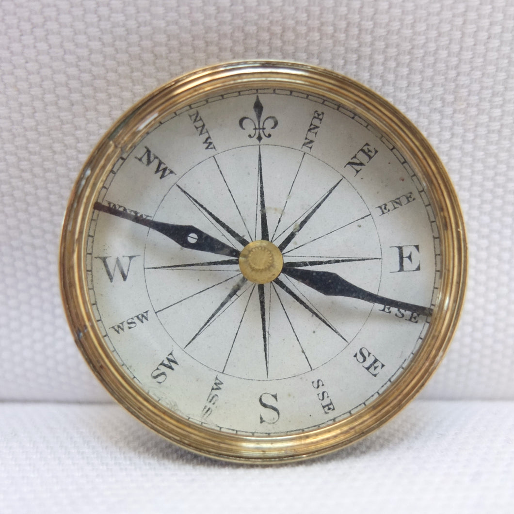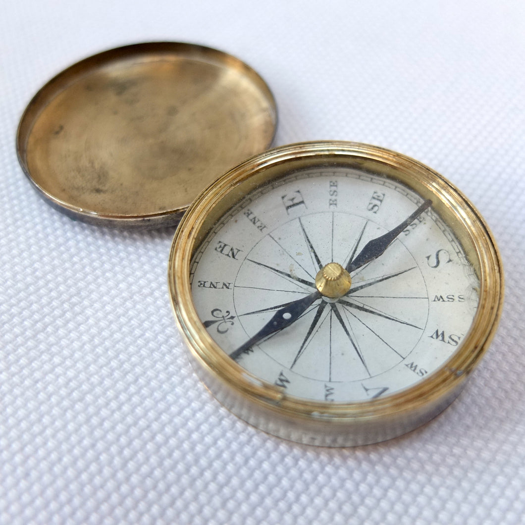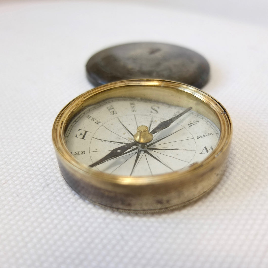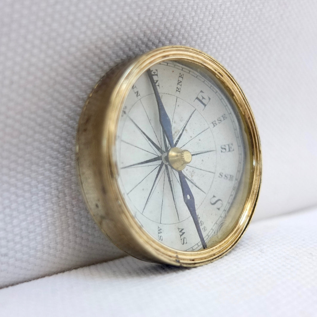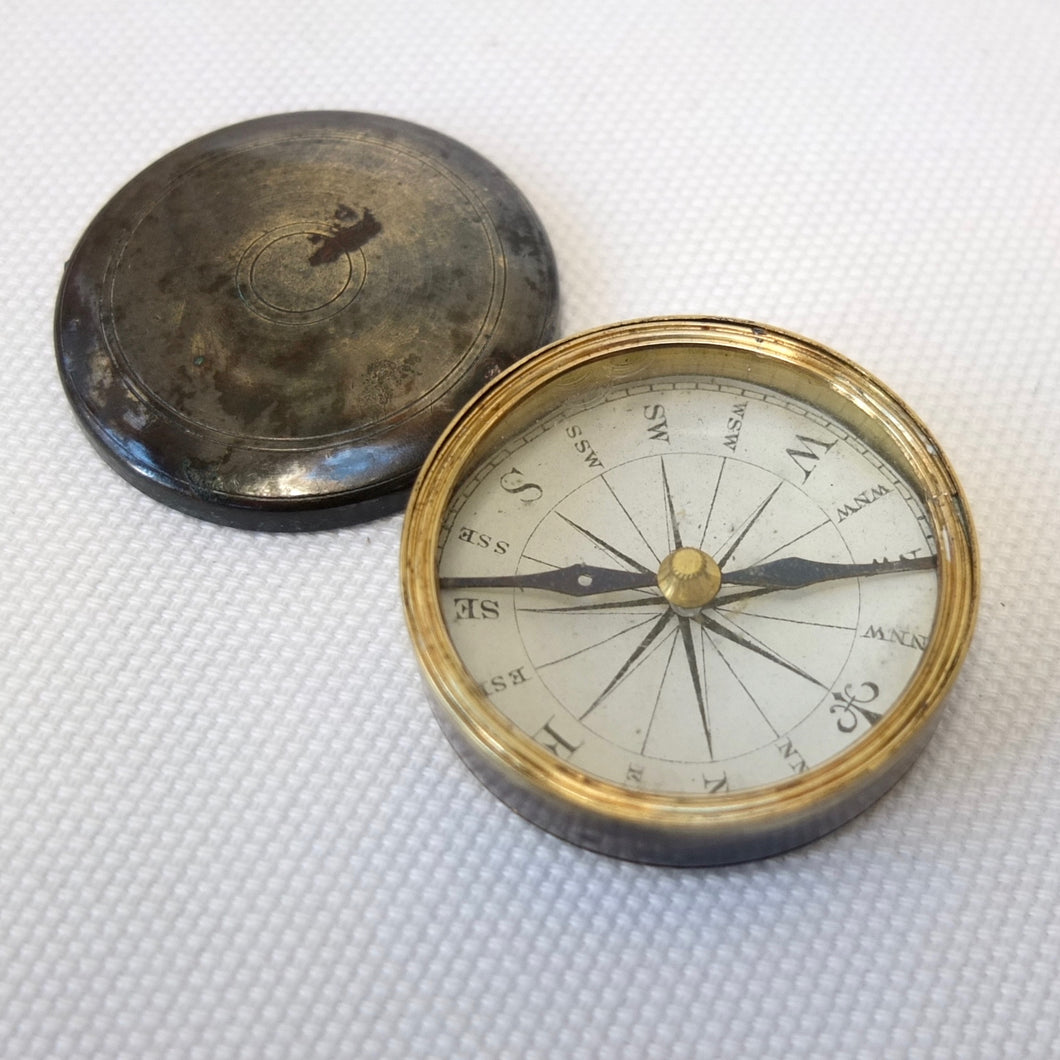 A Georgian or Victorian Brass box English pocket compass, with a press-fit lid, dating from c.1840-1860. The brass lid has developed a very unusual gunmetal-coloured patina. With a paper compass card, finely made blued needle, and a brass pivot. The compass is in working order and finds North well. The compass retains its original glass, which has a slight bruise at SW. The paper compass card has become warped over time and has lifted away from the bottom of the case. This can cause the needle to stick temporarily, but a quick shake gets it moving again.