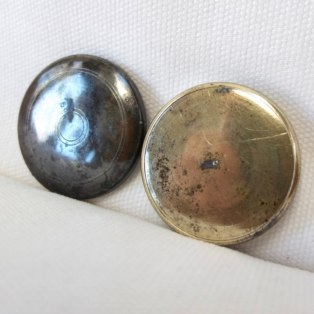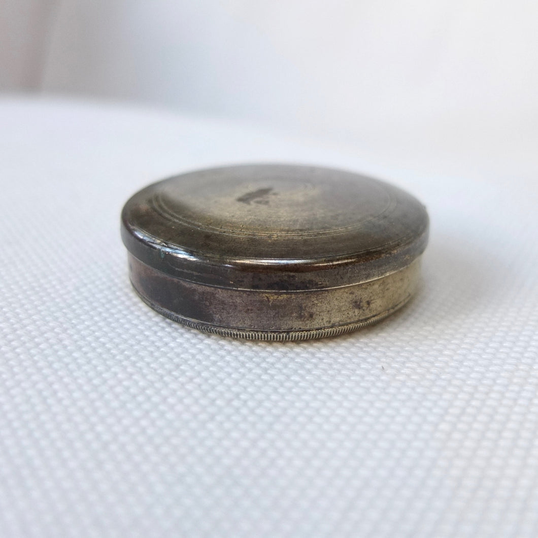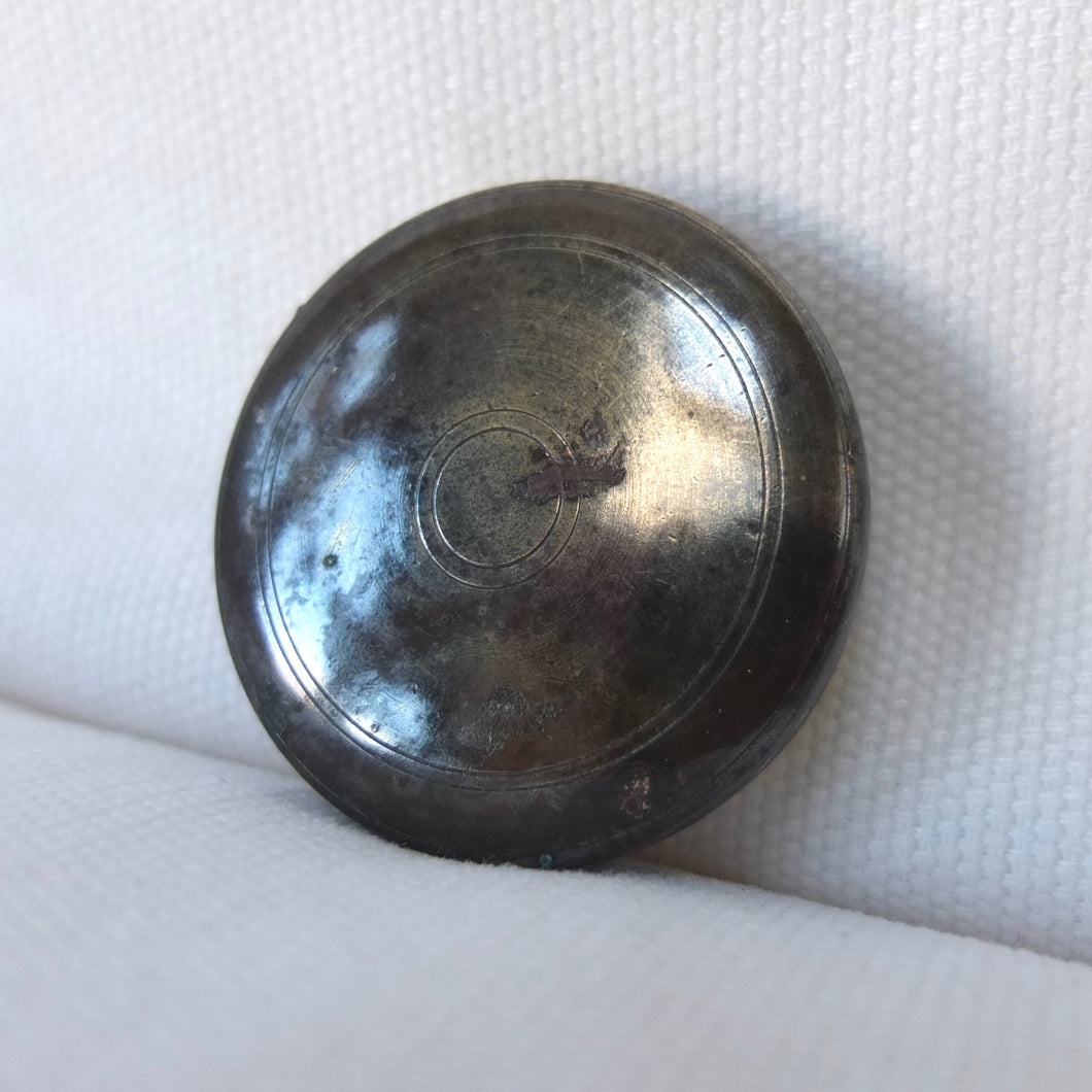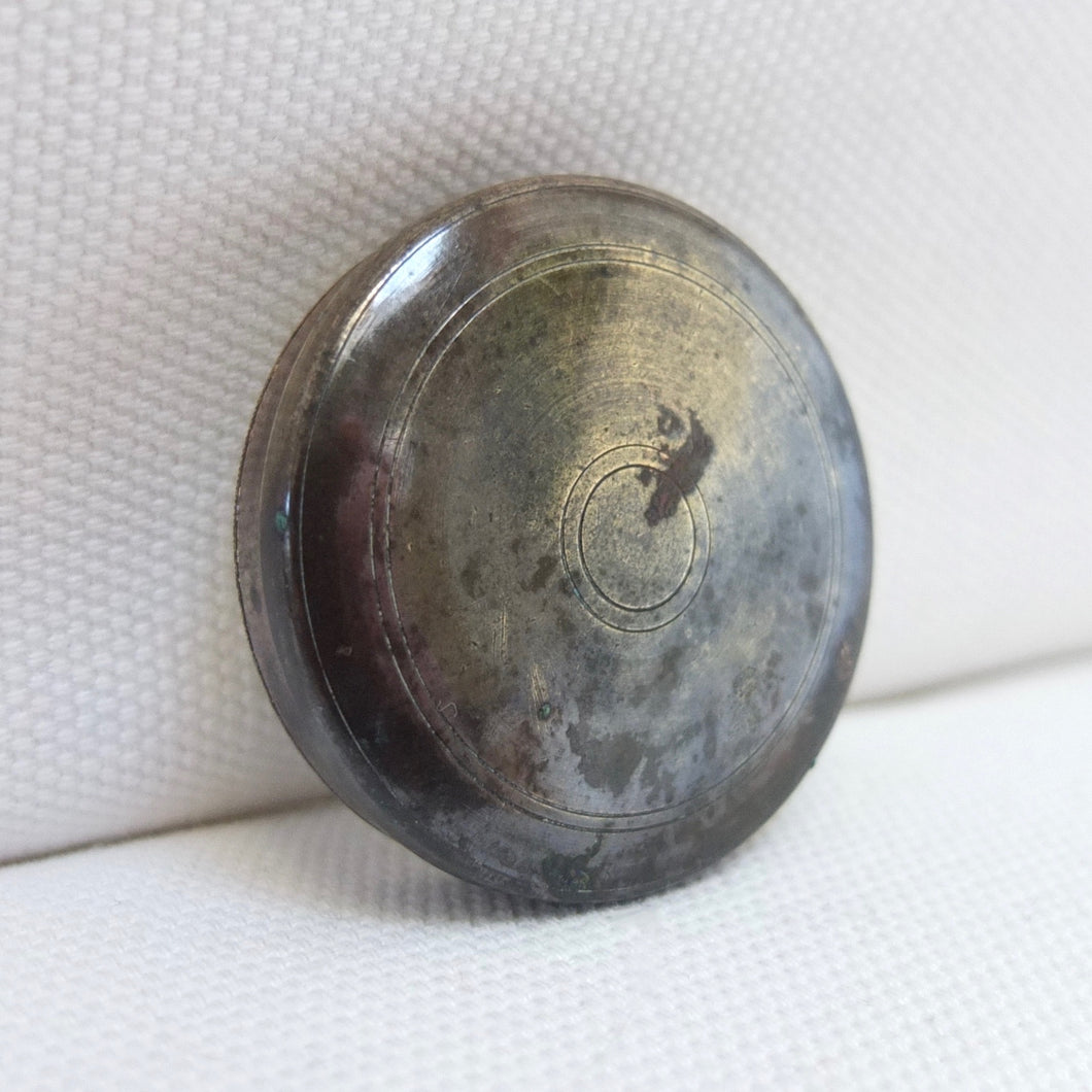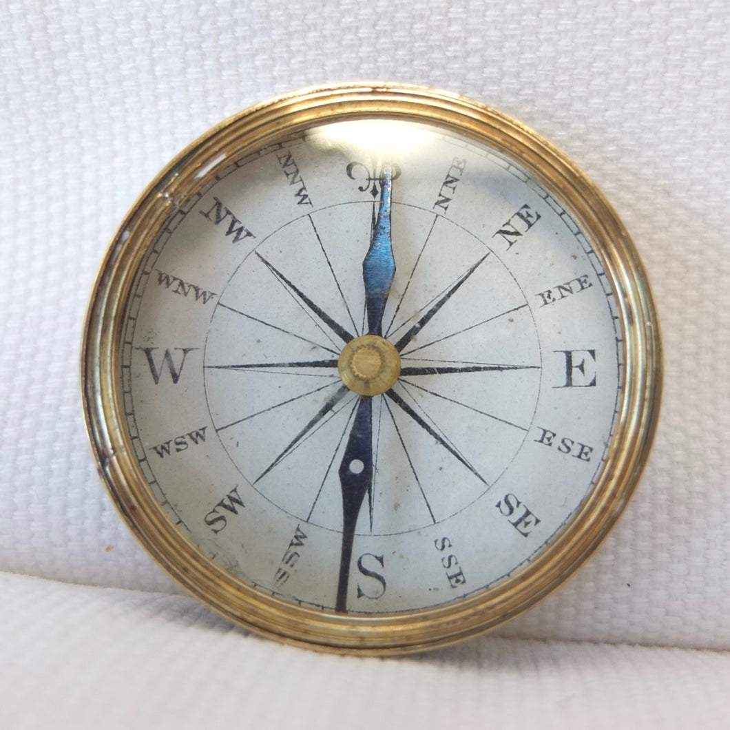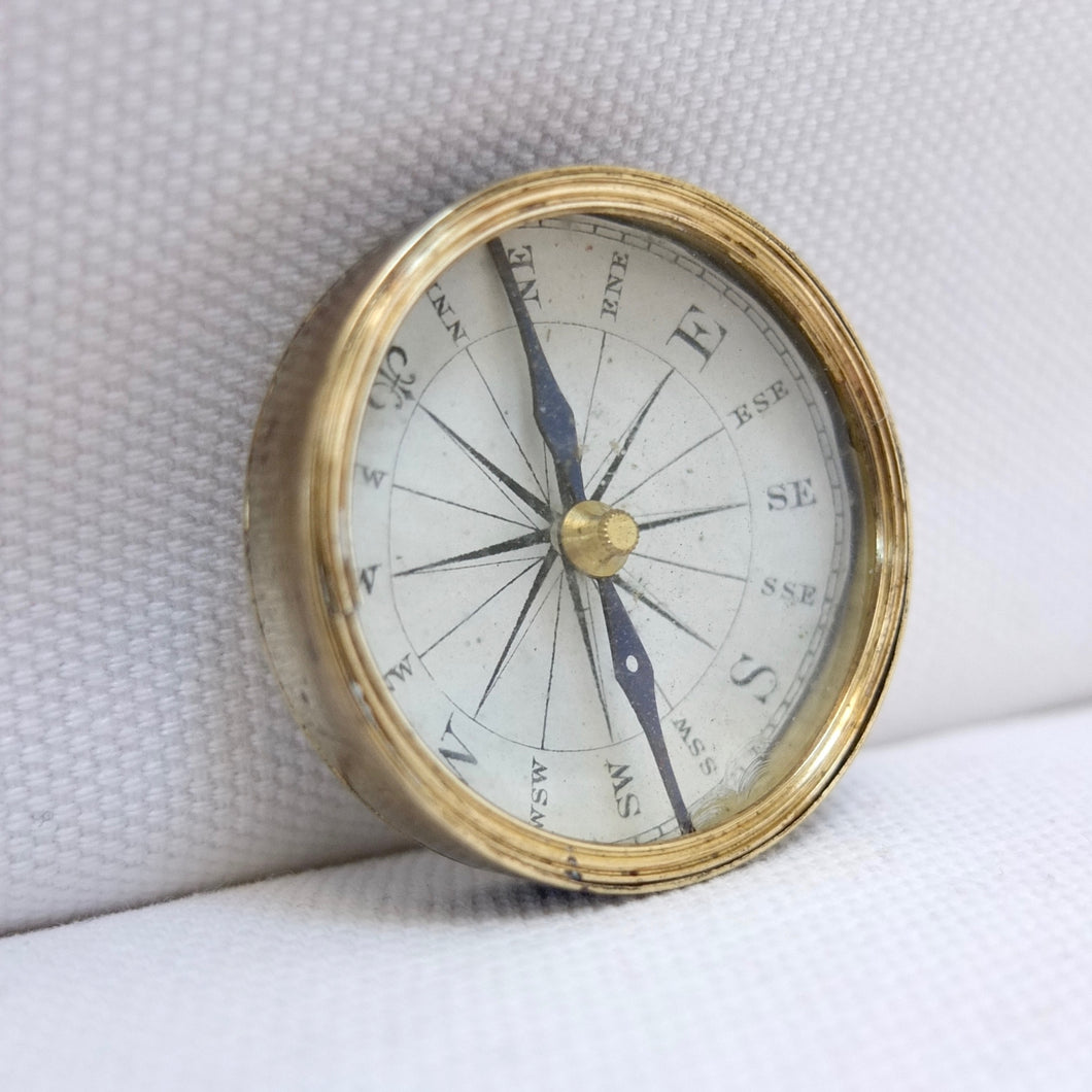 A Georgian or Victorian Brass box English pocket compass, with a press-fit lid, dating from c.1840-1860. The brass lid has developed a very unusual gunmetal-coloured patina. With a paper compass card, finely made blued needle, and a brass pivot. The compass is in working order and finds North well. The compass retains its original glass, which has a slight bruise at SW. The paper compass card has become warped over time and has lifted away from the bottom of the case. This can cause the needle to stick temporarily, but a quick shake gets it moving again.
