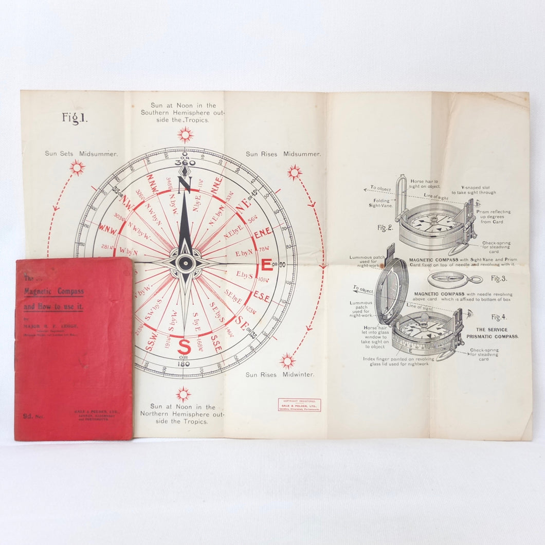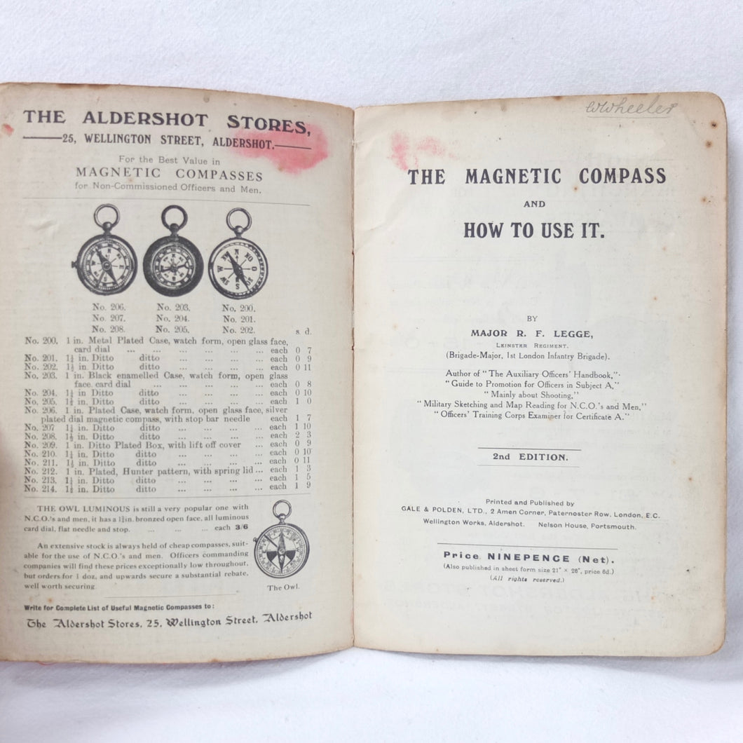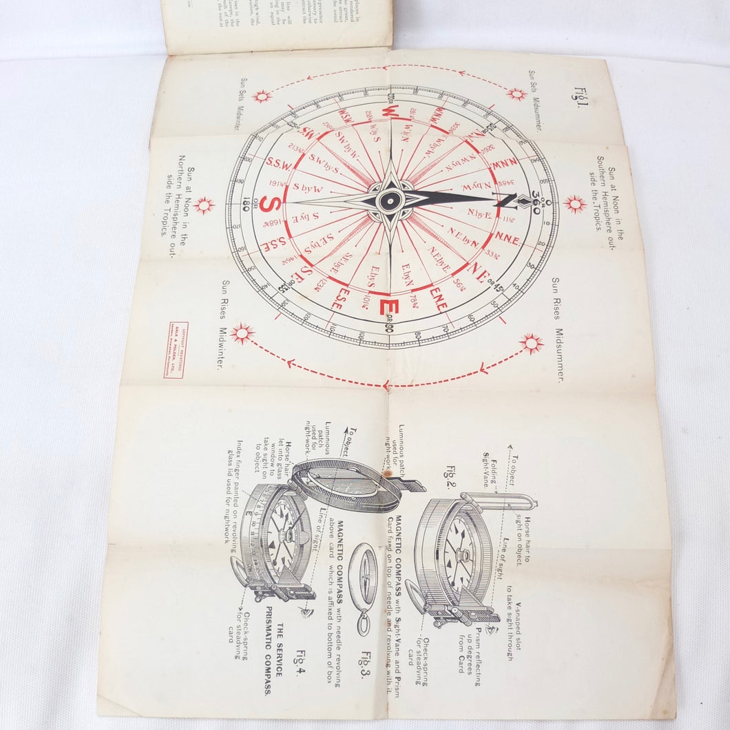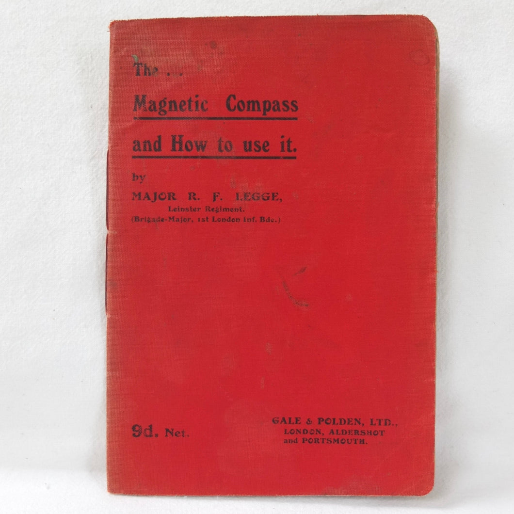 An original WW1 British military compass manual covering the use of the service compass, undated, but first published by Gale & Polden in 1909. This 2nd edition is from c.1914. A concise and practical manual, written for military use, the book is illustrated with a large folding coloured compass rose diagram and illustrations of the prismatic service compass.