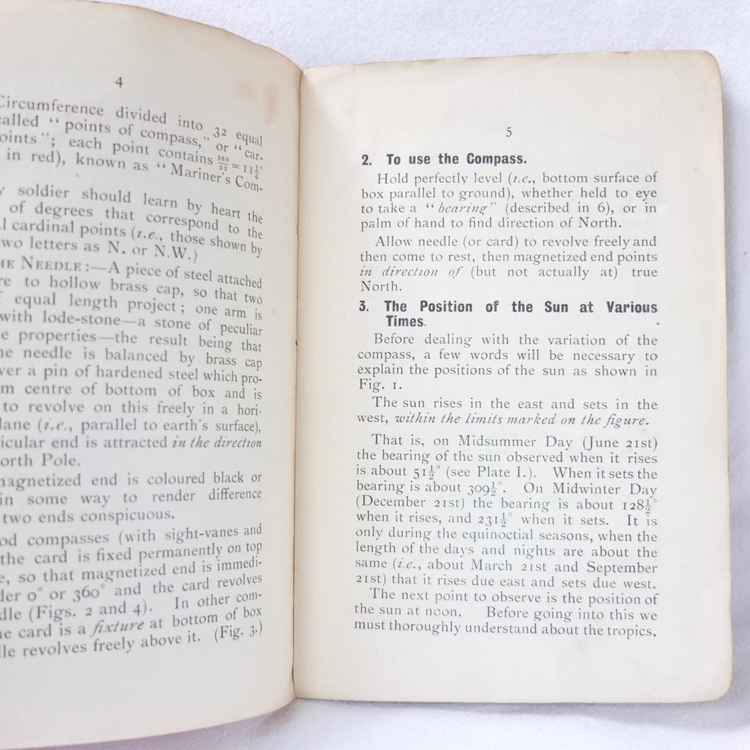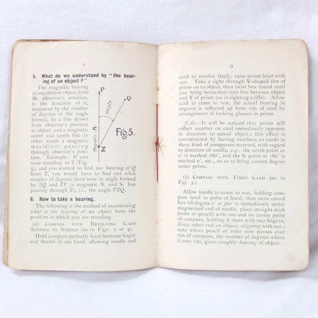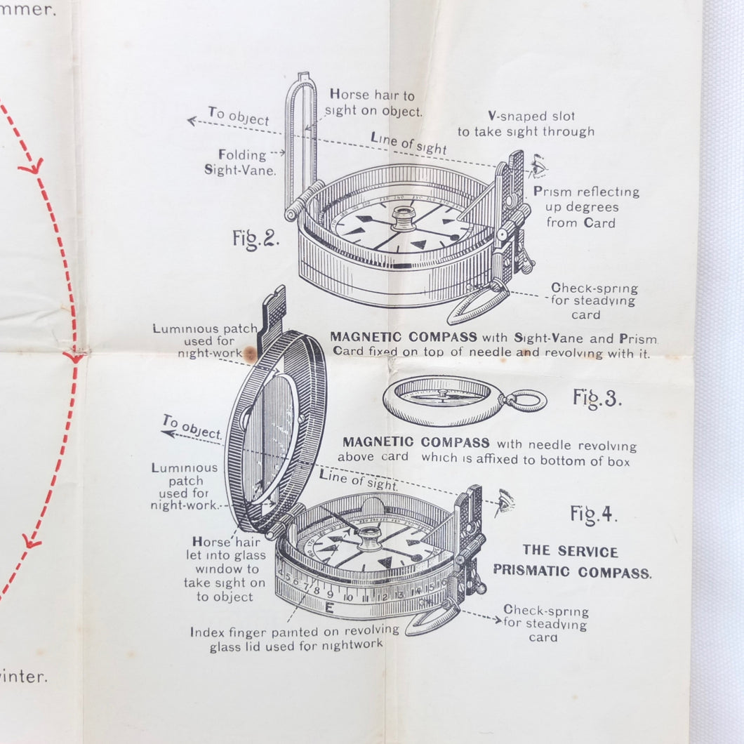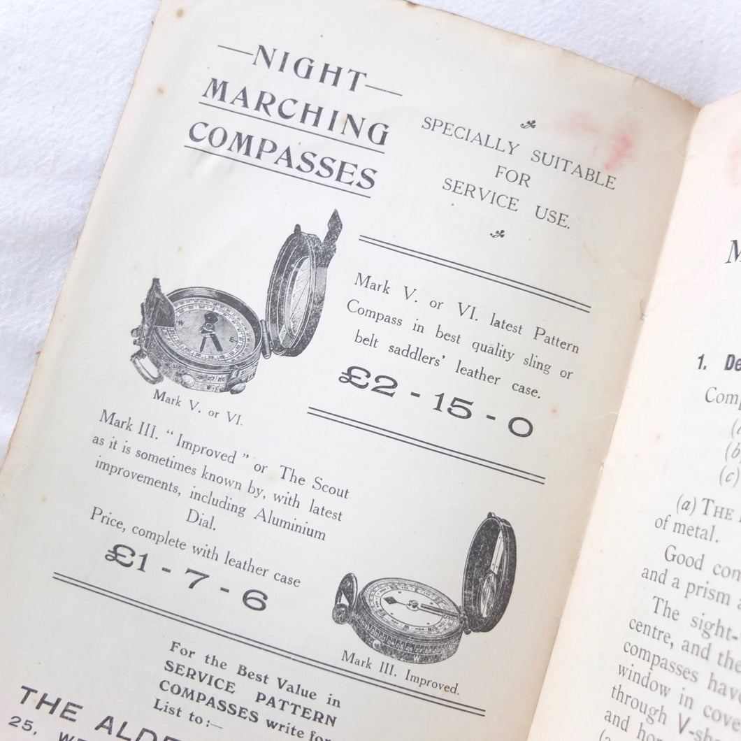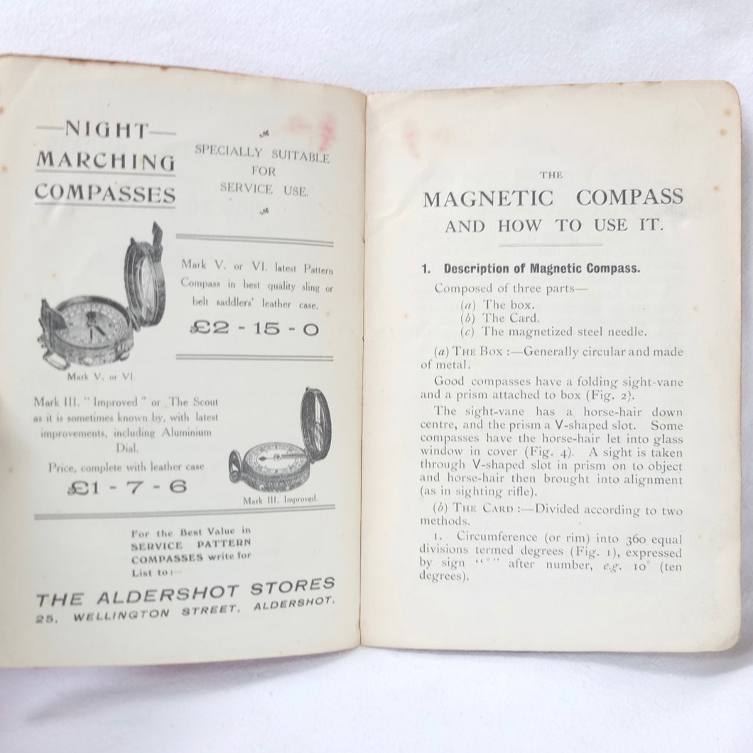 An original WW1 British military compass manual covering the use of the service compass, undated, but first published by Gale & Polden in 1909. This 2nd edition is from c.1914. A concise and practical manual, written for military use, the book is illustrated with a large folding coloured compass rose diagram and illustrations of the prismatic service compass.