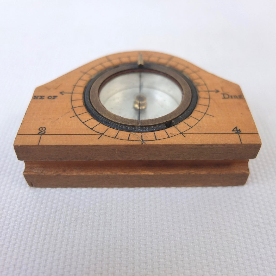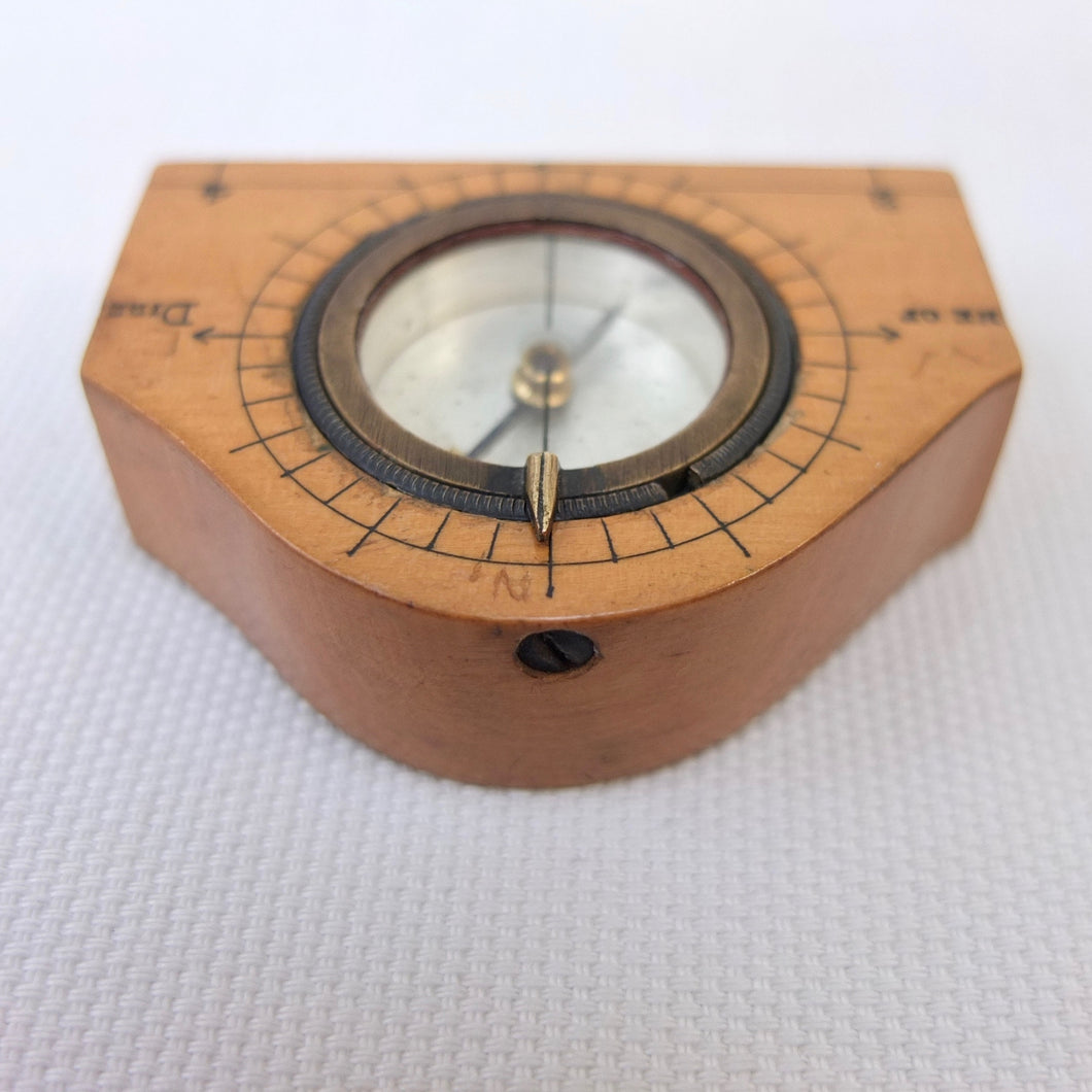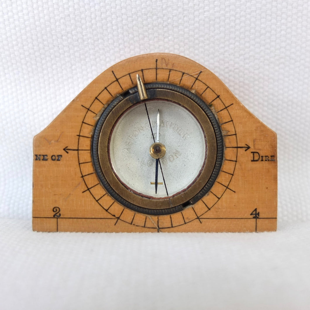 A trench art compass, derived from a WW1 Cavalry Sketching board, made by Aston & Mander of Soho, London, c.1914. This compass and its wooden surround have been carefully removed from their original position at the top edge of an Aston & Mander sketching board. Various other designs of Cavalry sketching board were being produced around this time, including those by Lt-Col. Willoughby Verner, J. H. Steward, and Houghton's. The compass is signed by Aston & Mander.