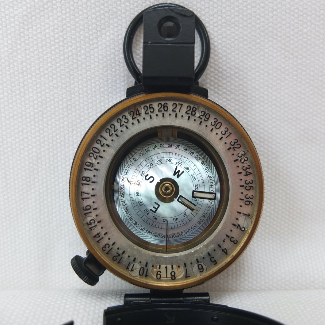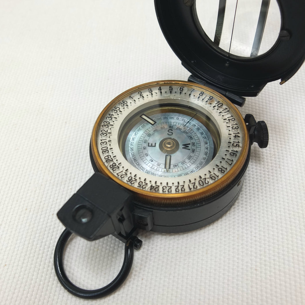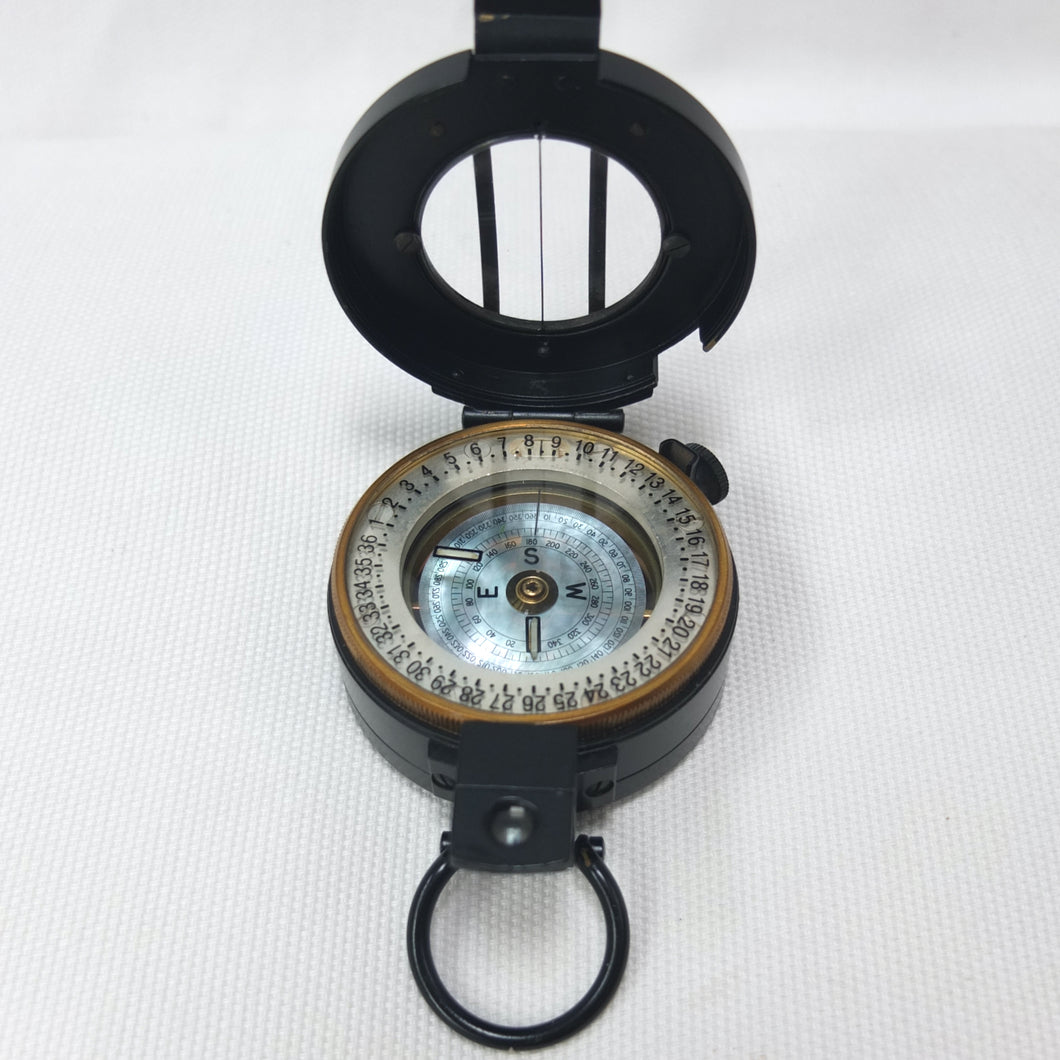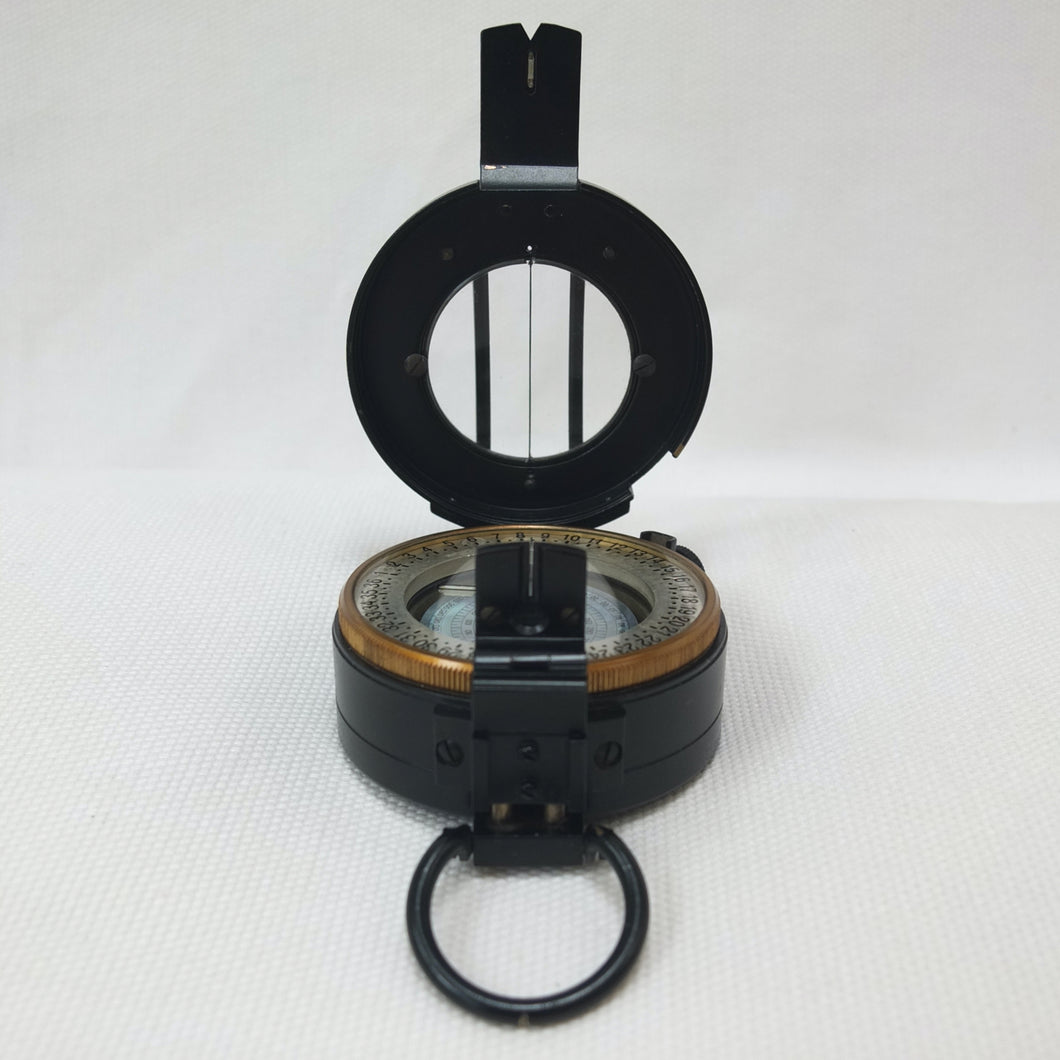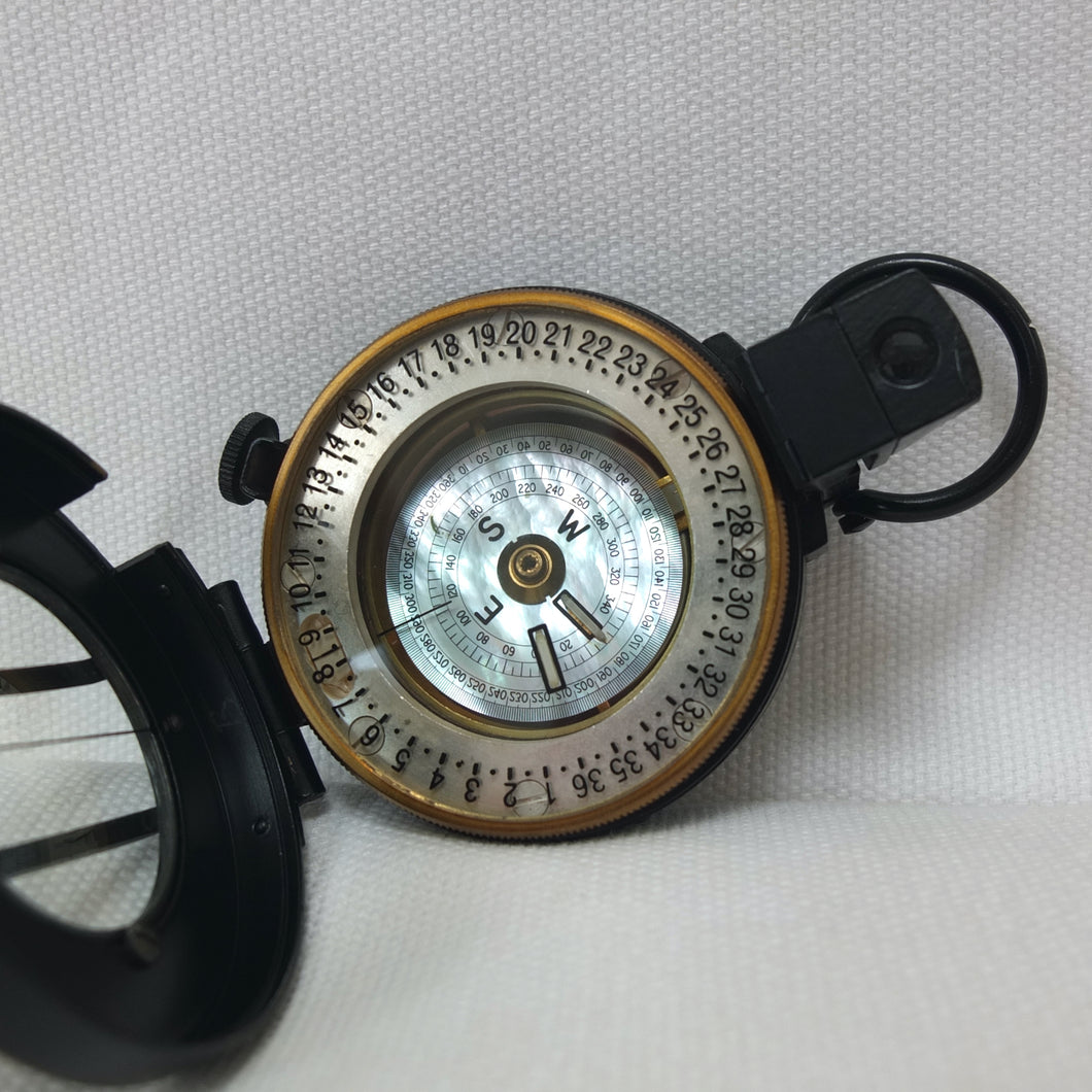 The M-72 has a brass case and lid, mother of pearl compass card, prism sights, and rotating bezel. It is calibrated in degrees. It comes with its original leather case and shoulder strap.