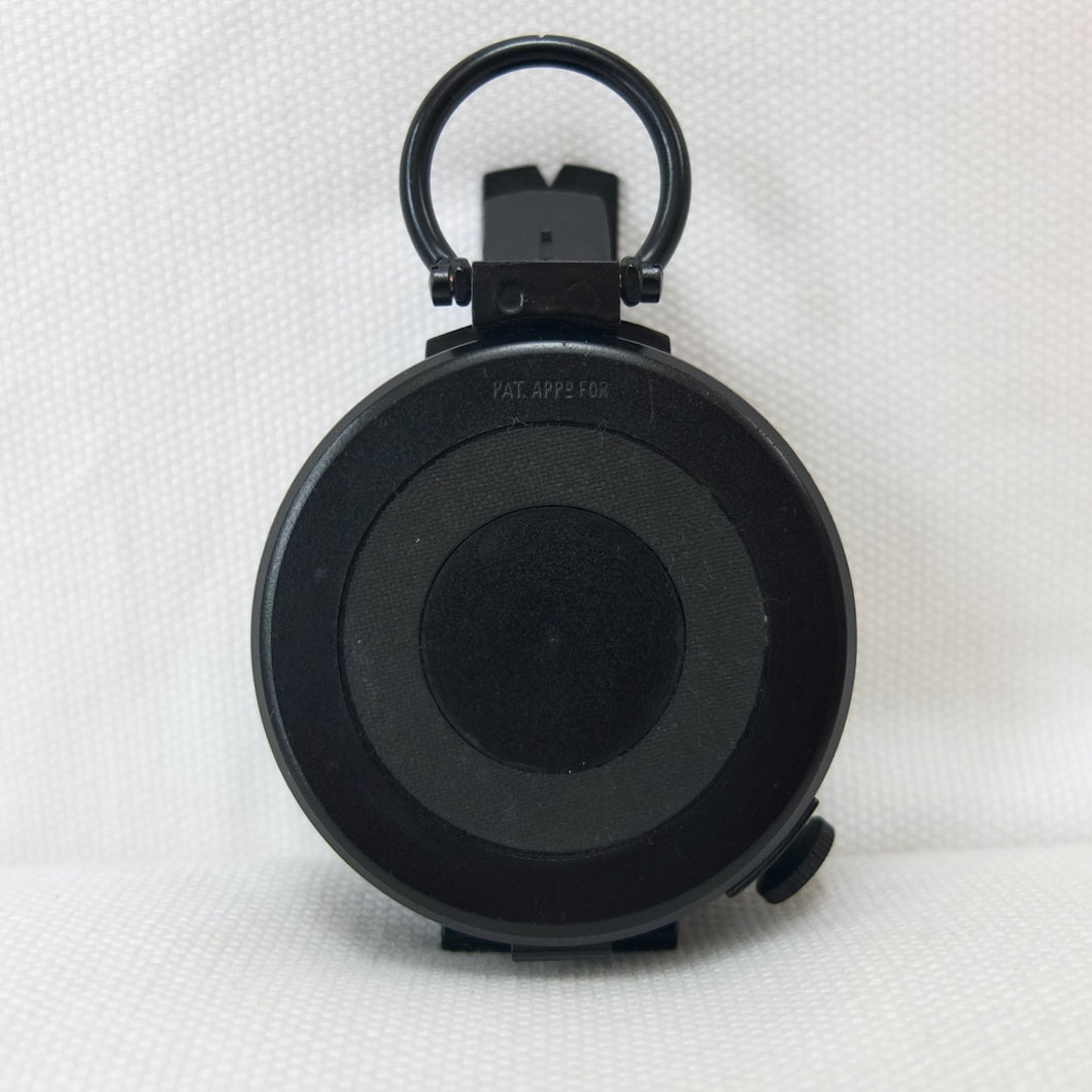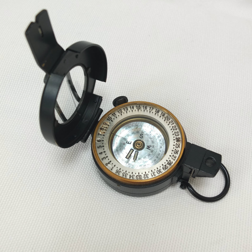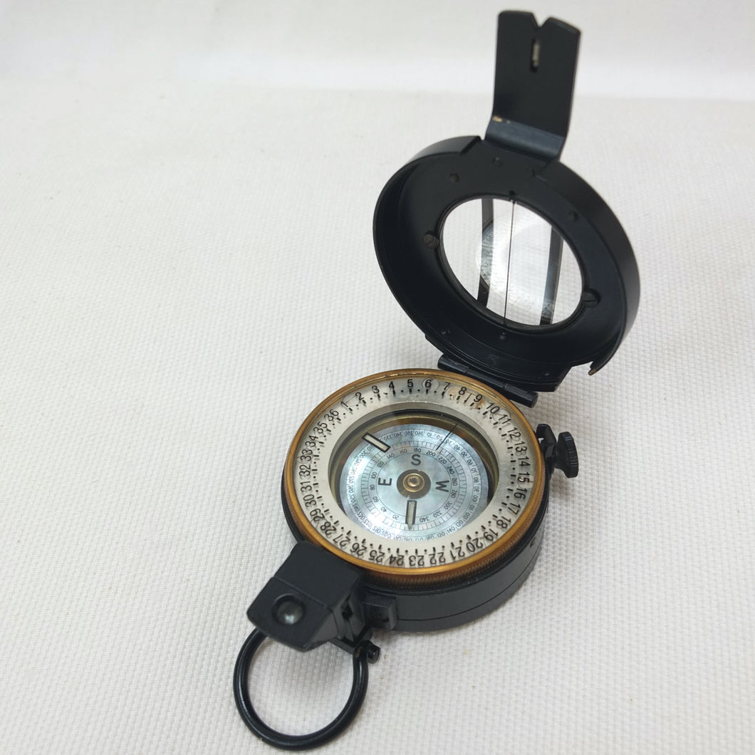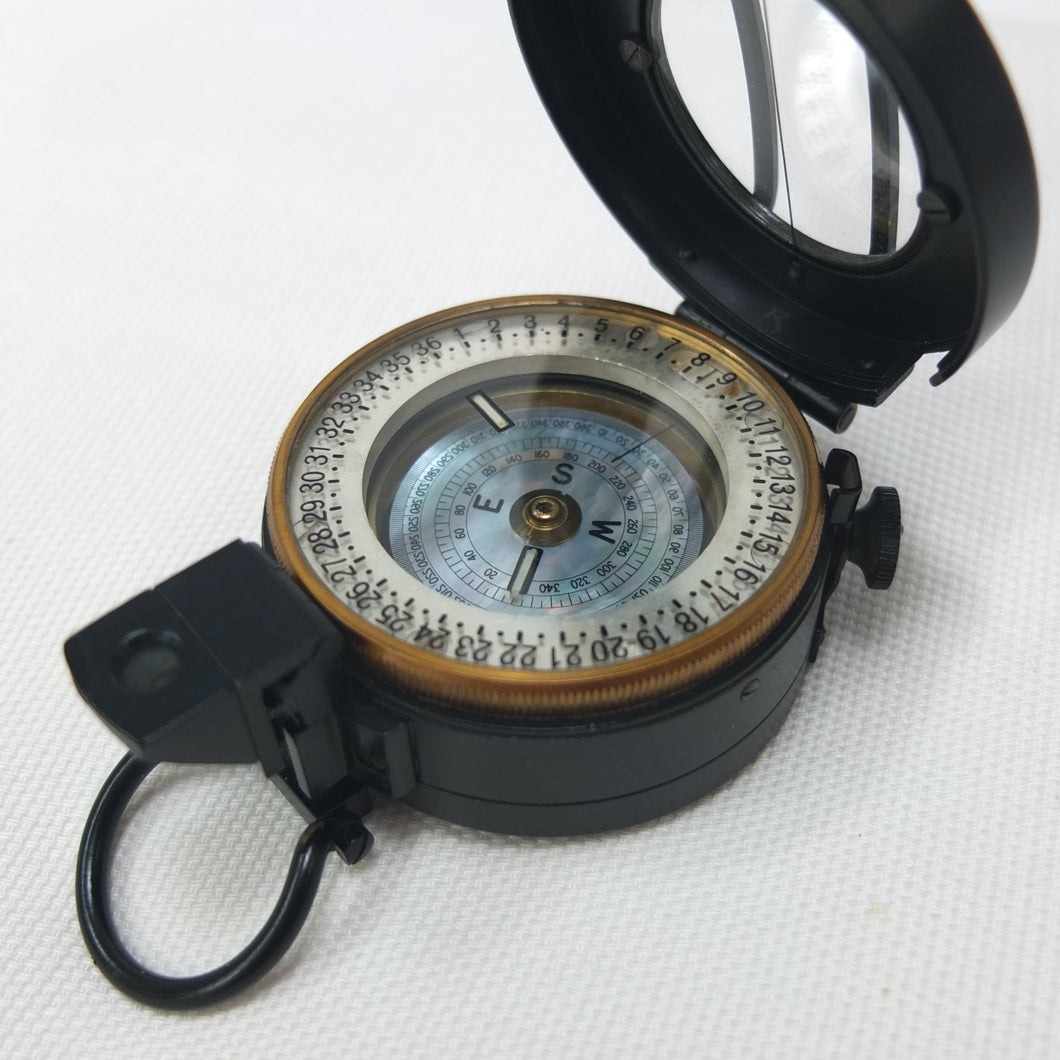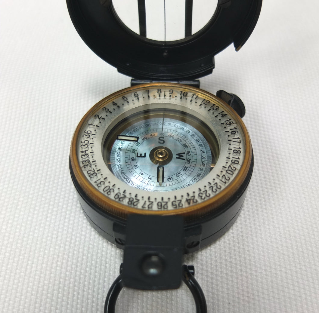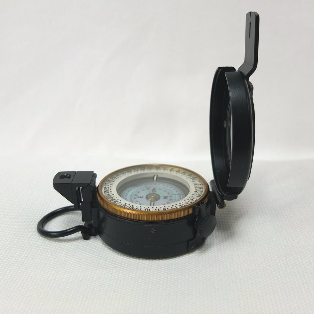 The M-72 has a brass case and lid, mother of pearl compass card, prism sights, and rotating bezel. It is calibrated in degrees. It comes with its original leather case and shoulder strap.