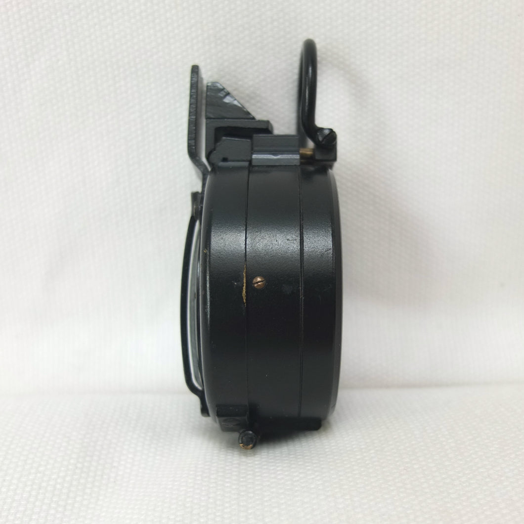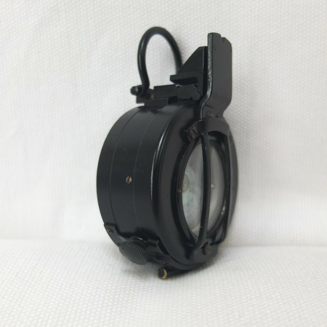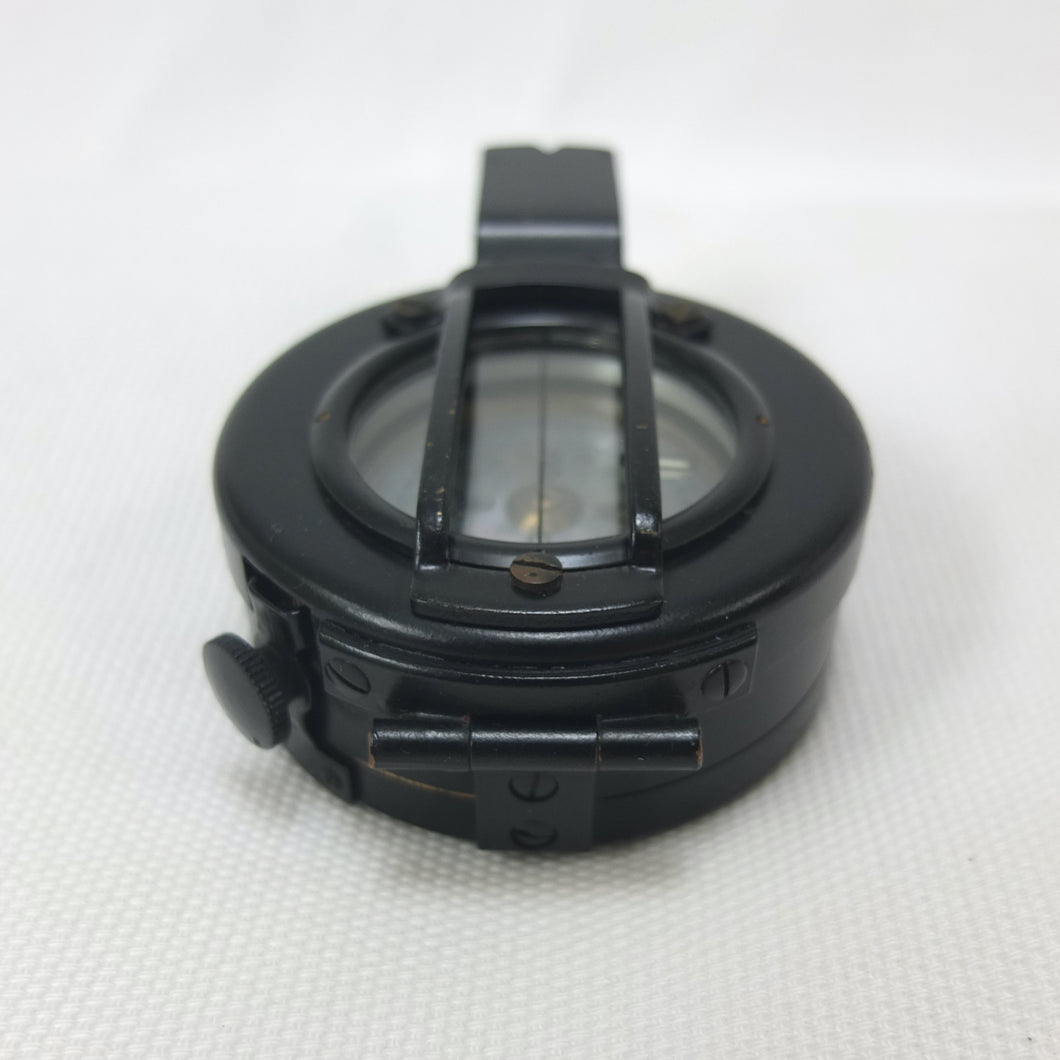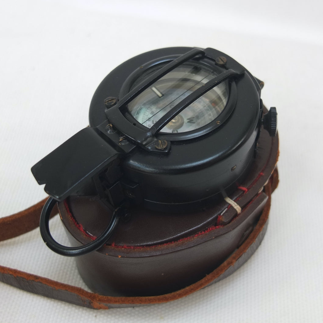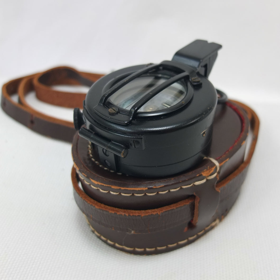 The compass is in very good condition, in full working order, and finds North very well. There are no bubbles in the fluid. There is some very minor wear to the black painted finish of the brass case. The luminous night lights have now expired and would need to be renewed if the compass was to be used in total darkness. The leather case is in very good condition, with some wear to the shouder strap.