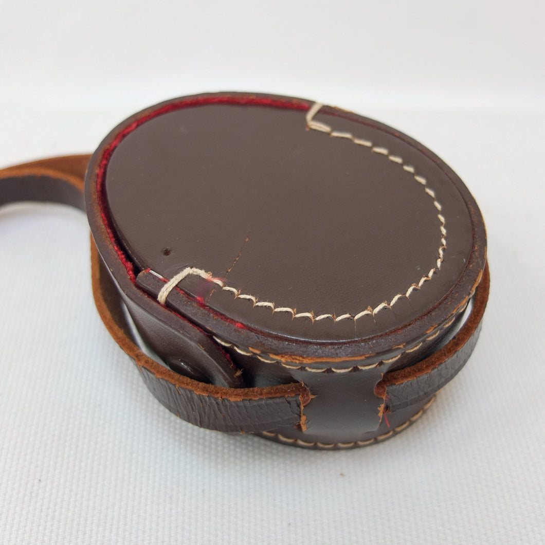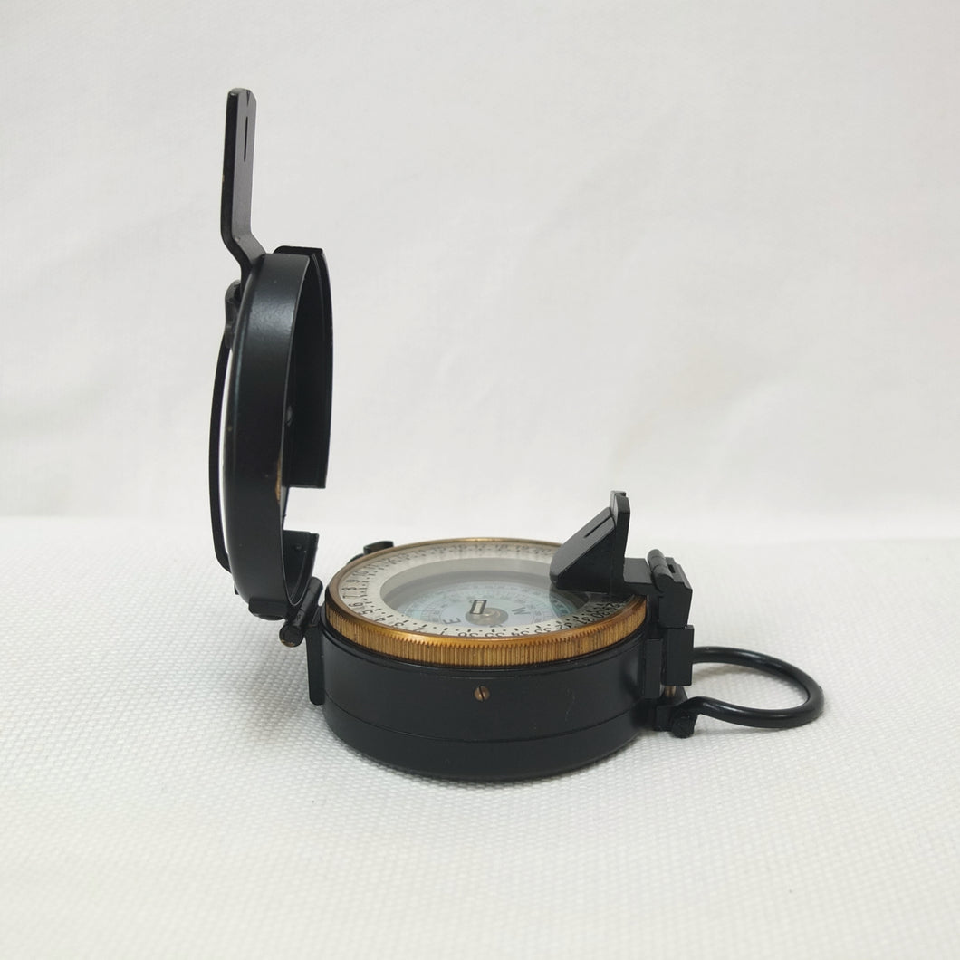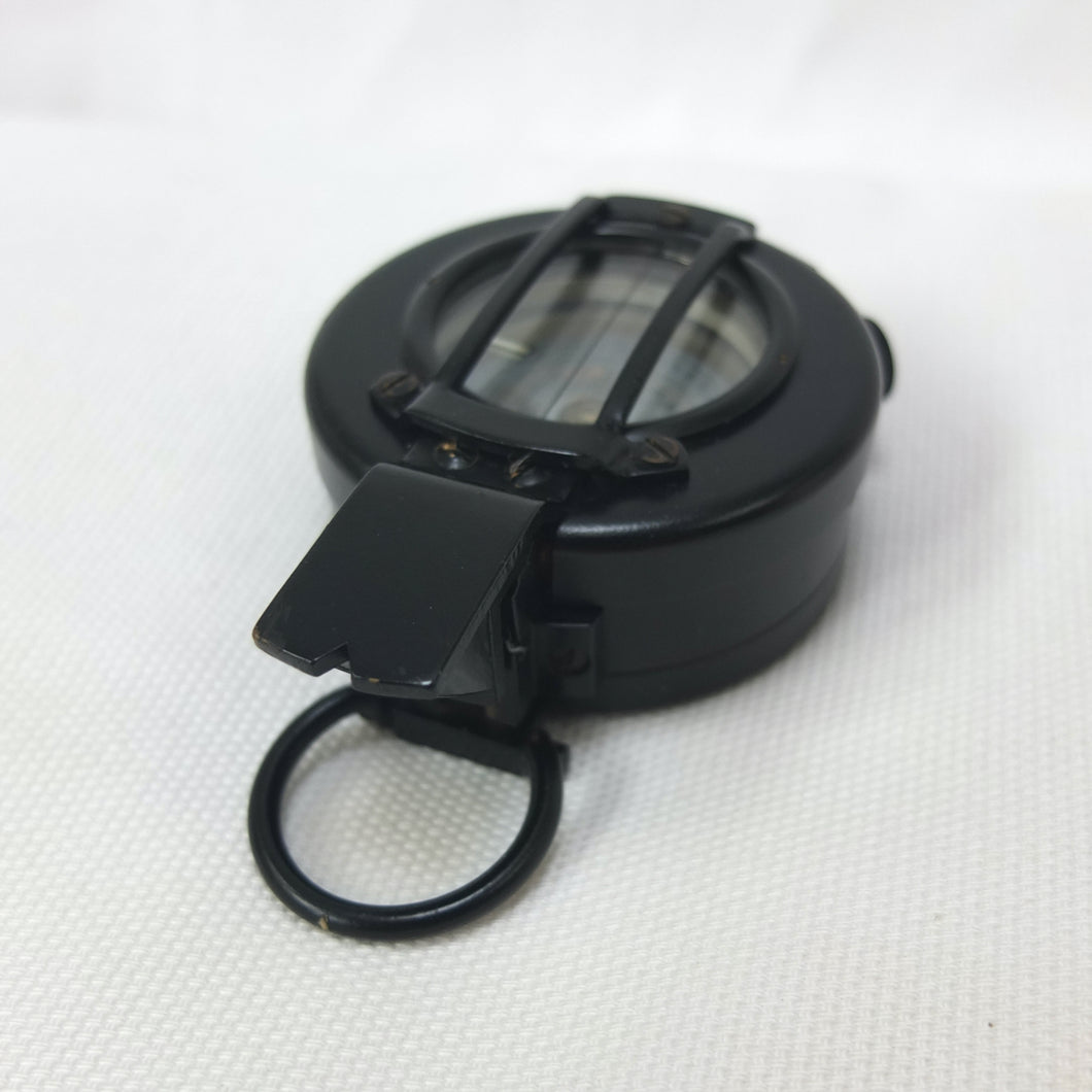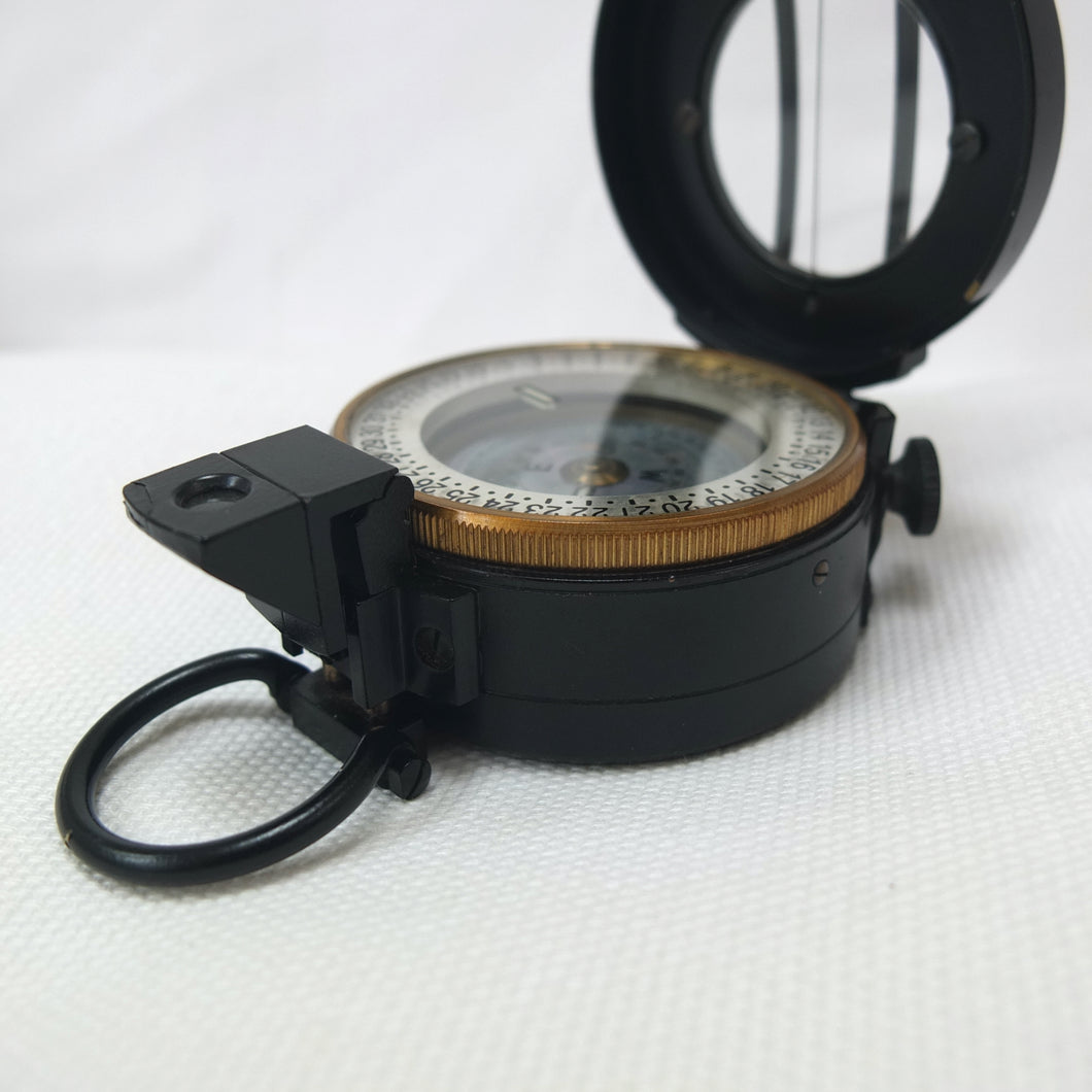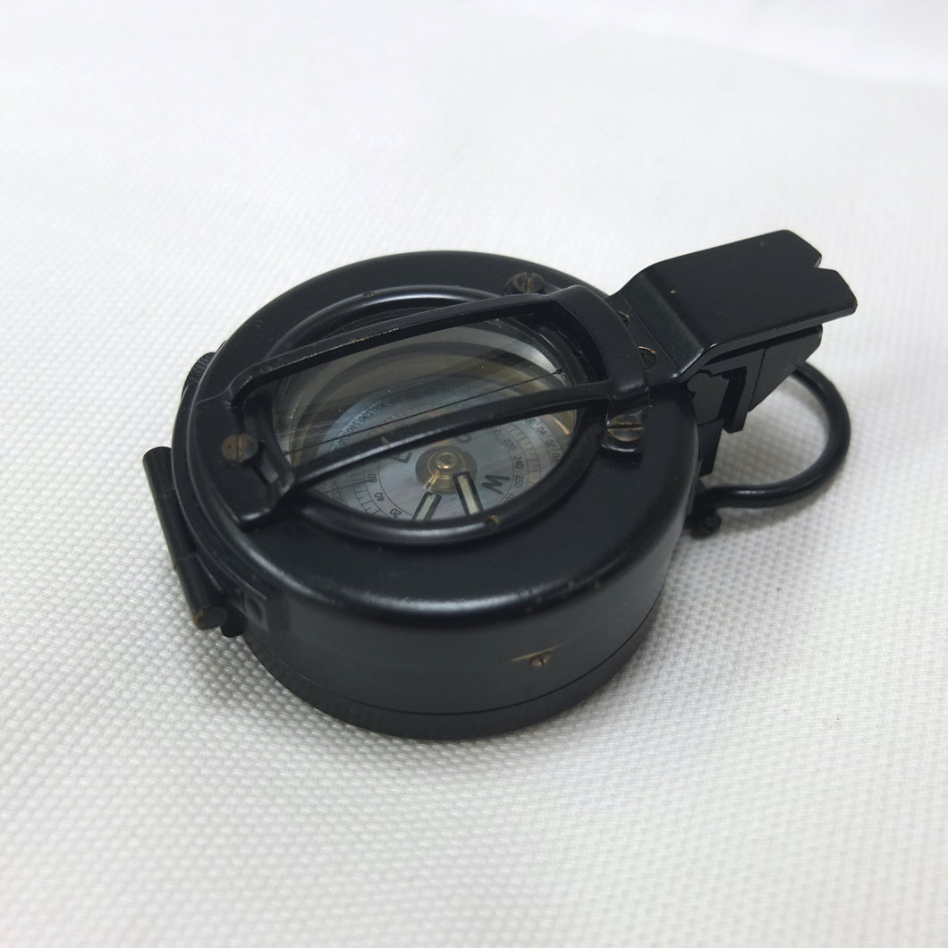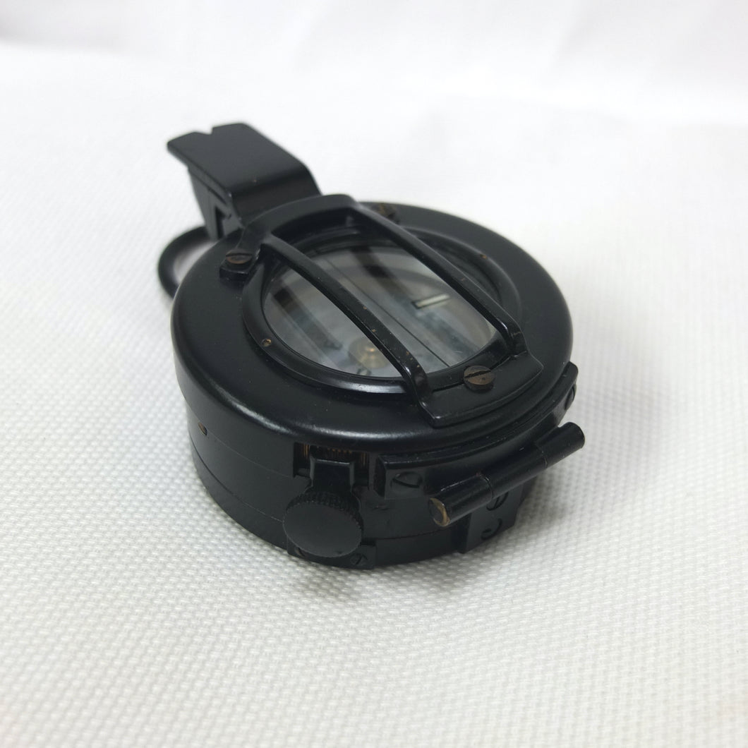 The compass is in very good condition, in full working order, and finds North very well. There are no bubbles in the fluid. There is some very minor wear to the black painted finish of the brass case. The luminous night lights have now expired and would need to be renewed if the compass was to be used in total darkness. The leather case is in very good condition, with some wear to the shouder strap.