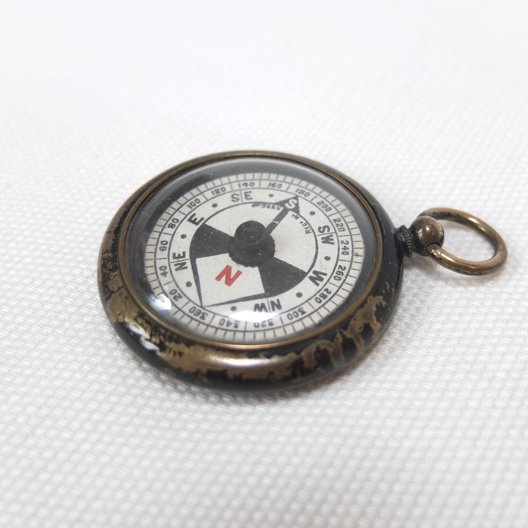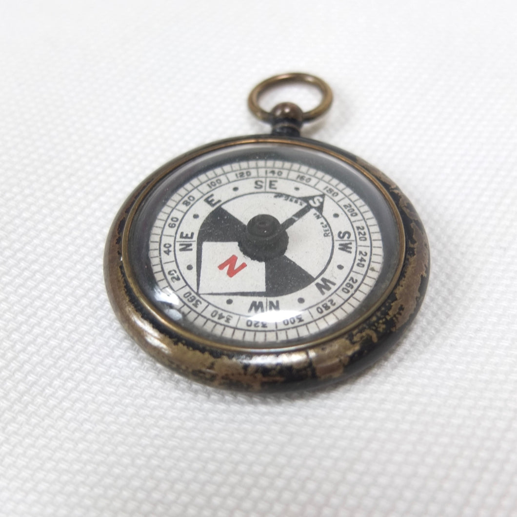 A brass cased Francis Barker & Son pocket compass, dating from c.1900. Although there are no maker's marks, this compass is the 'Registered Dial, No. 355639' model which was made by Barker and featured in many Barker catalogues from c.1900 until the mid 1920s. Also known as 'The Owl', versions of this design were advertised before WW1 in British military handbooks as a compass suitable 'For NCO's and men'. At the turn of the century it sold for 3 shillings and sixpence. Further details of this Barker compass design can be found in: Trade Mark London (p.199-200) by Paul Crespel, and at the trademarklondon.com website.