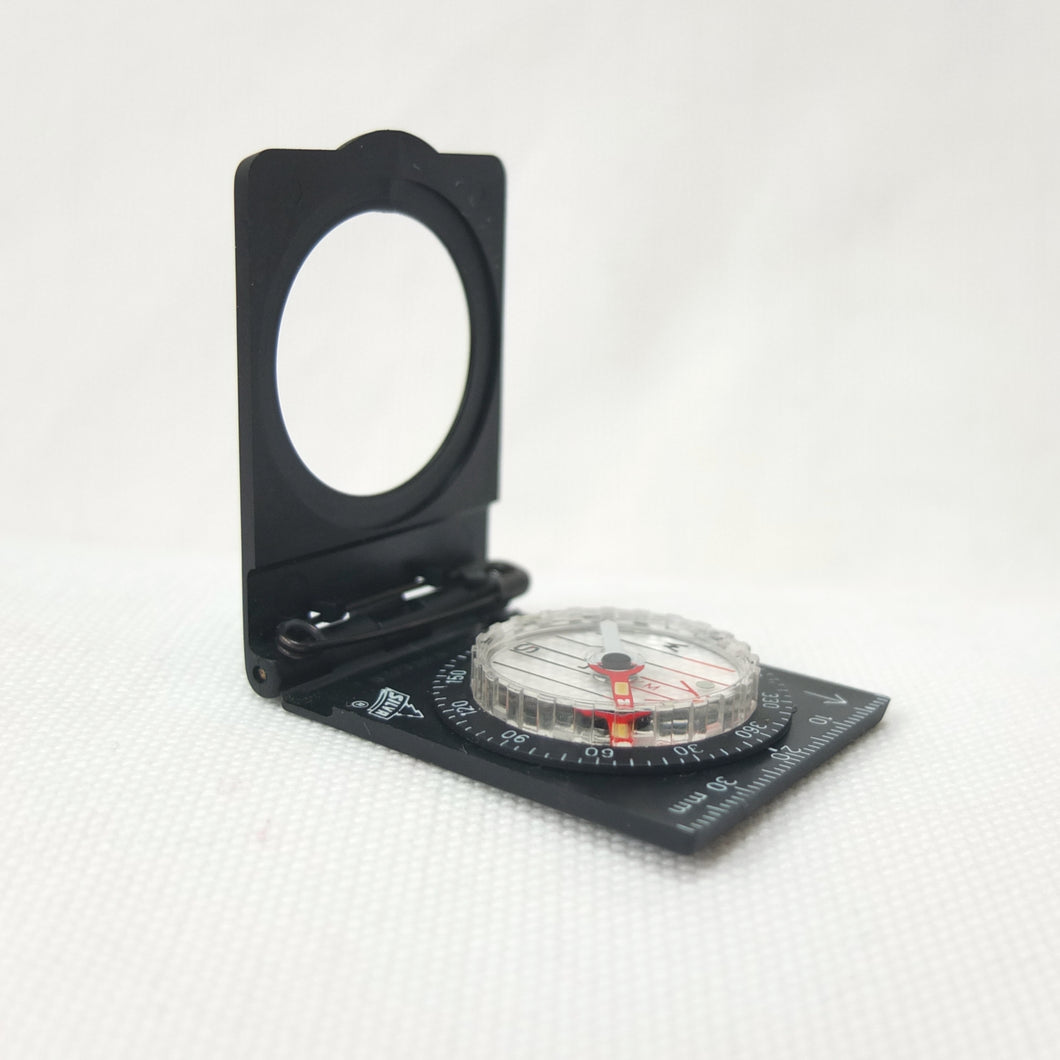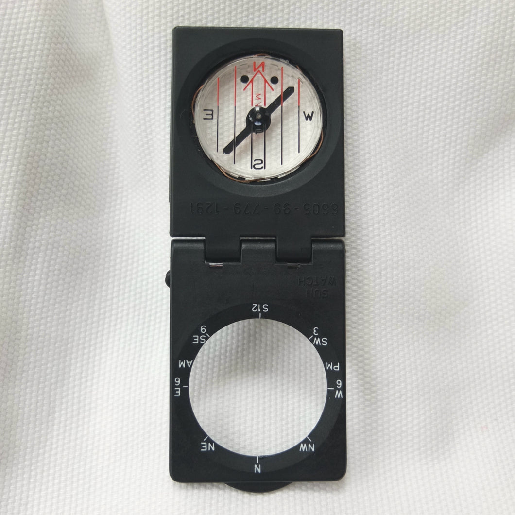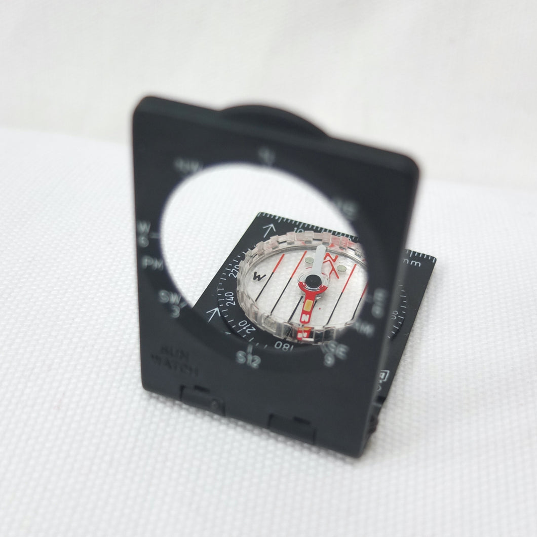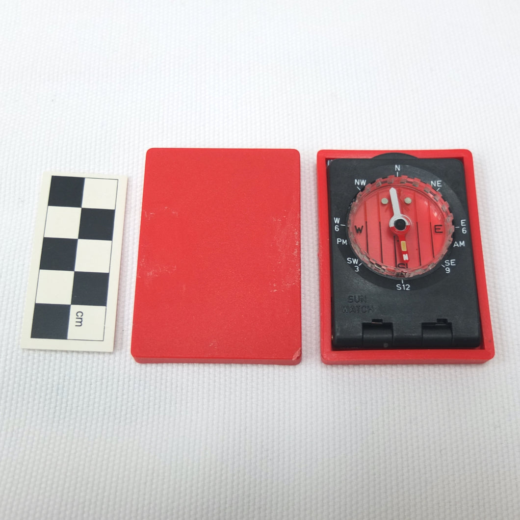 The compass has a black plastic case, liquid-filled capsule, red/white needle with luminous markers, rotating bezel, and a safety-pin to attach it to clothing. The compass also functions as a sunwatch. It comes in its original NATO red plastic box.