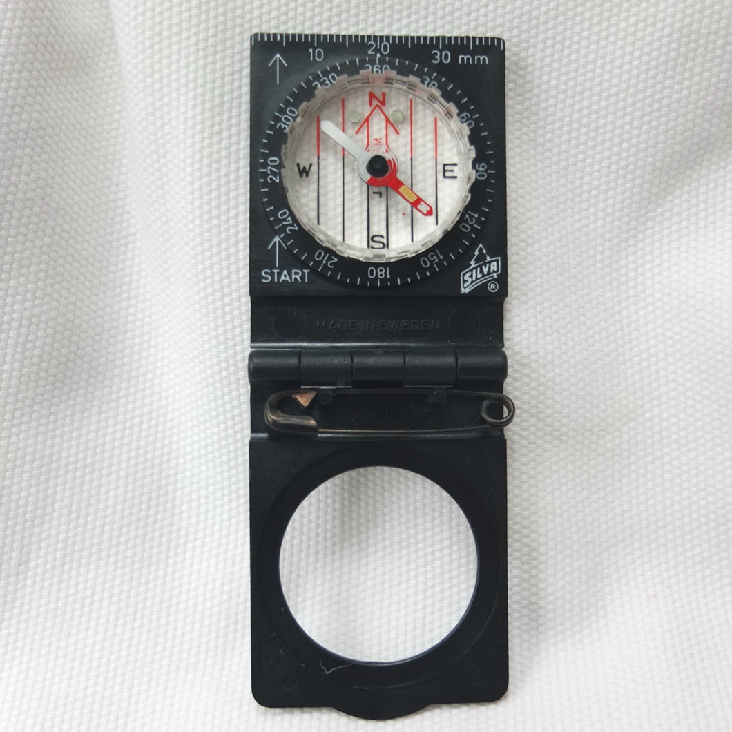 A Silva 'Huntsman' NATO emergency survival compass, made in Sweden, dating from c.1980. It has the NATO stock number 6605-99-779-1291 engraved on the bottom of the compass case. This type of pin-on compass was originally produced by Silva in the 1950's in an aluminium cased version. This later plastic bodied version is a NATO military compass, issued to armed forces as part of their emergency survival kit. Mostly issued to fighter pilots and aircrew, it was widely used by the German Bundeswehr and air force. In the 1980's pilots flying Phantom and Tornado jet fighters carried these alongside other emergency items in a lifejacket pocket. This type of survival compass was also used by British armed forces, although this particular compass was most likely issued to the German armed forces, as the British version usually had a dark green case.